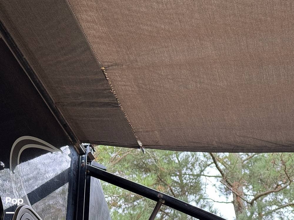 The full-body paint showcases a striking black, silver, charcoal, and deep-blue swirl design that turns heads wherever it parks. Two power slide-outs expand the living and bedroom areas, while the power patio awning offers shade with one-touch ease.