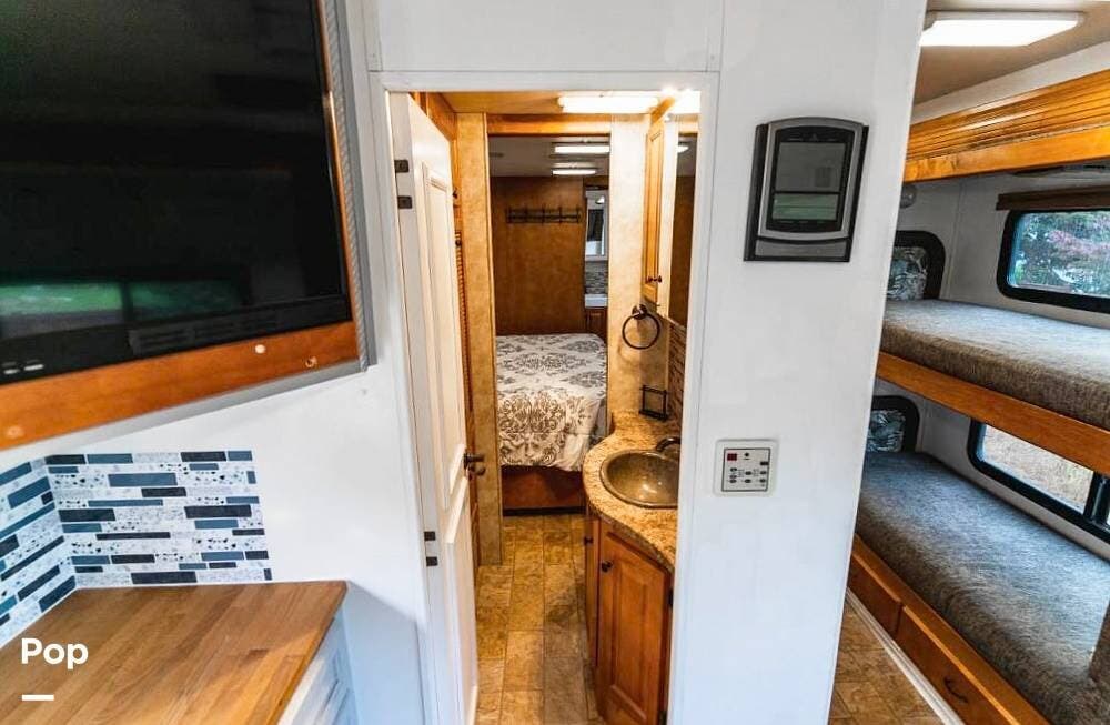 The SuperNova is powered by a 300 HP diesel engine with 530 ft lbs of torque and a 15,000 lb towing capacity. When away from plug-in access, the 8.0kW generator powers the house and its two air conditioners. Solar panel and two solar chargers keep the power storage ready.