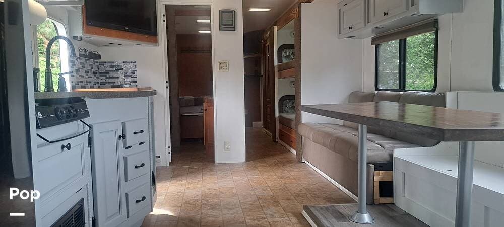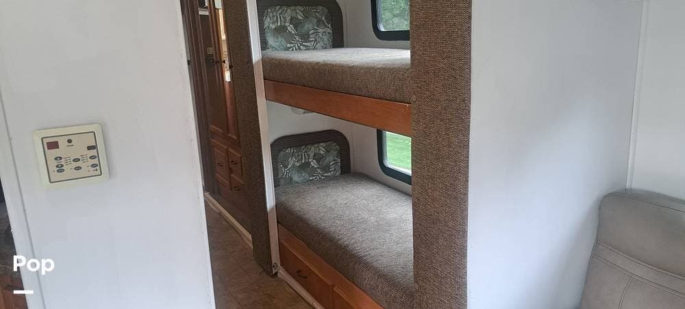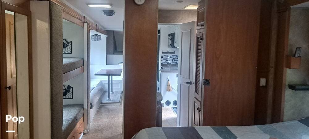 The SuperNova is 40' of travel living and carries sleeping capacity in the King bedroom, the over-cab bed, two stacked bunks, and the sleeper sofa. This one is updated with a dinette and bench seat for meals, relaxing, or a workstation. Lots of cabinet space and a full-size refrigerator/freezer make bringing everything with you on your travels possible.
