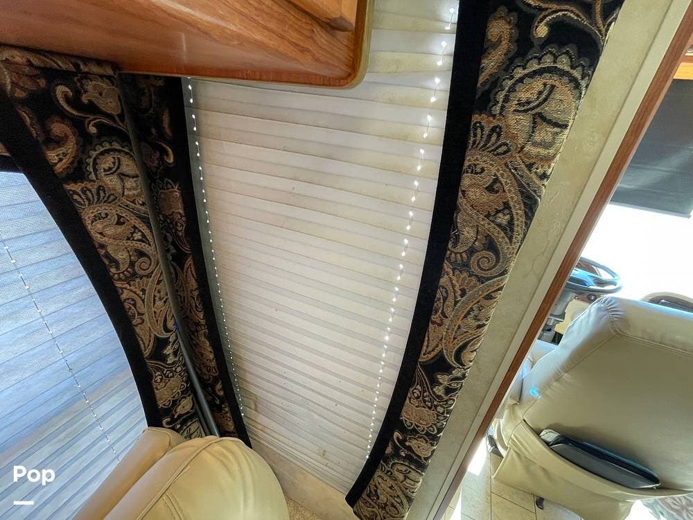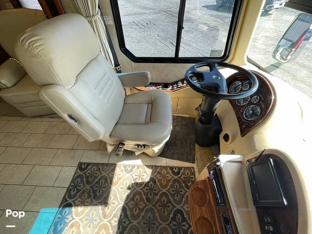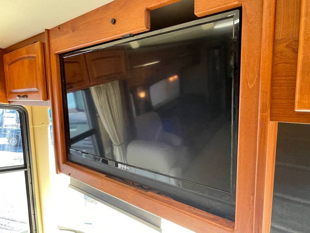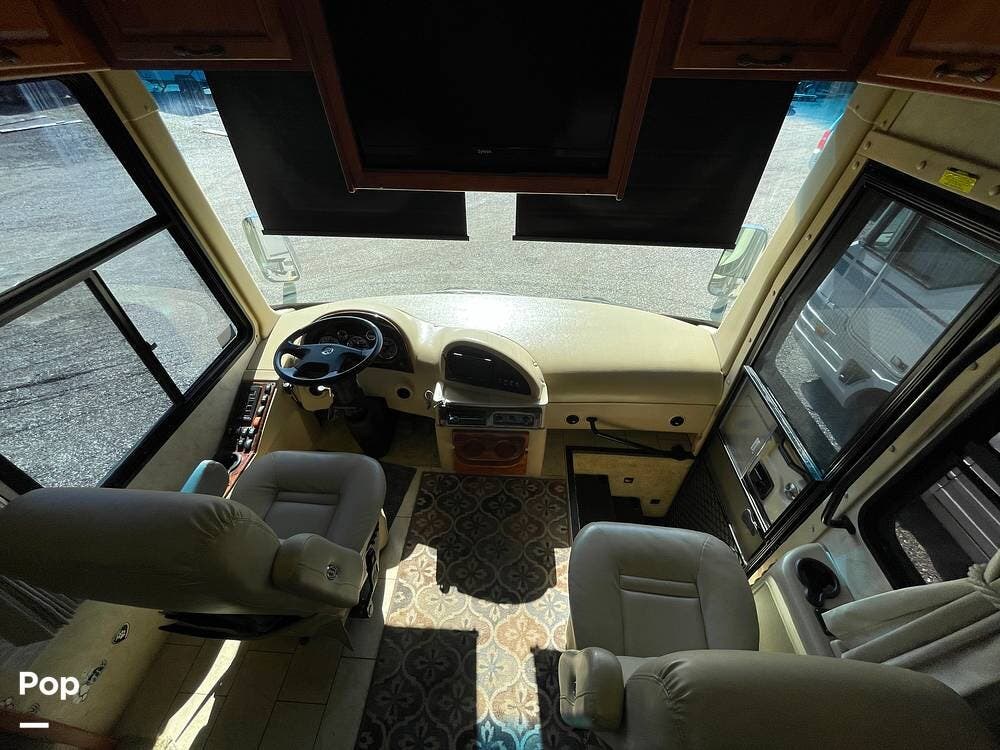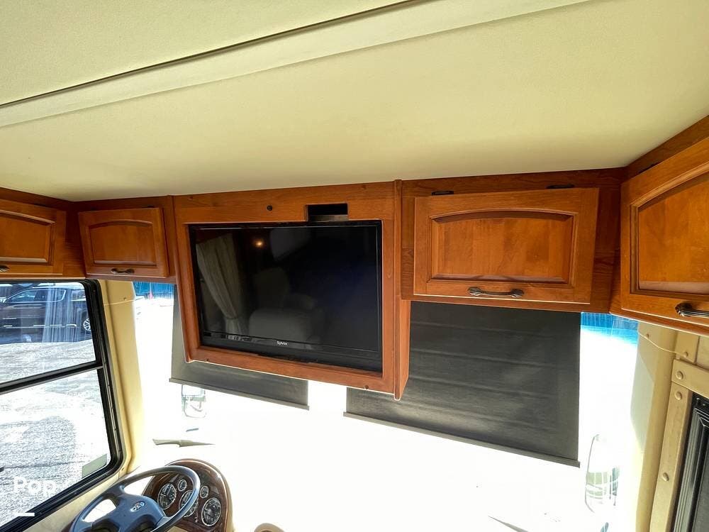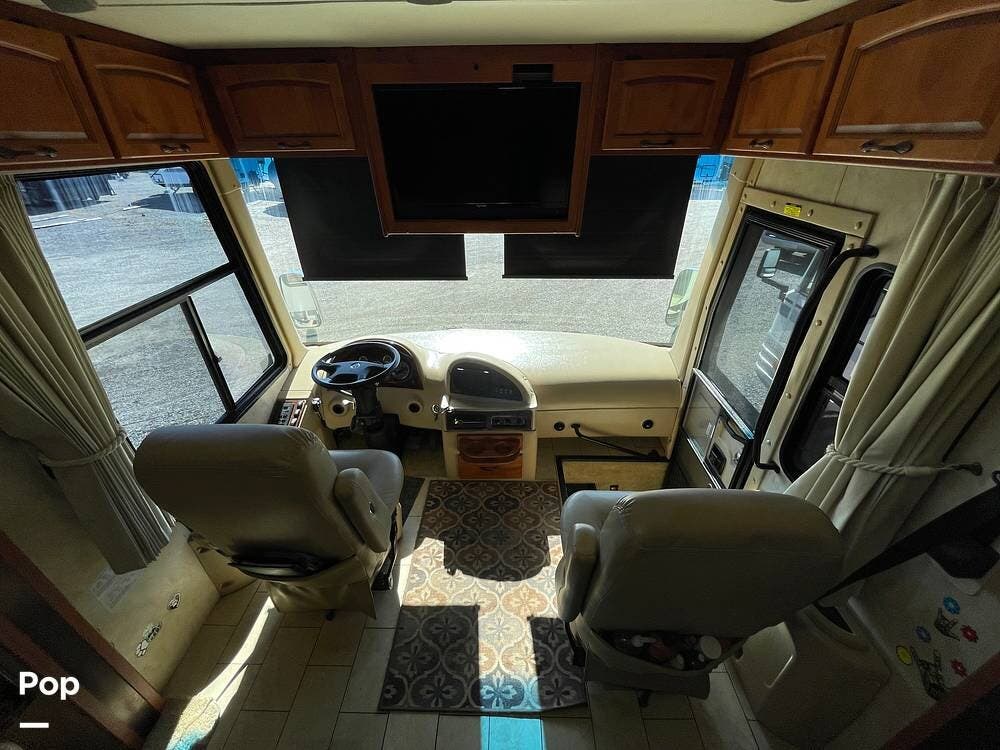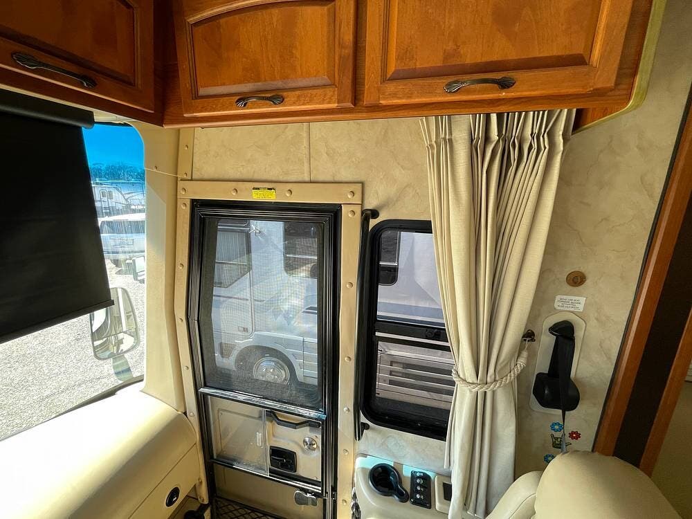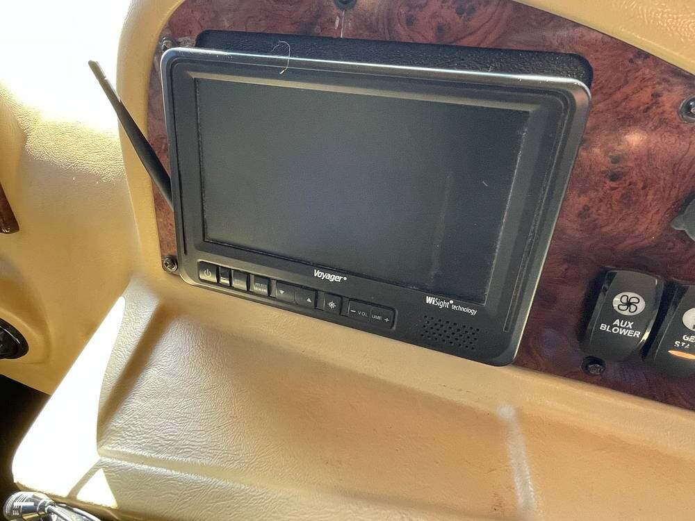 The fiberglass dash with Oxford Burl instrumentation panel hosts a CD player/radio that's Sirius-ready. You'll also find power sunvisors and pull-down side sunshades. A center mounted TV points back towards the living space.