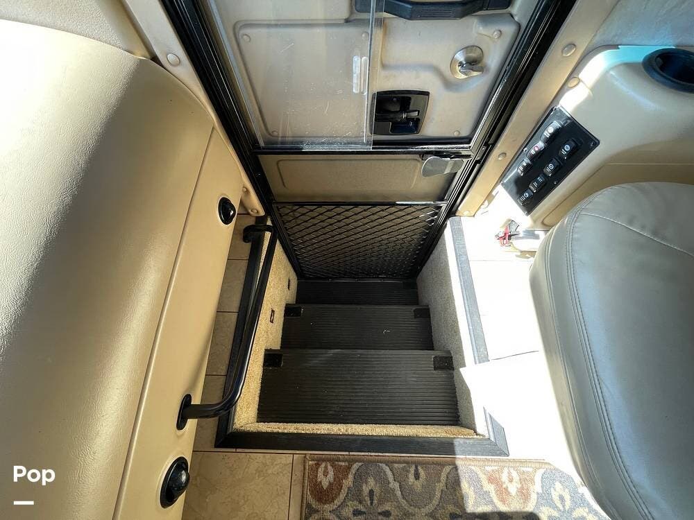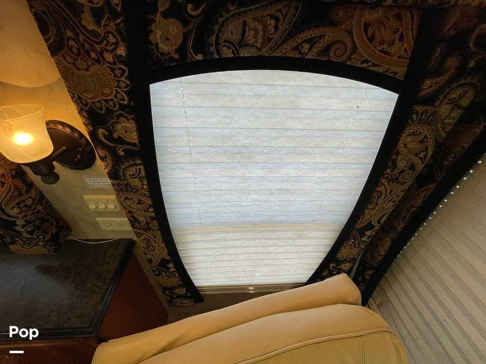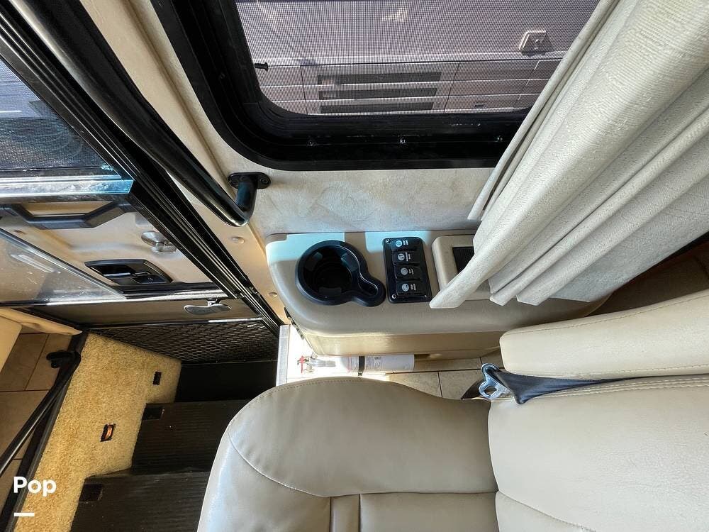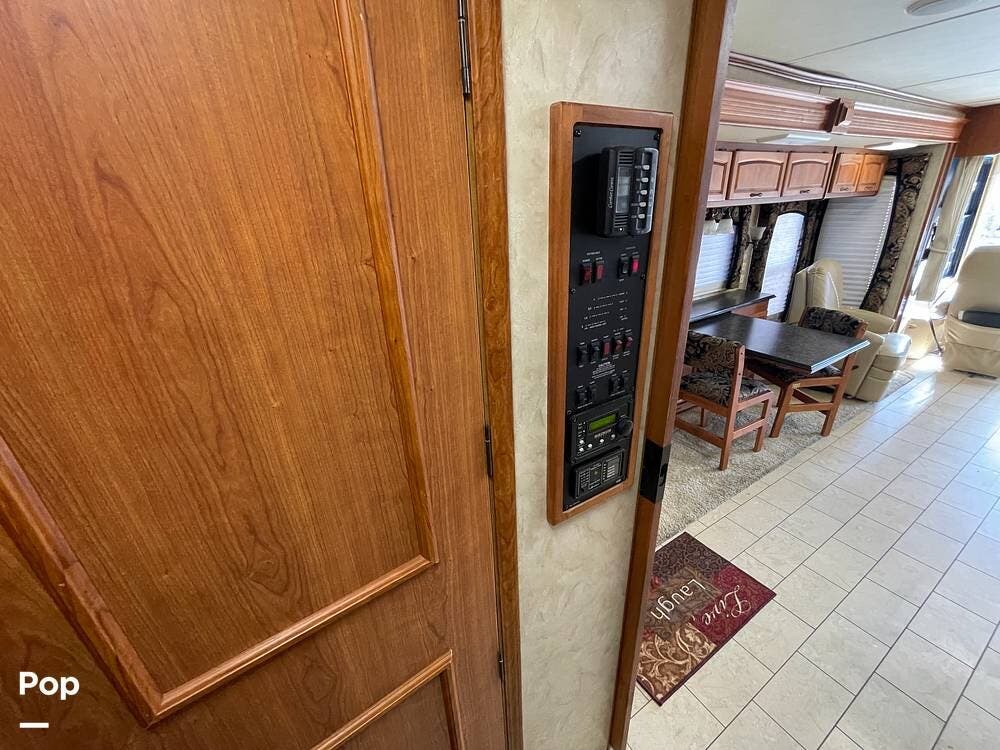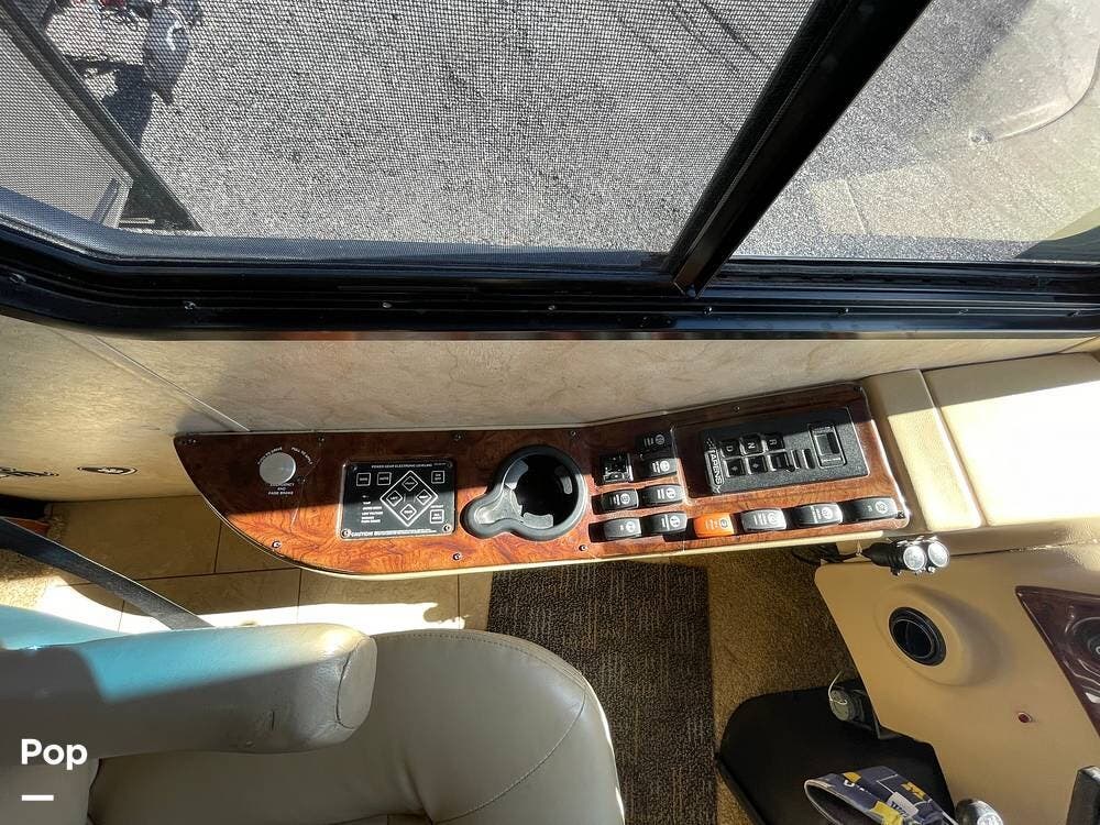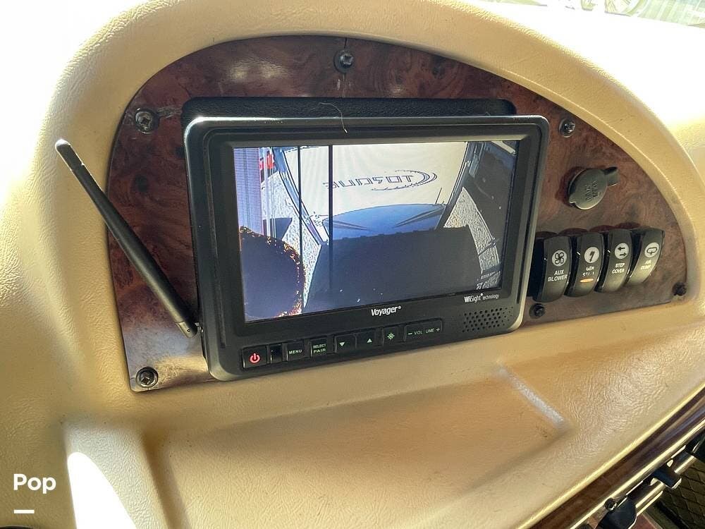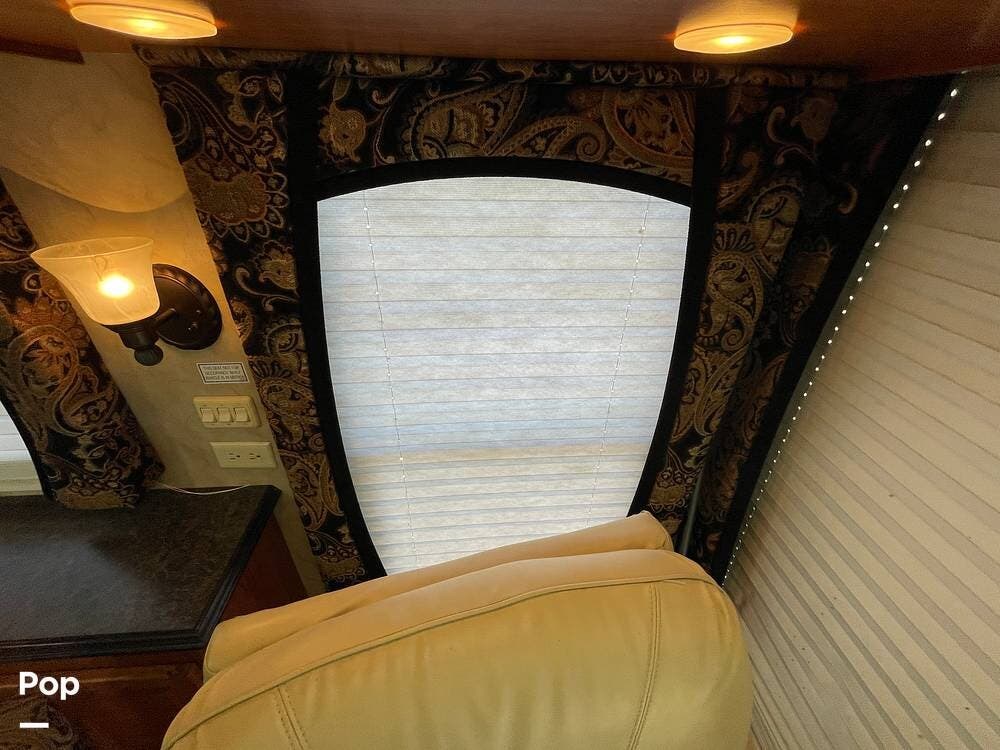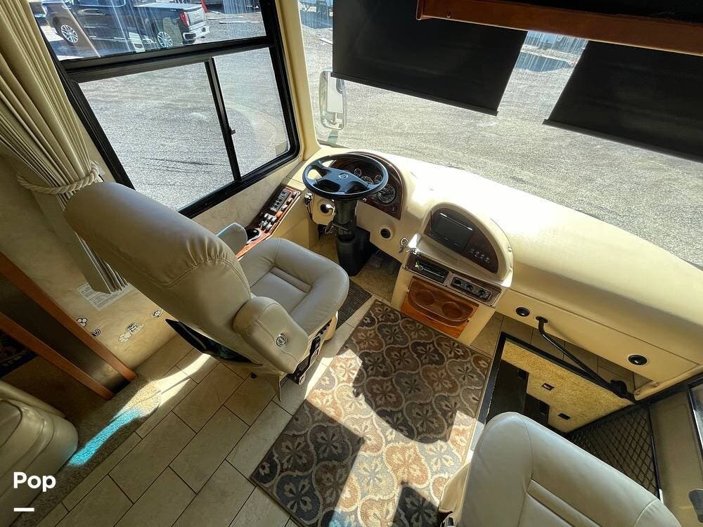 The fiberglass dash with Oxford Burl instrumentation panel hosts a CD player/radio that's Sirius-ready. You'll also find power sunvisors and pull-down side sunshades. A center mounted TV points back towards the living space.