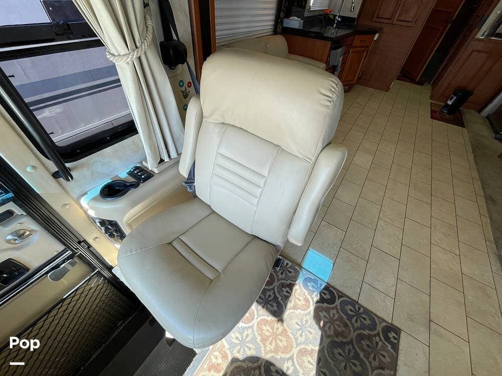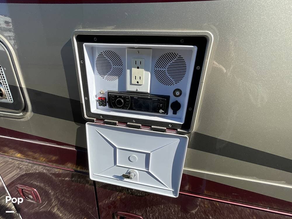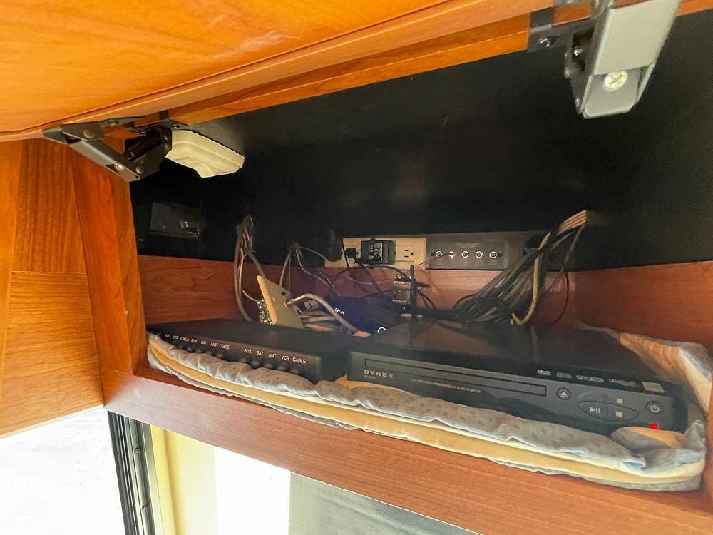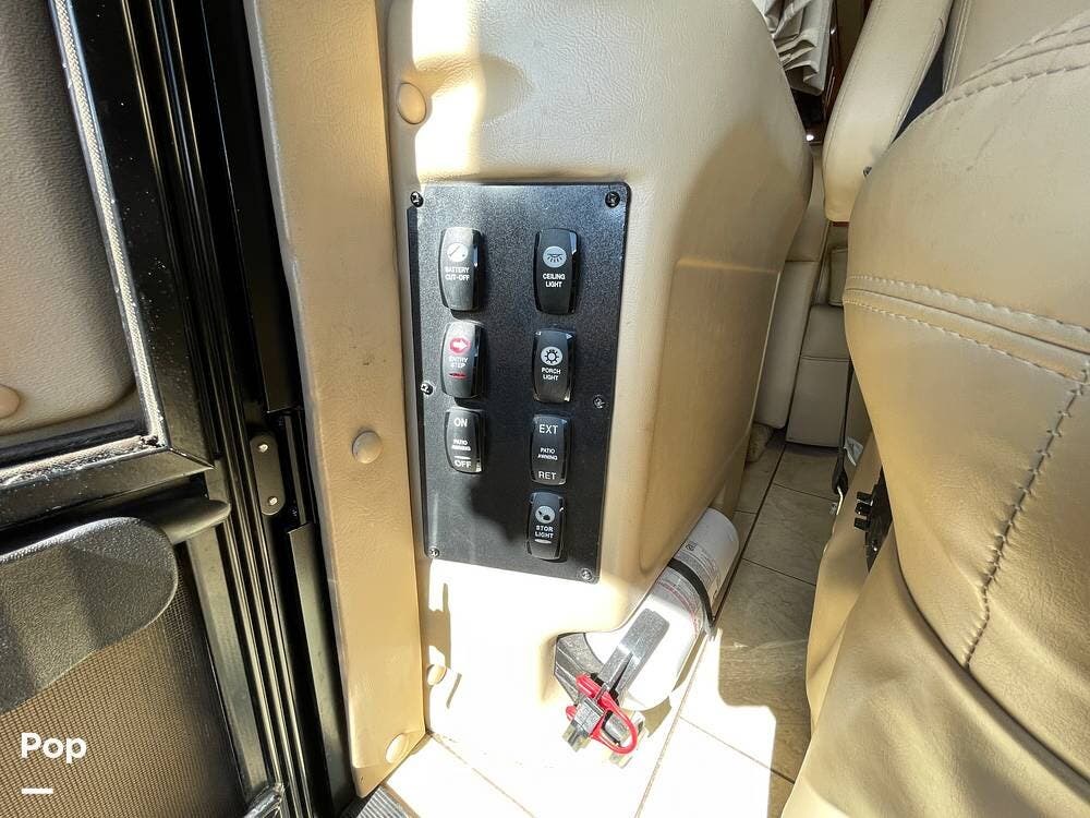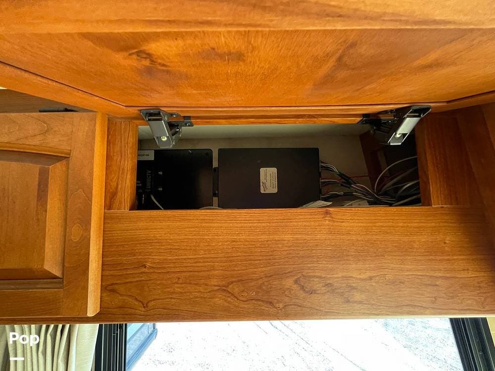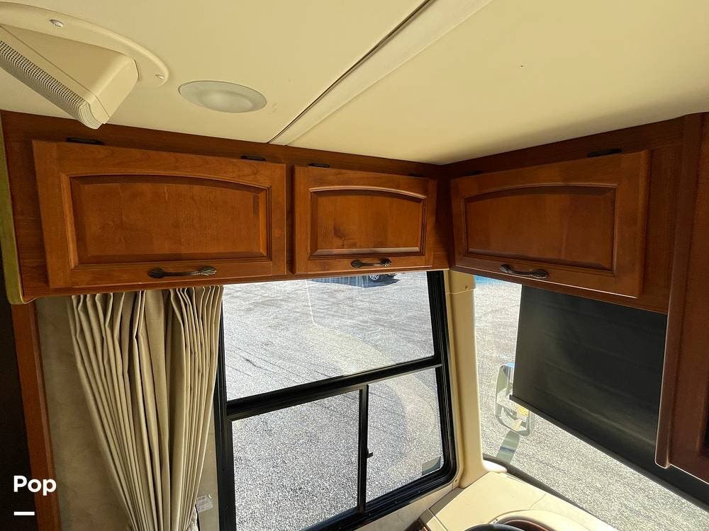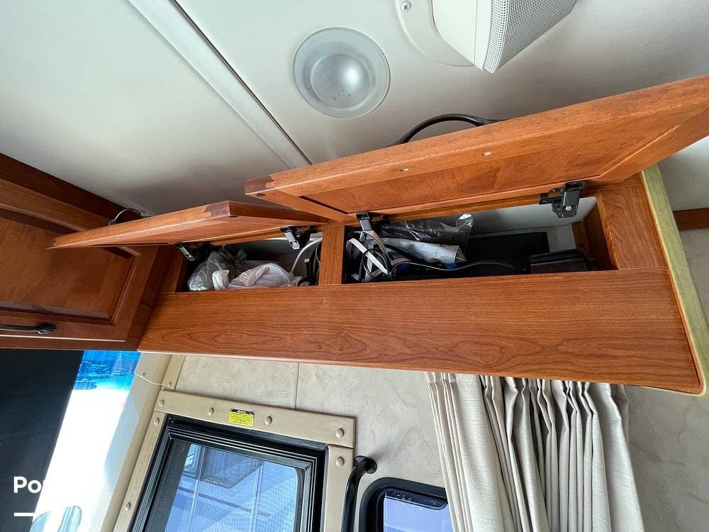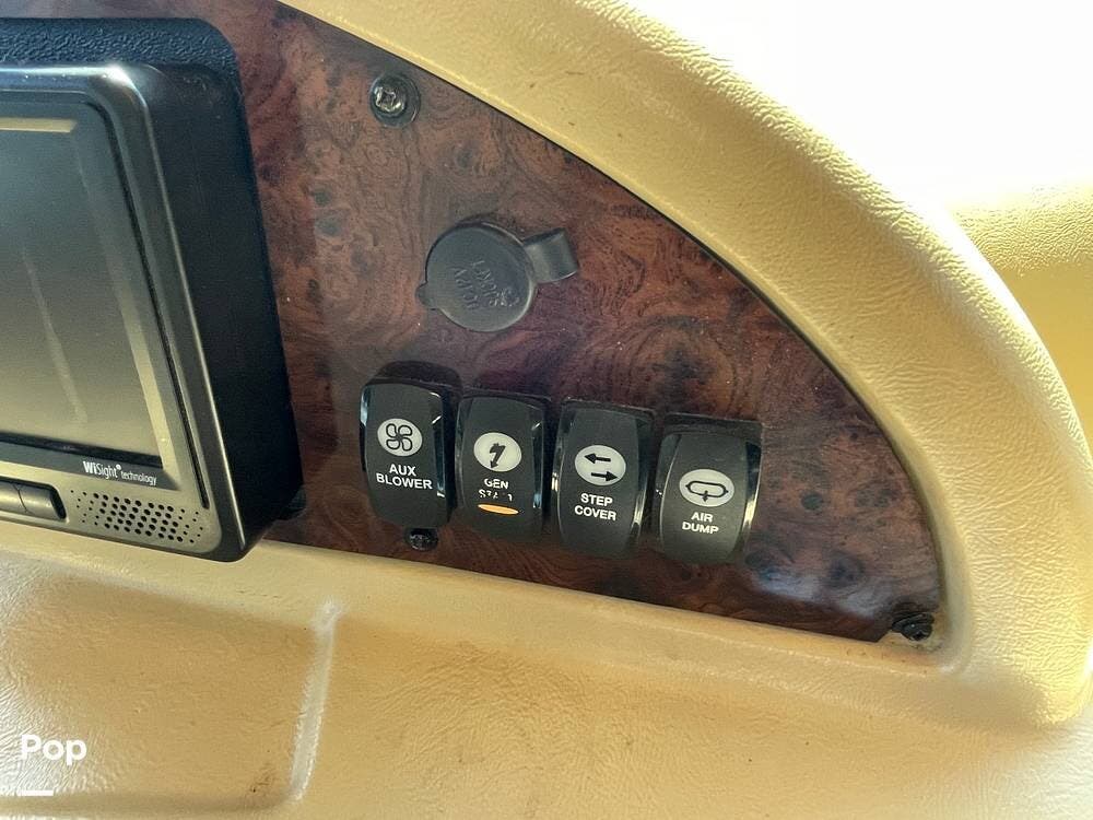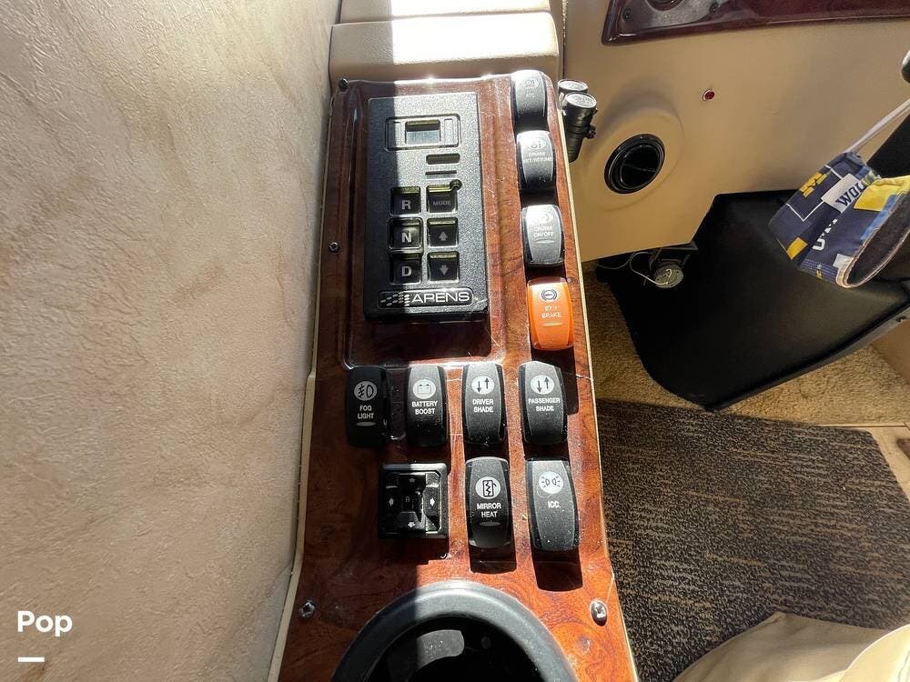 The fiberglass dash with Oxford Burl instrumentation panel hosts a CD player/radio that's Sirius-ready. You'll also find power sunvisors and pull-down side sunshades. A center mounted TV points back towards the living space.