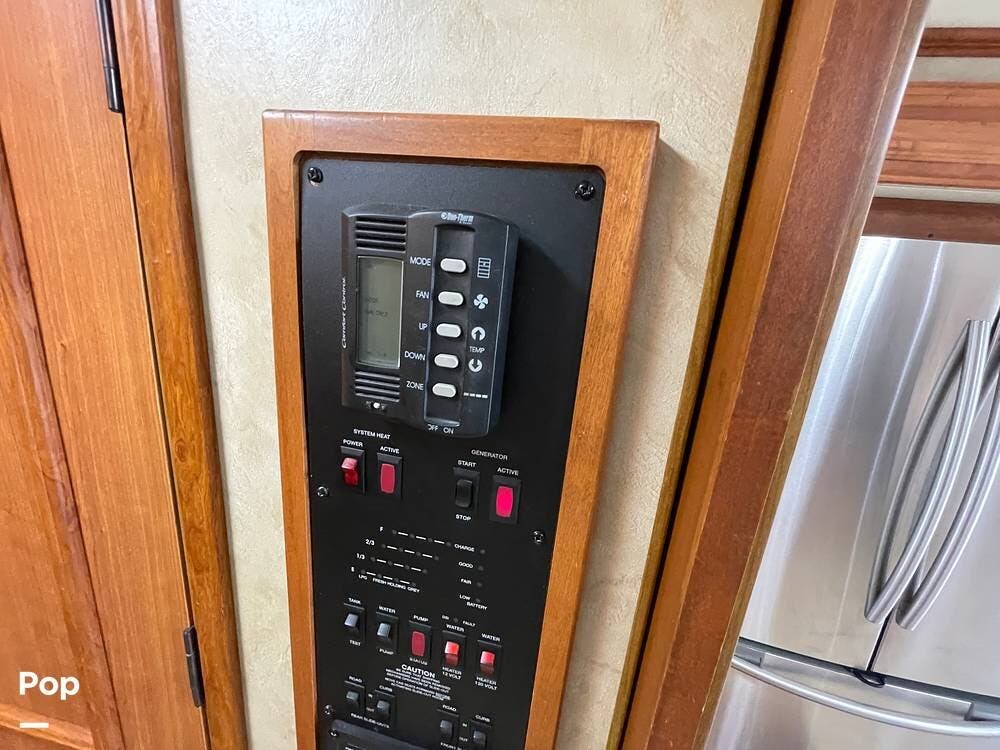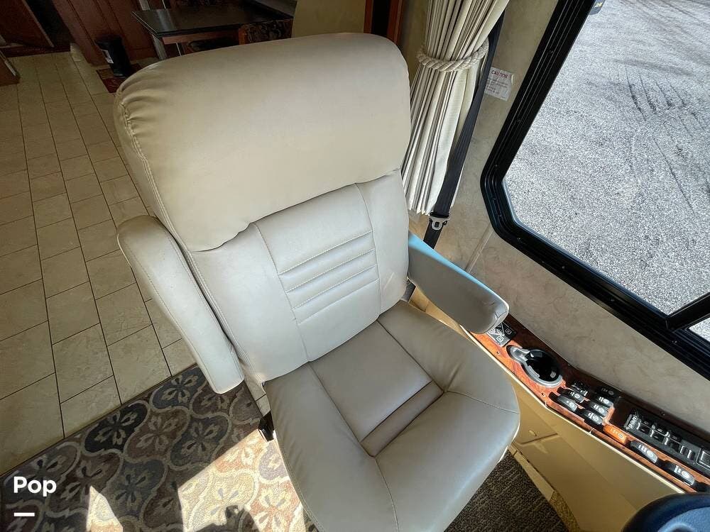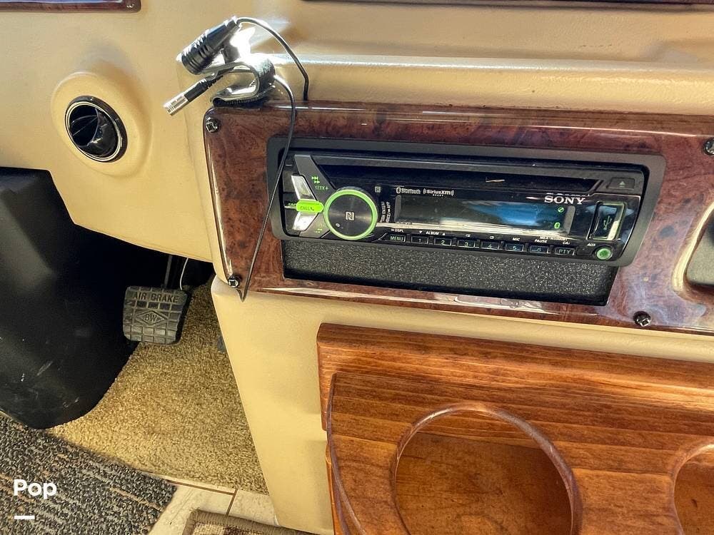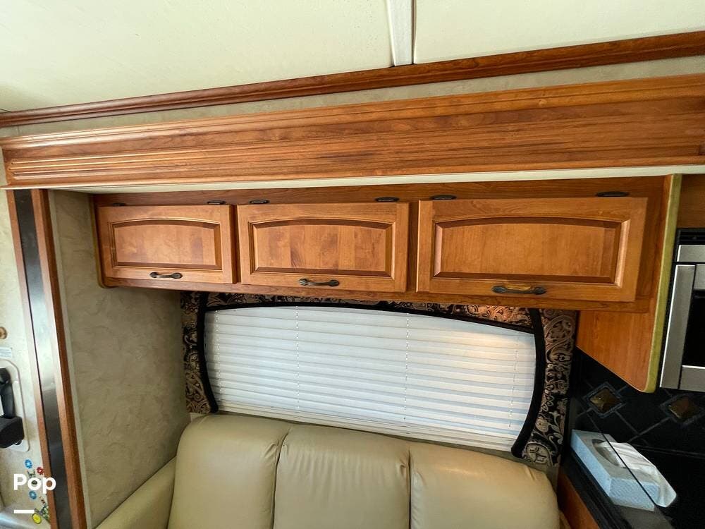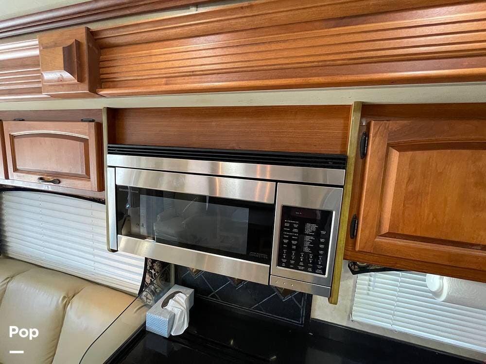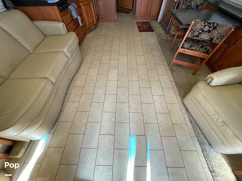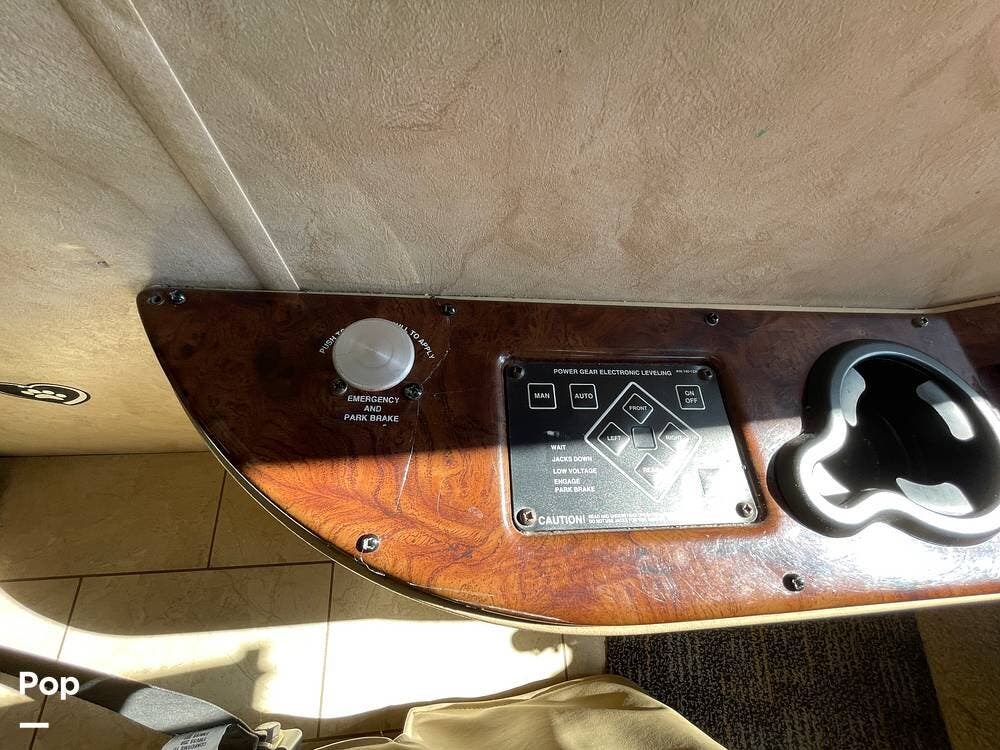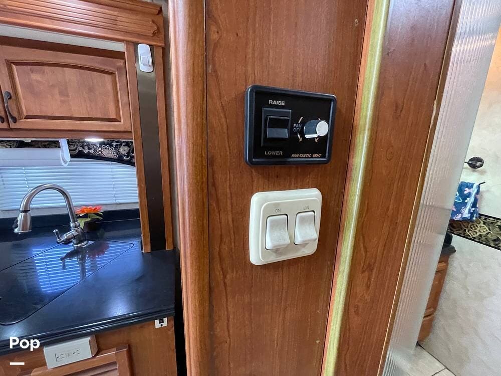 The fiberglass dash with Oxford Burl instrumentation panel hosts a CD player/radio that's Sirius-ready. You'll also find power sunvisors and pull-down side sunshades. A center mounted TV points back towards the living space.
