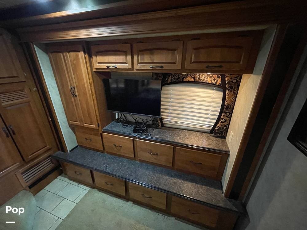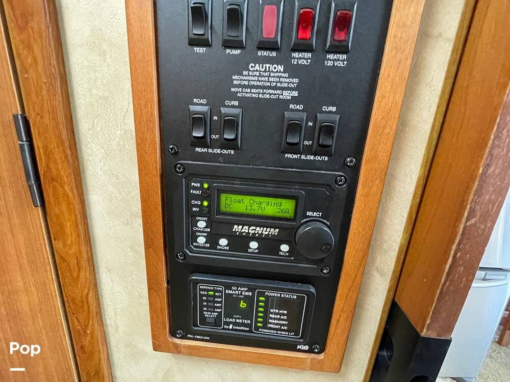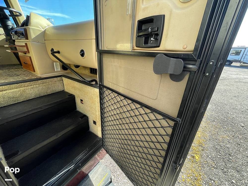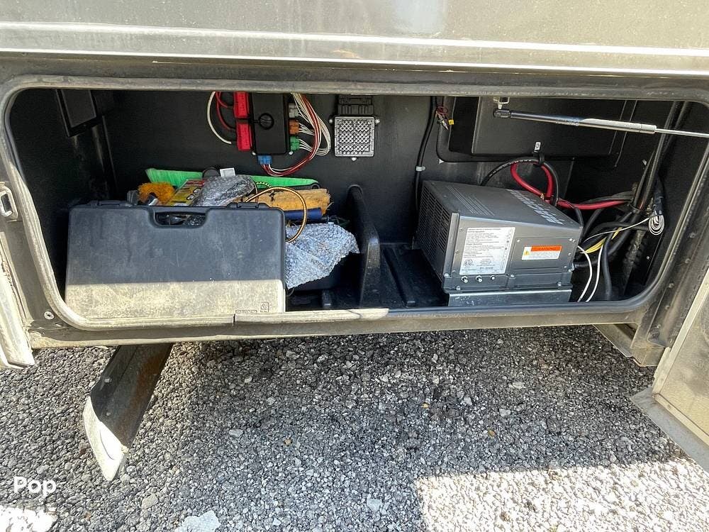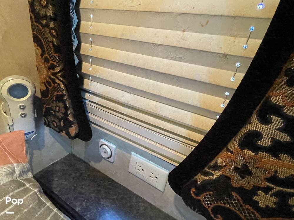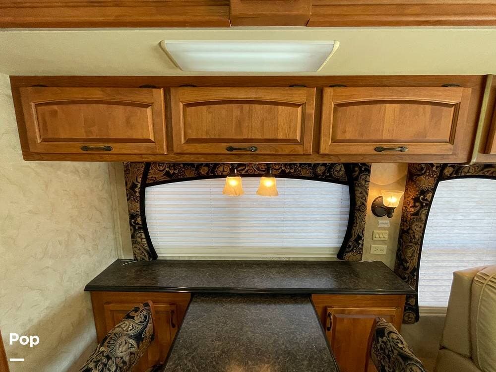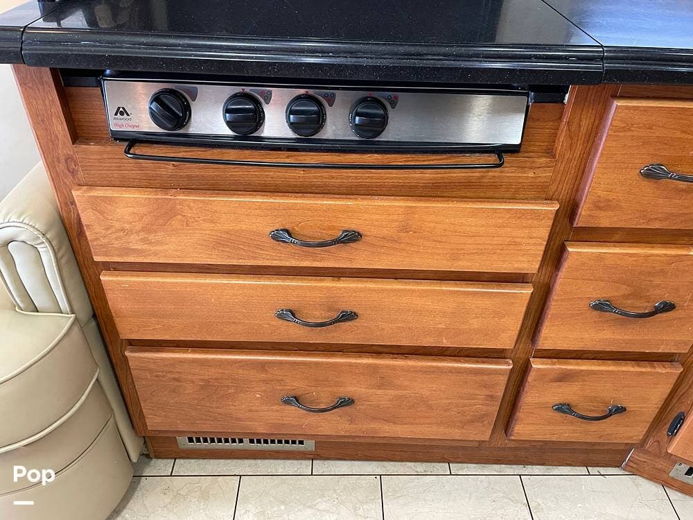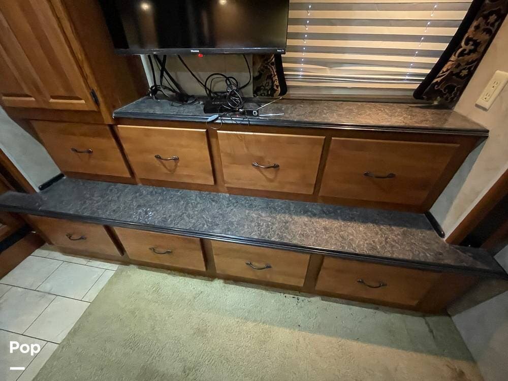 The fiberglass dash with Oxford Burl instrumentation panel hosts a CD player/radio that's Sirius-ready. You'll also find power sunvisors and pull-down side sunshades. A center mounted TV points back towards the living space.