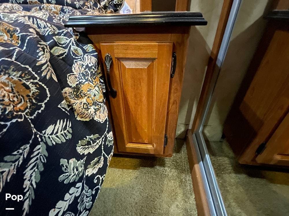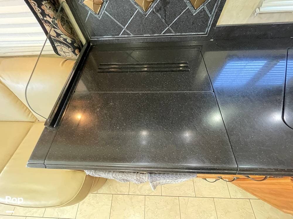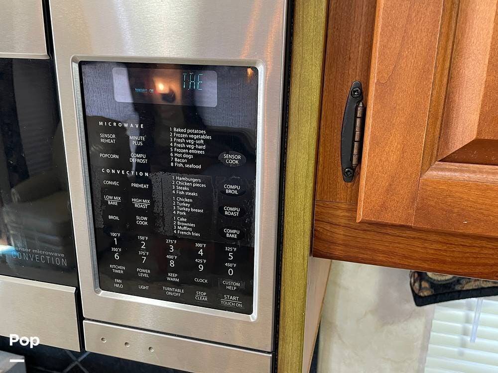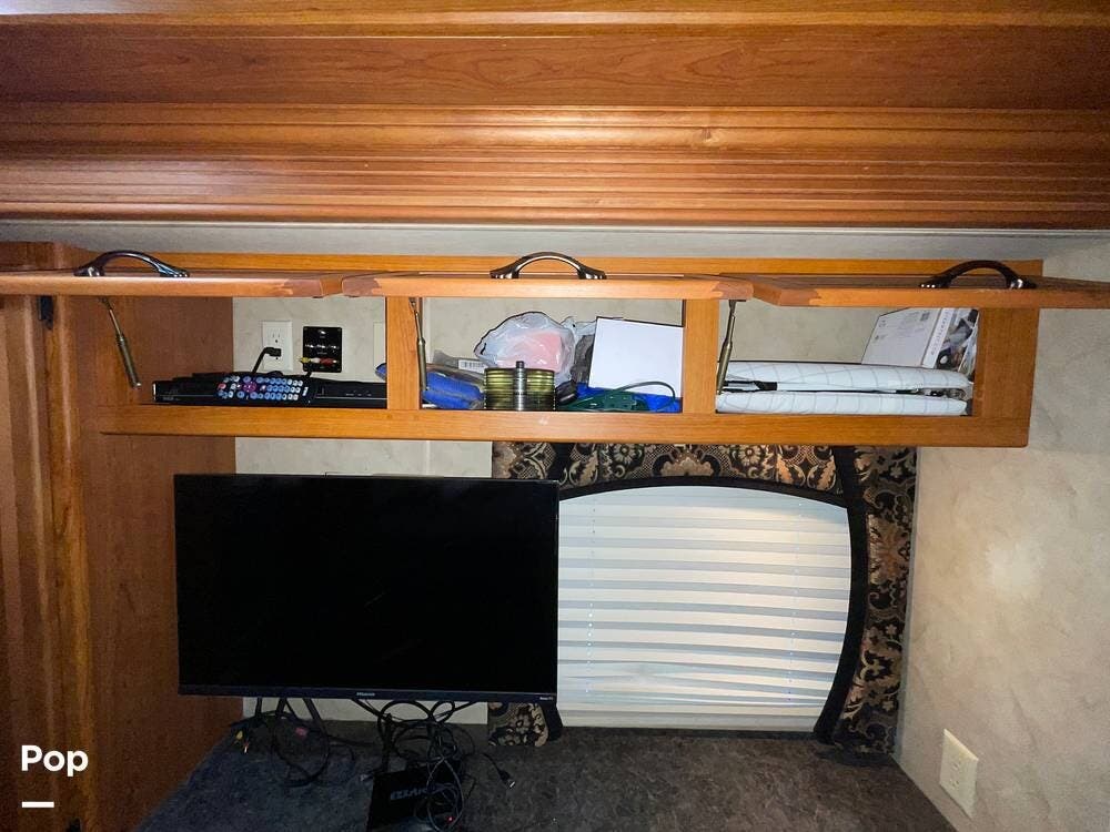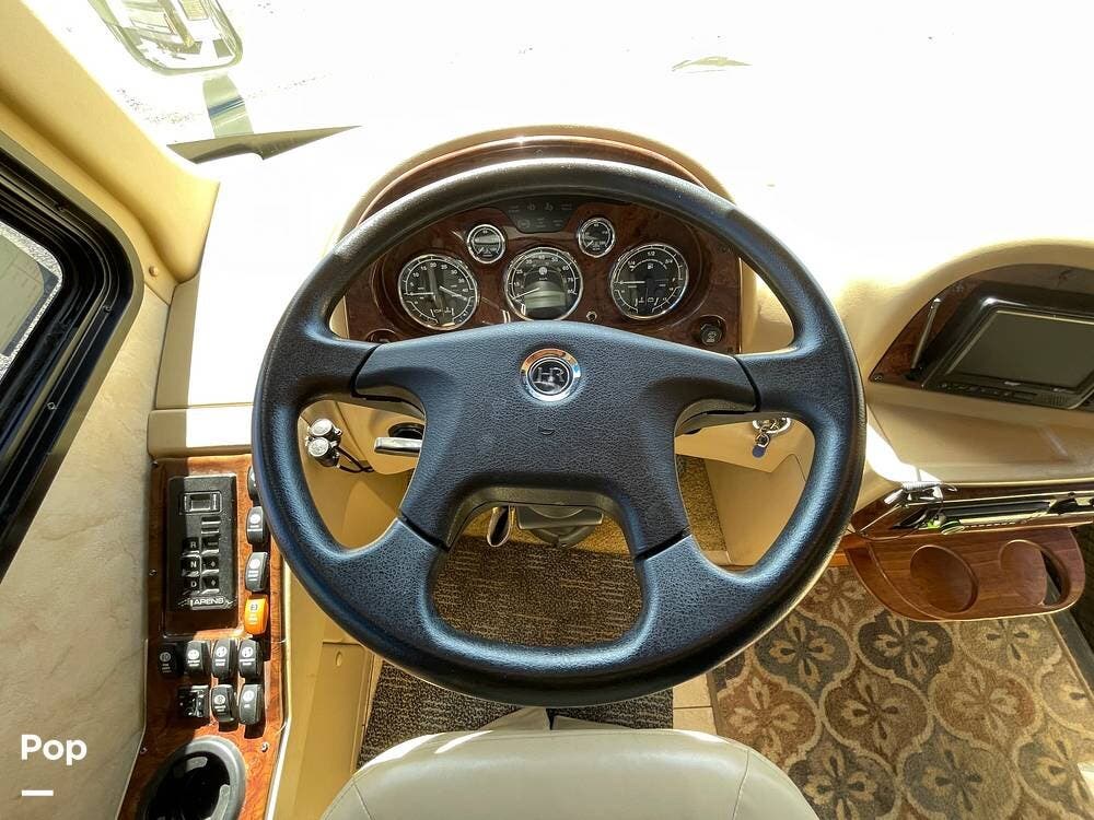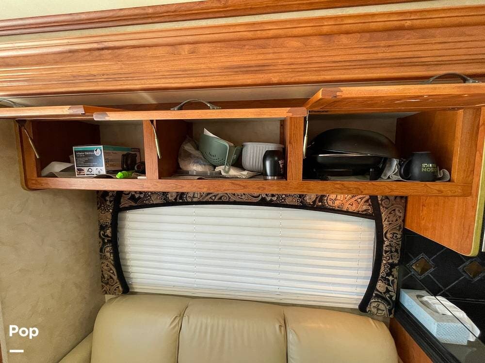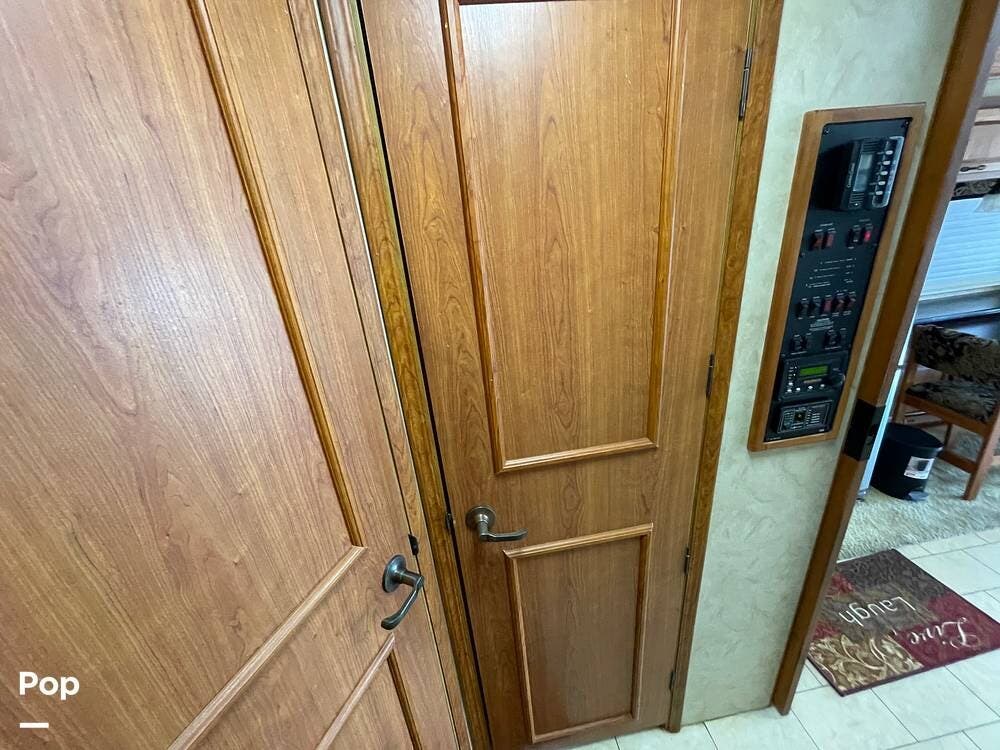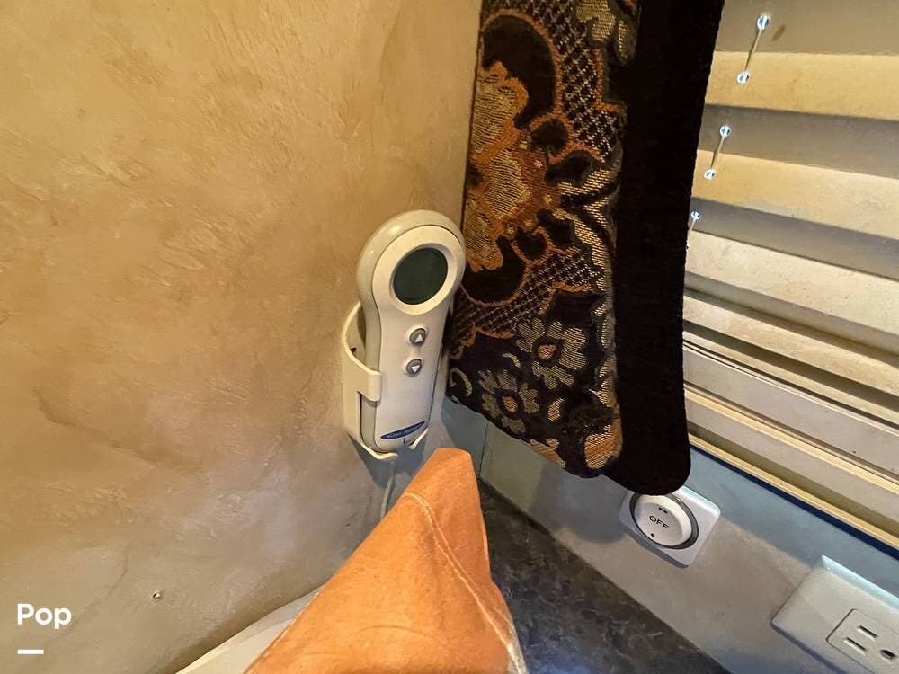 The fiberglass dash with Oxford Burl instrumentation panel hosts a CD player/radio that's Sirius-ready. You'll also find power sunvisors and pull-down side sunshades. A center mounted TV points back towards the living space.