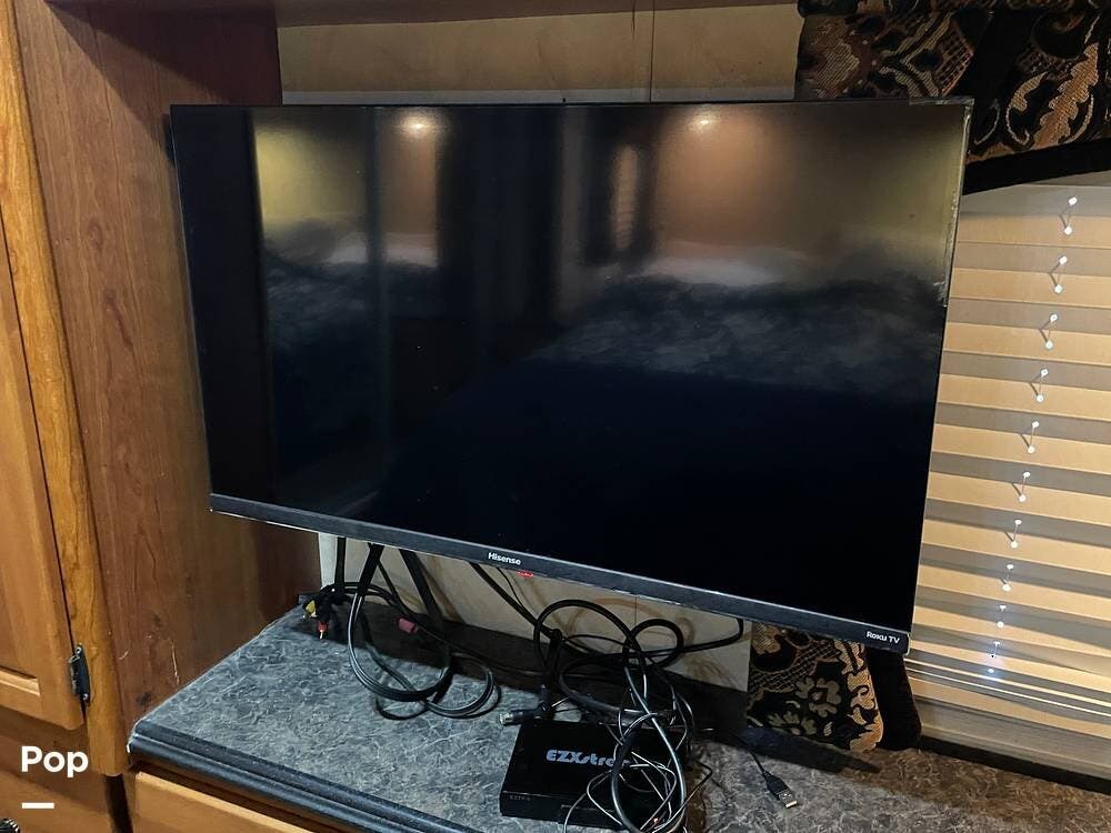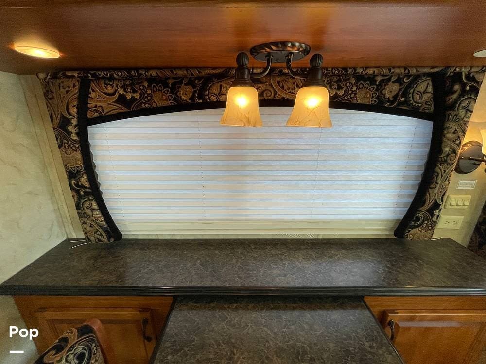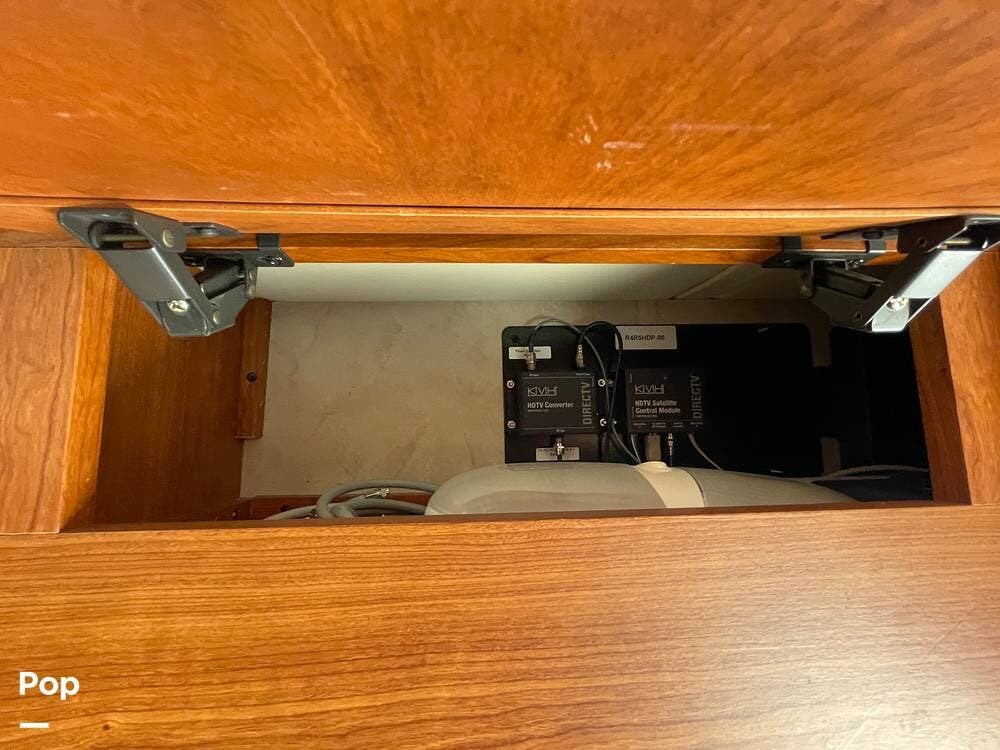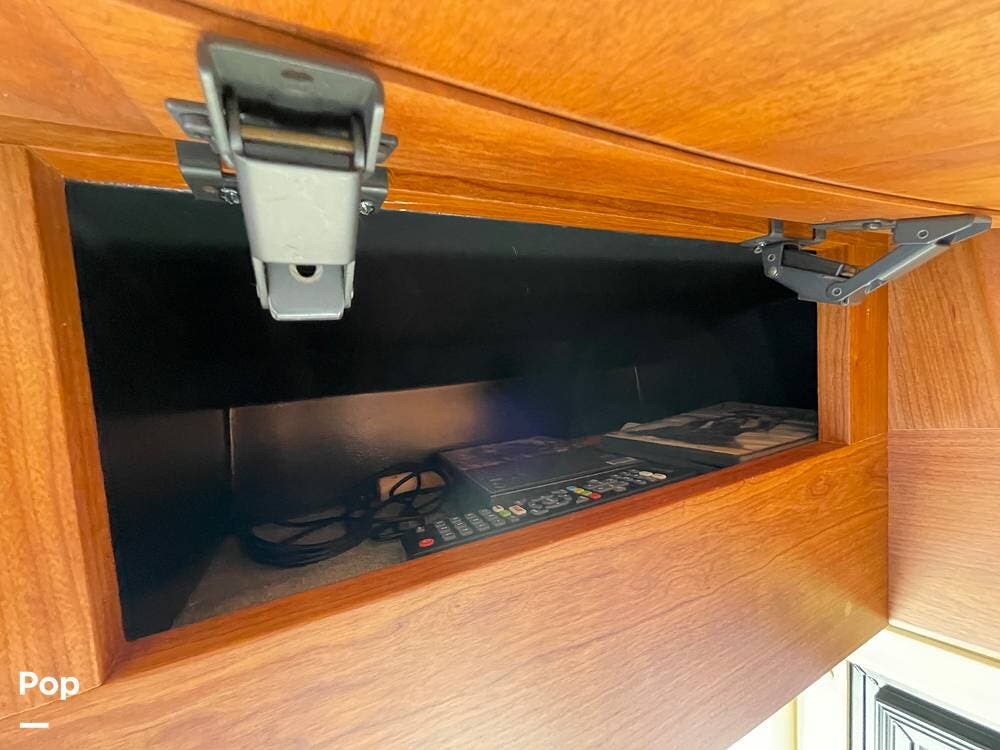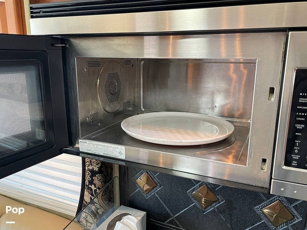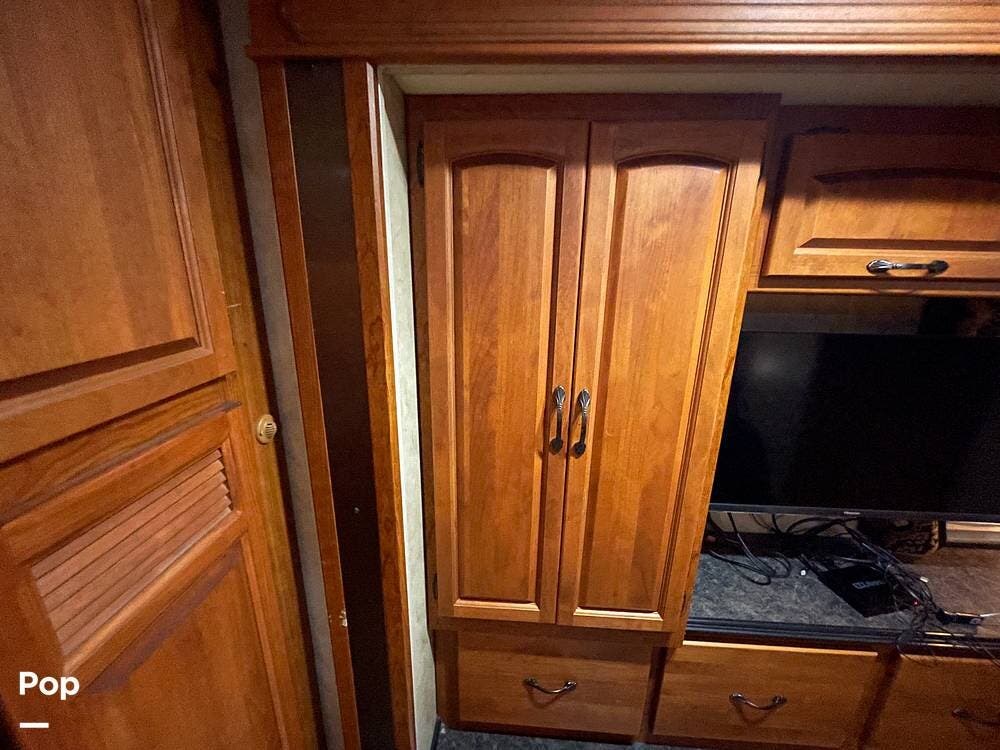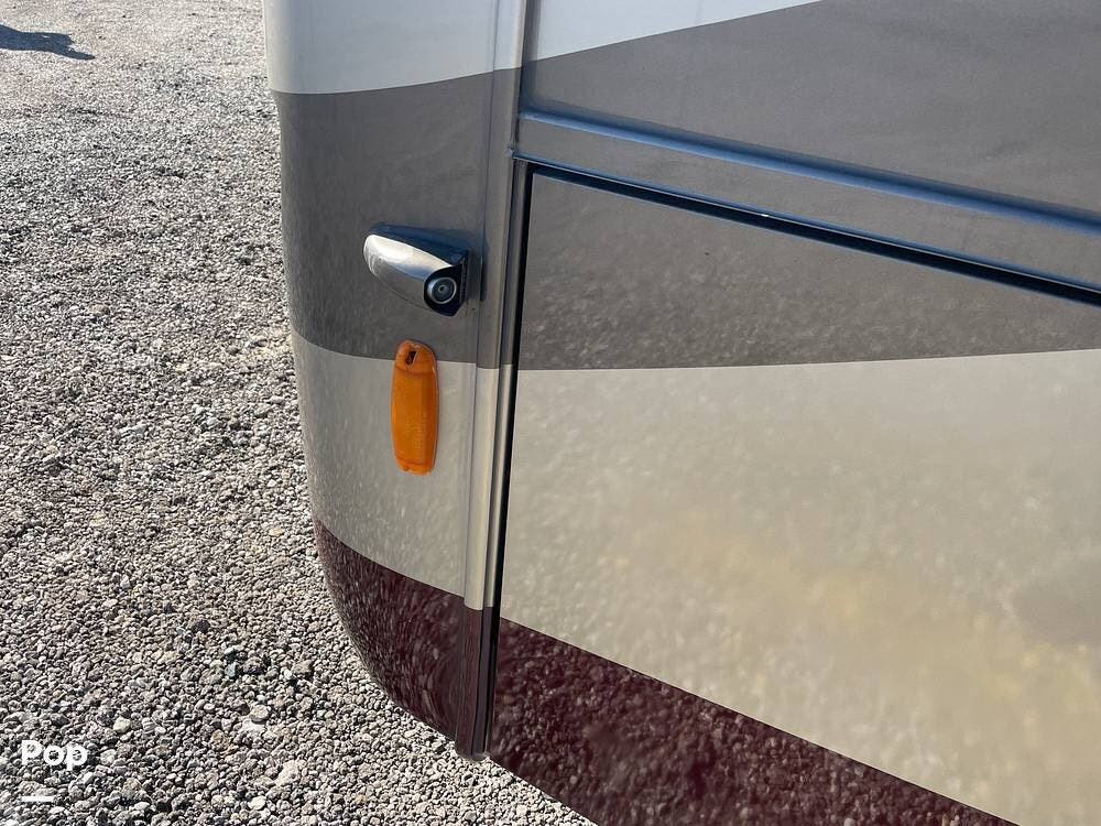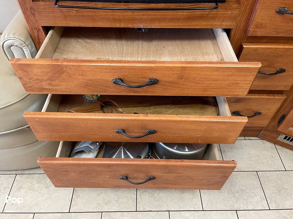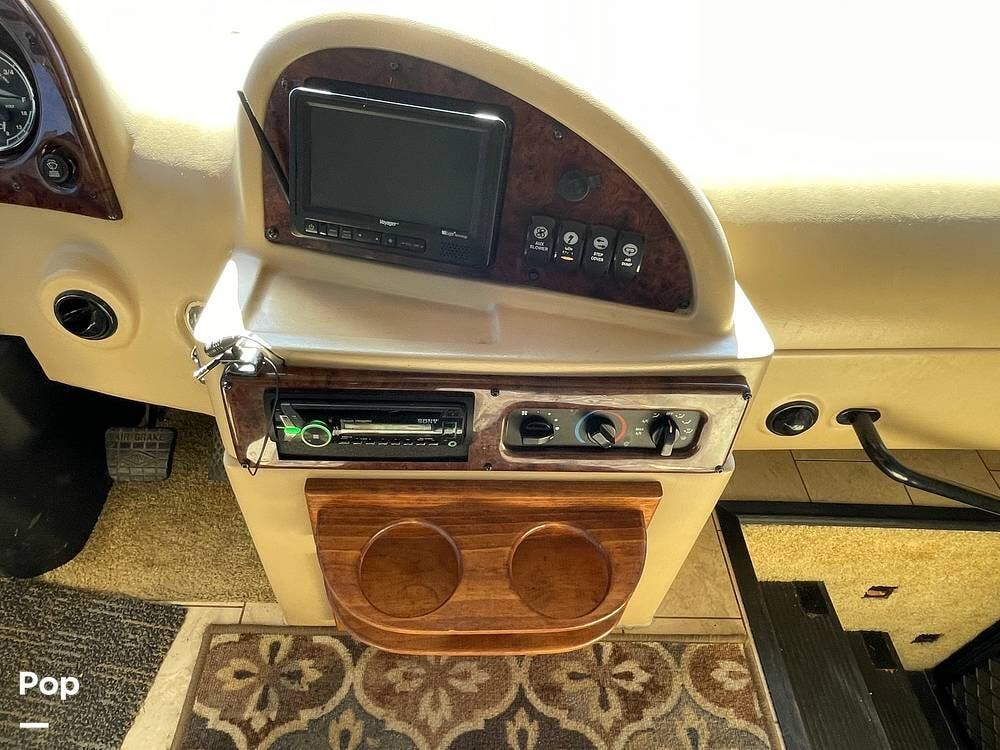 The fiberglass dash with Oxford Burl instrumentation panel hosts a CD player/radio that's Sirius-ready. You'll also find power sunvisors and pull-down side sunshades. A center mounted TV points back towards the living space.