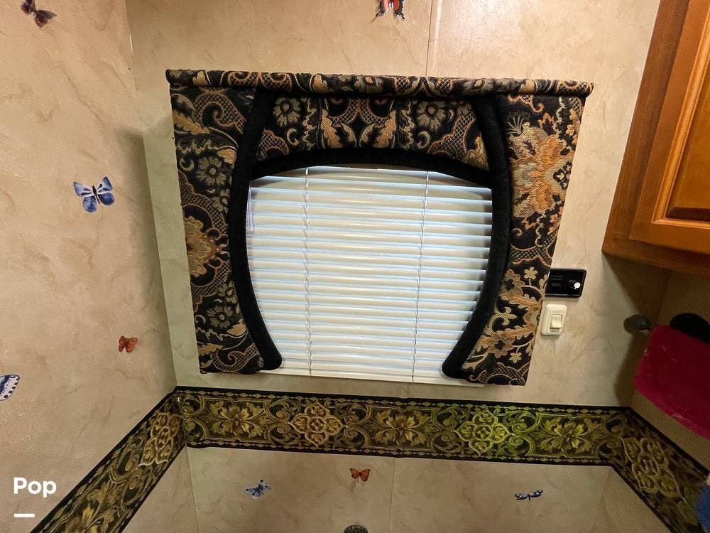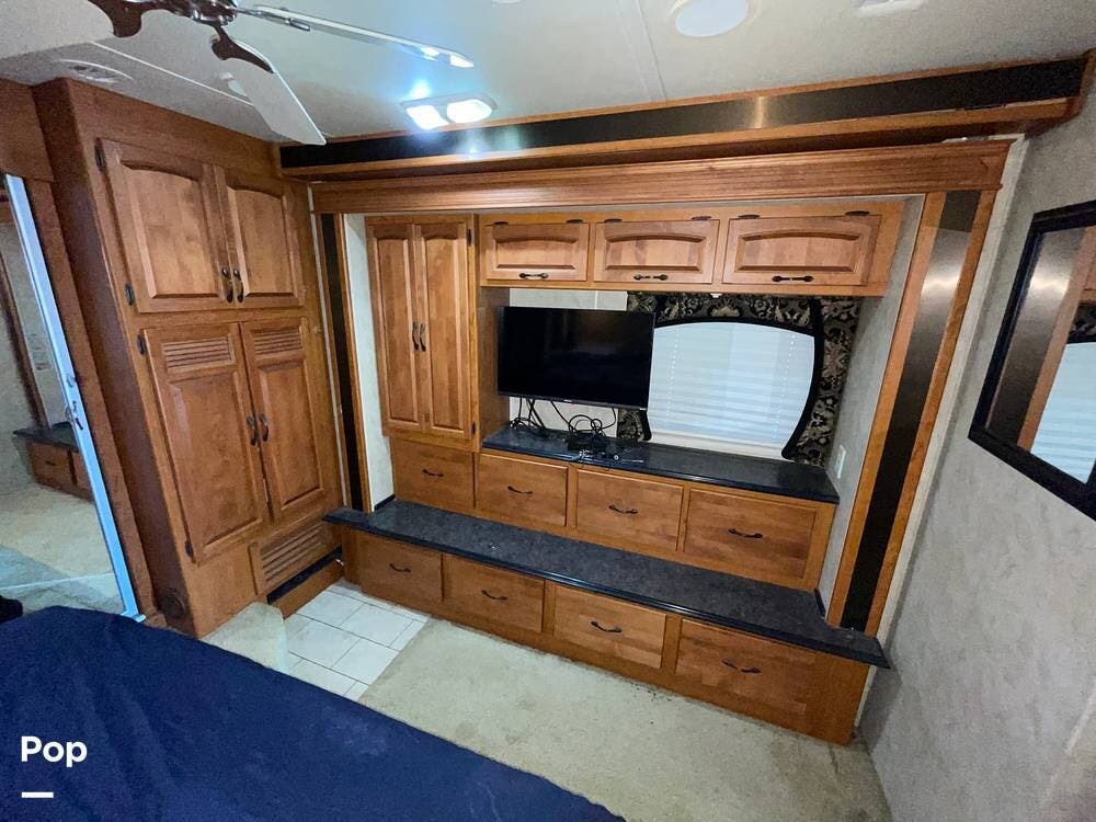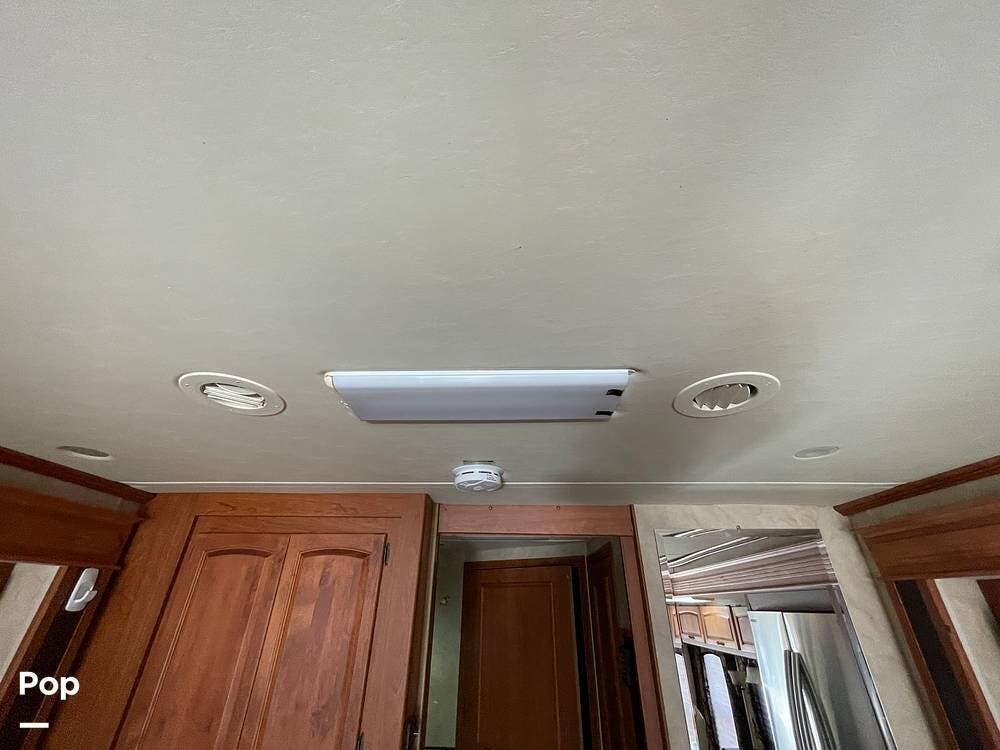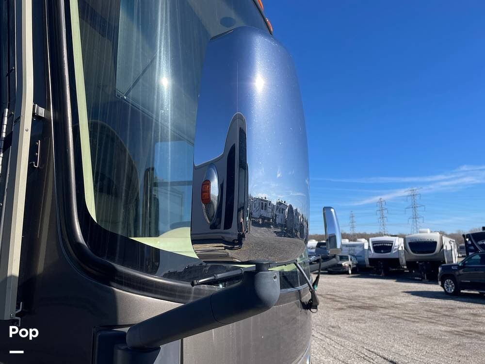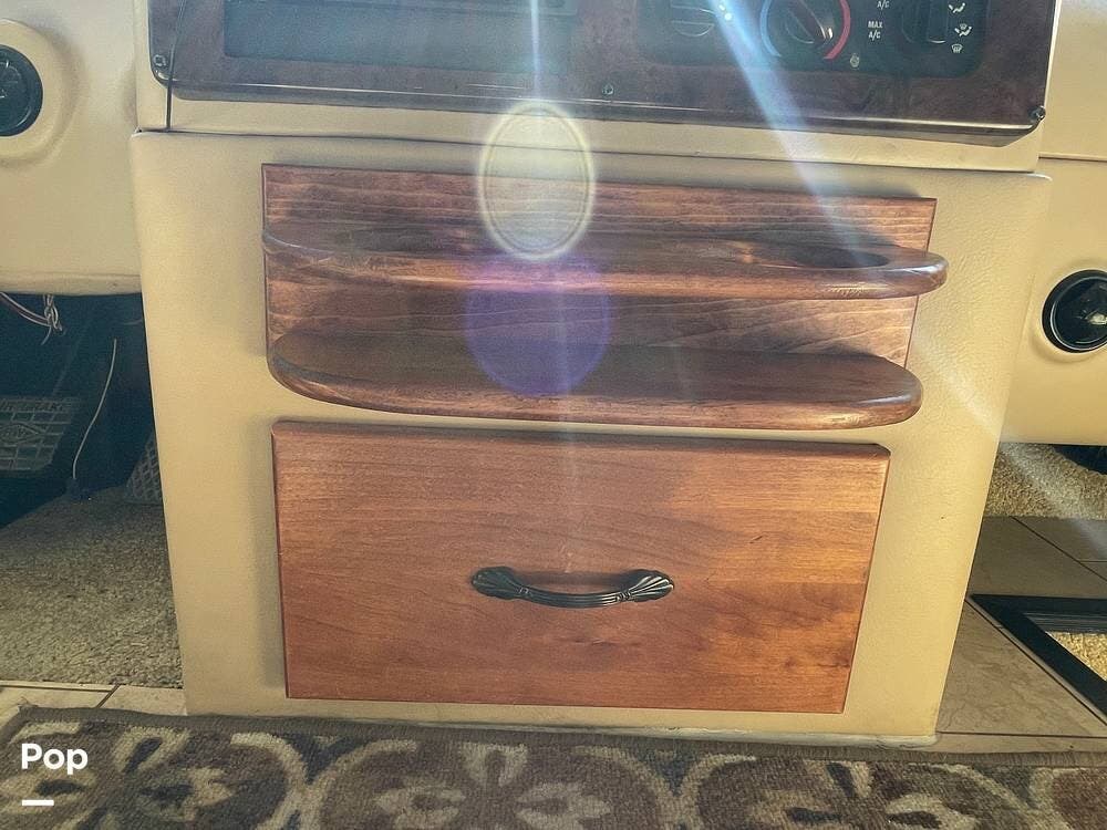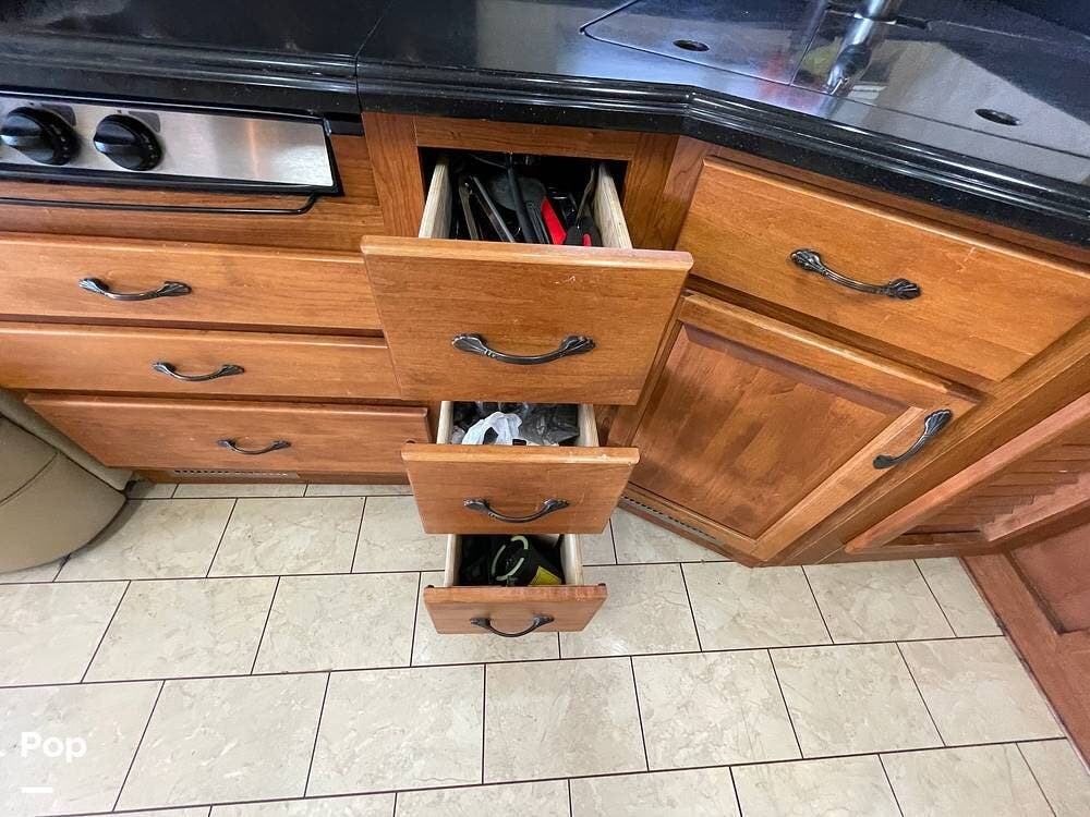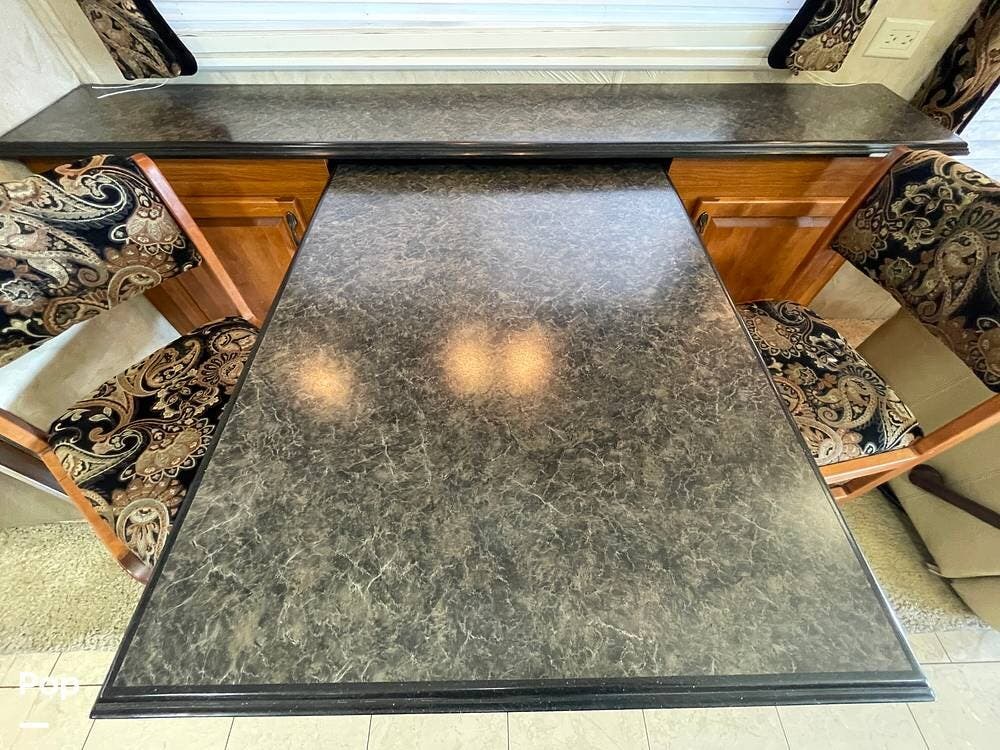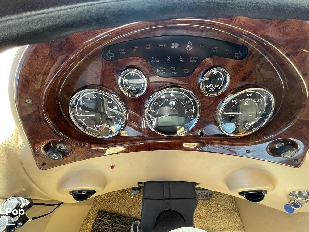 The fiberglass dash with Oxford Burl instrumentation panel hosts a CD player/radio that's Sirius-ready. You'll also find power sunvisors and pull-down side sunshades. A center mounted TV points back towards the living space.