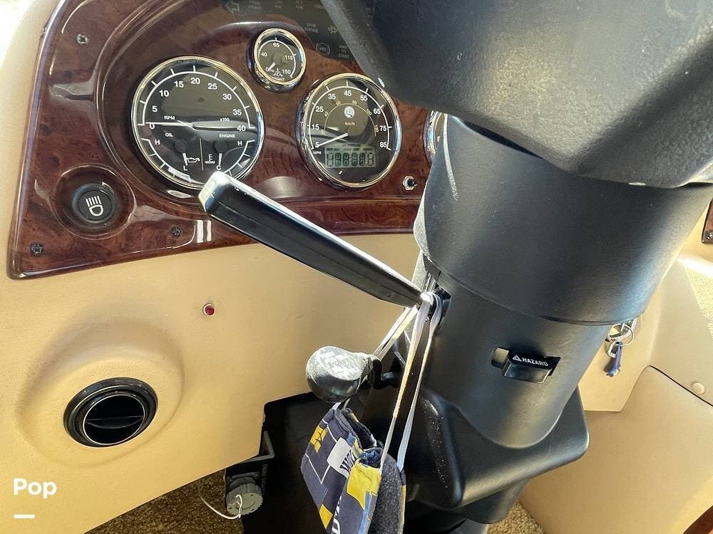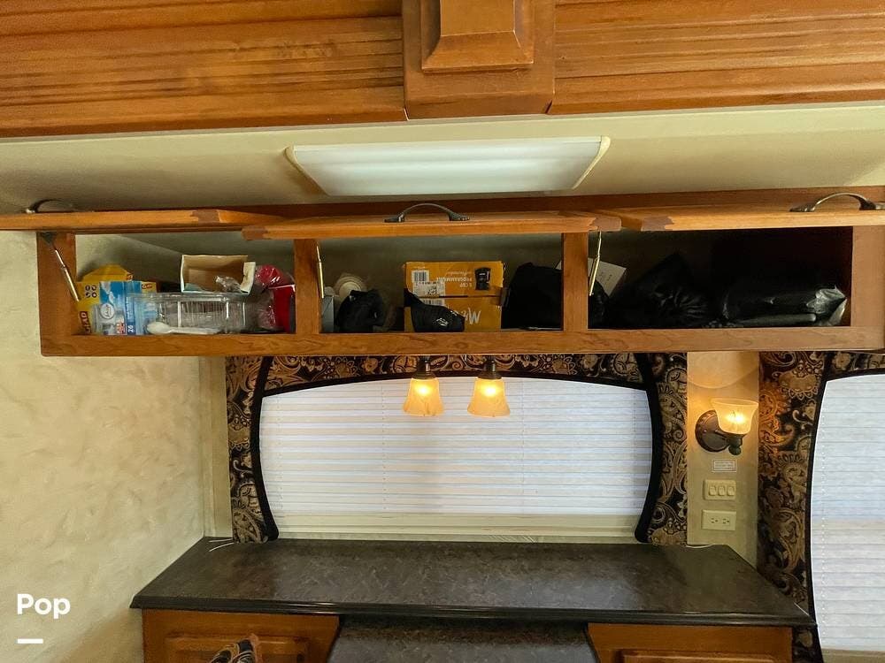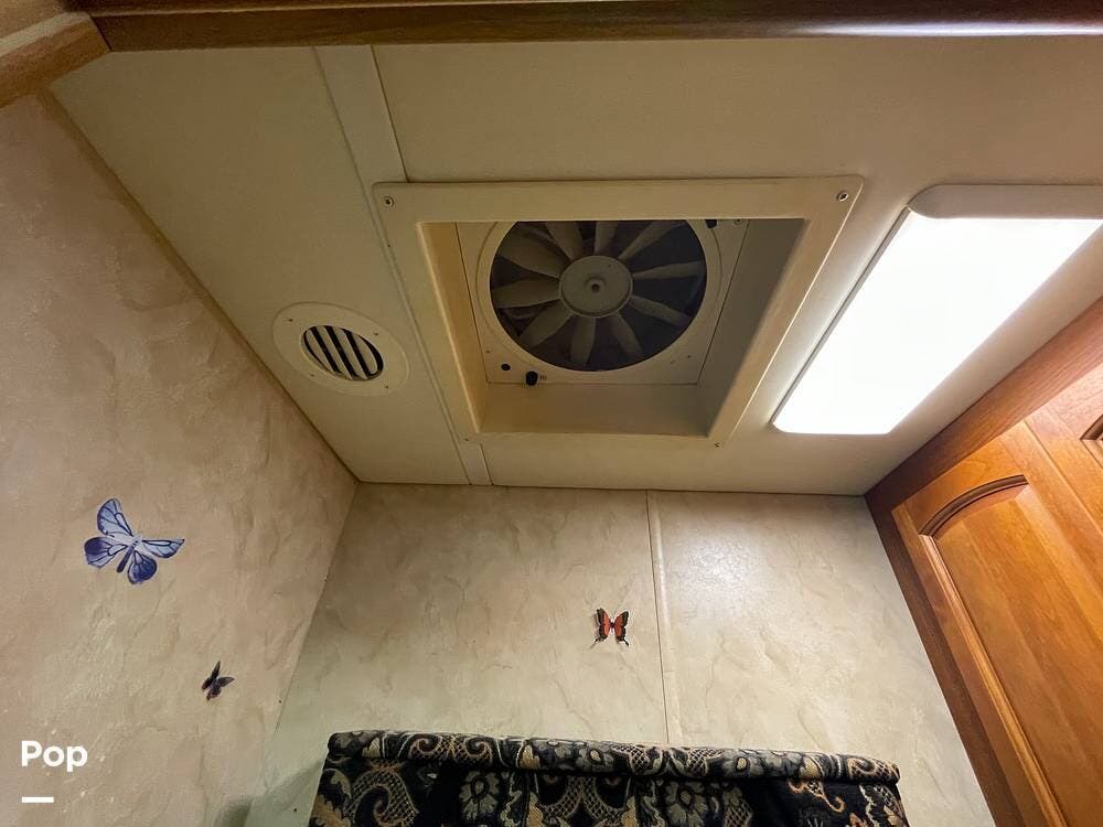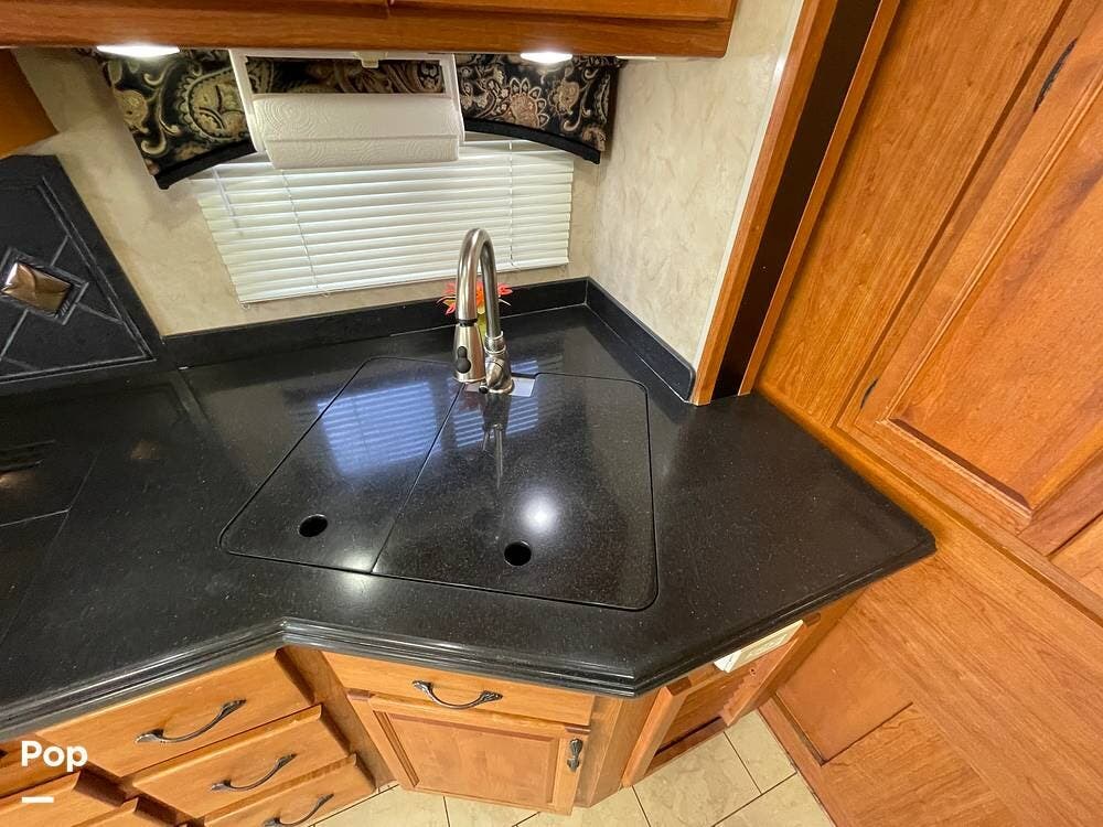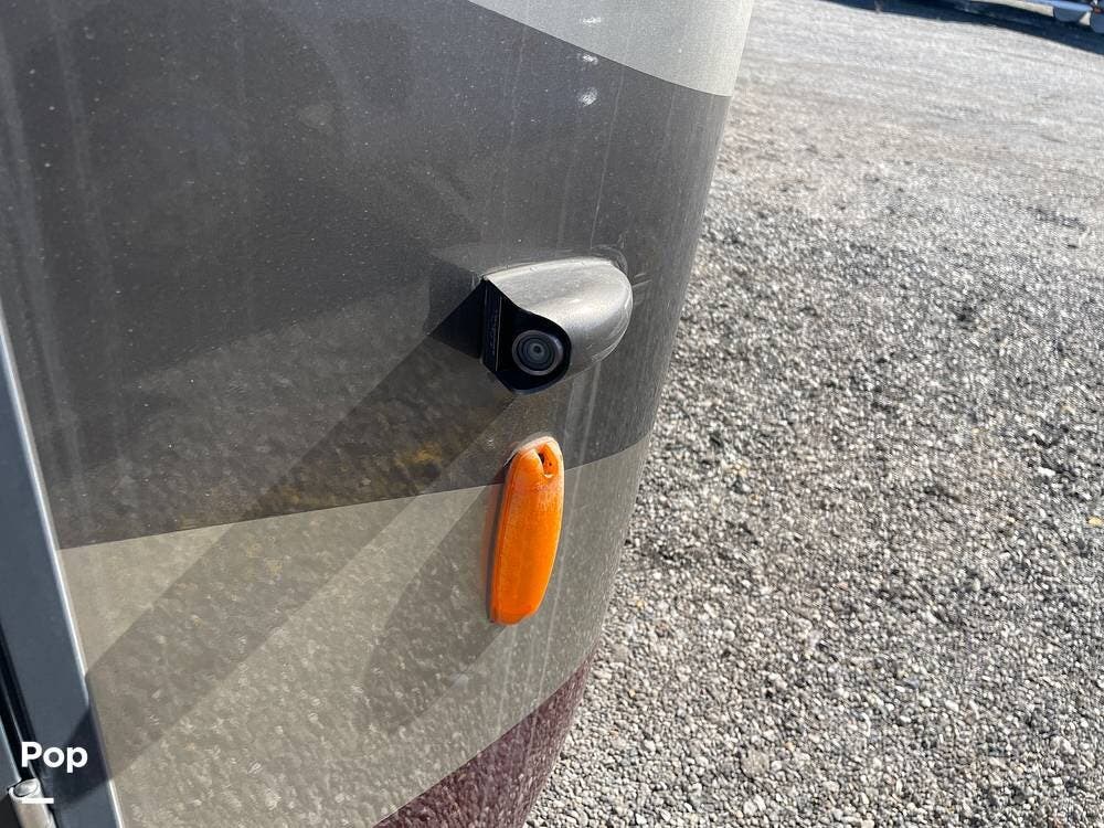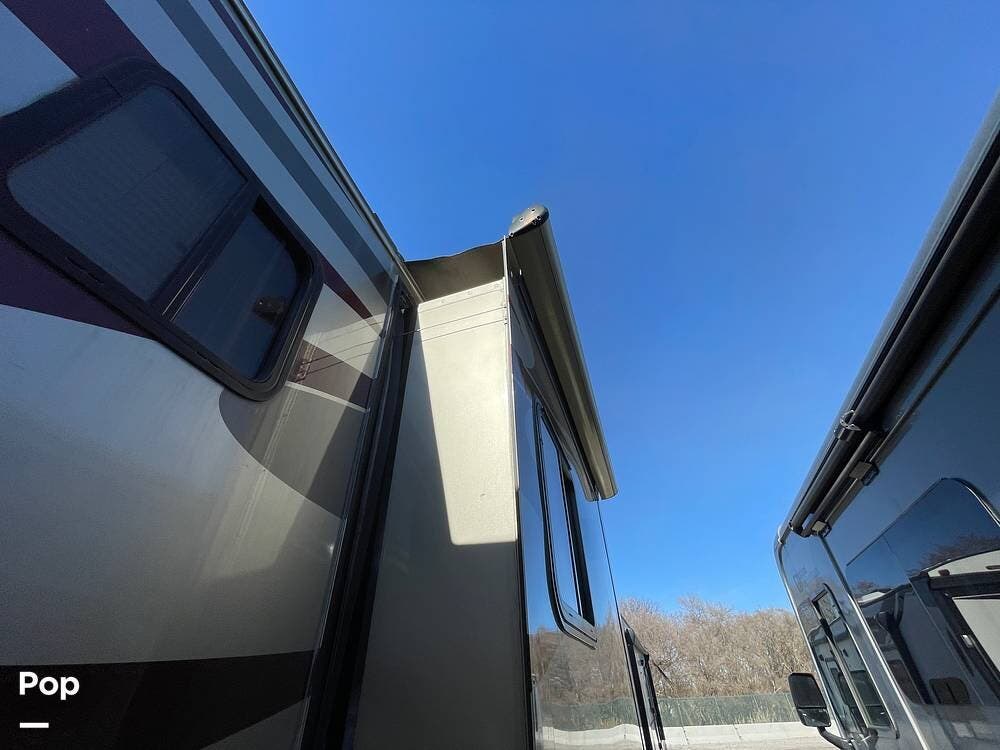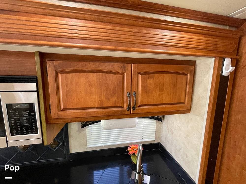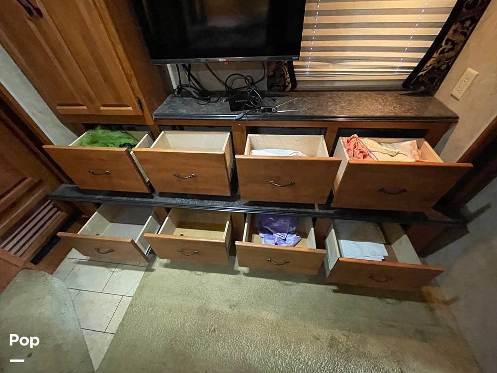 The fiberglass dash with Oxford Burl instrumentation panel hosts a CD player/radio that's Sirius-ready. You'll also find power sunvisors and pull-down side sunshades. A center mounted TV points back towards the living space.