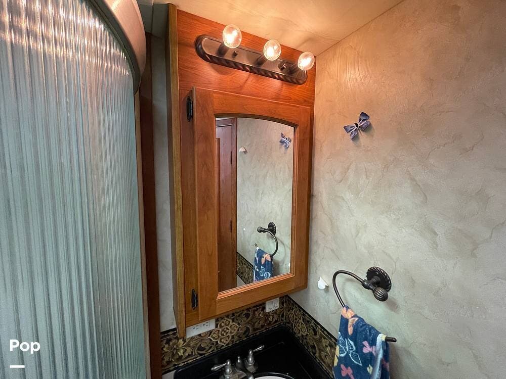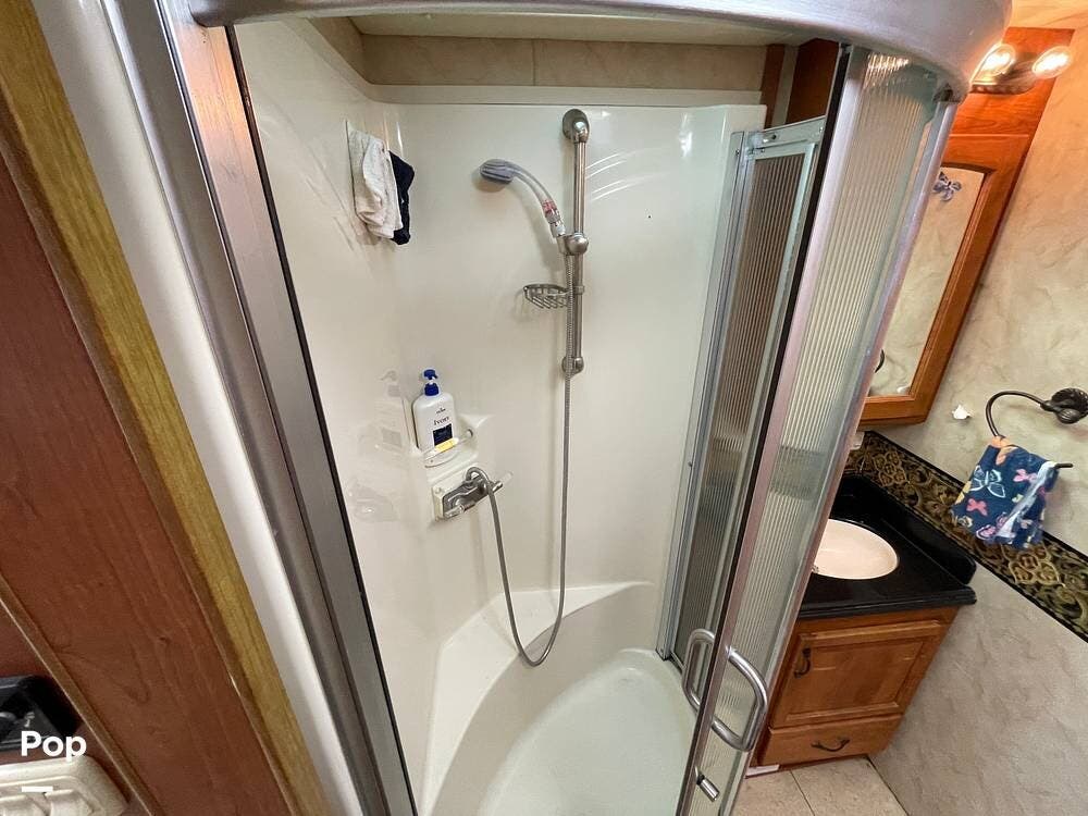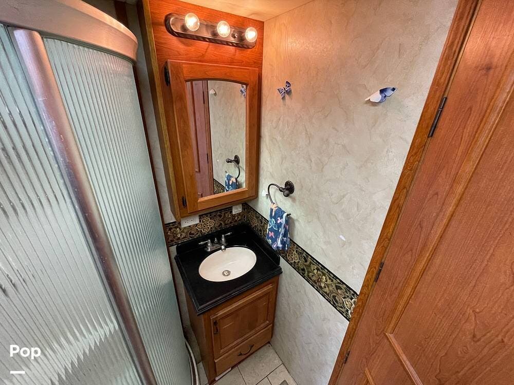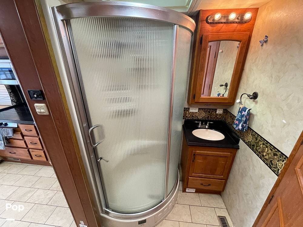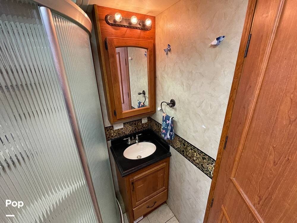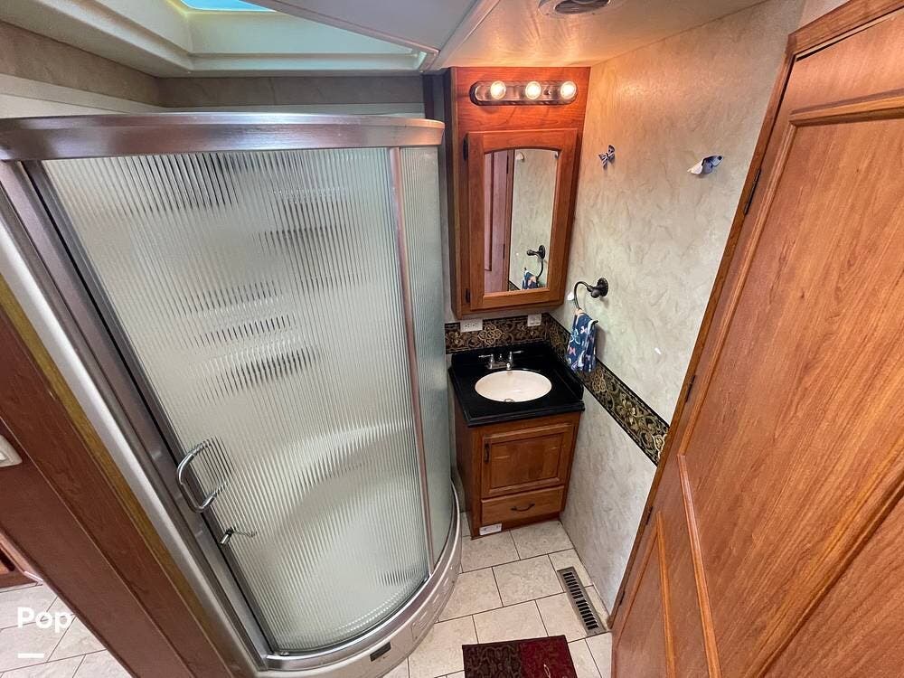 The full bathroom is split to either side of the Neptune 37PDQ. There is a private toilet area on the driver's side and a sink with vanity, medicine cabinet, and shower on the other side of the RV.