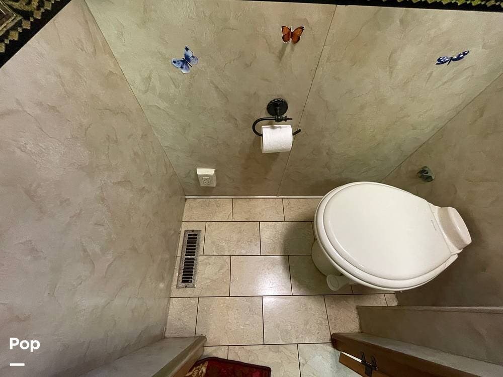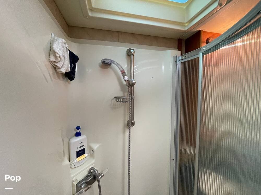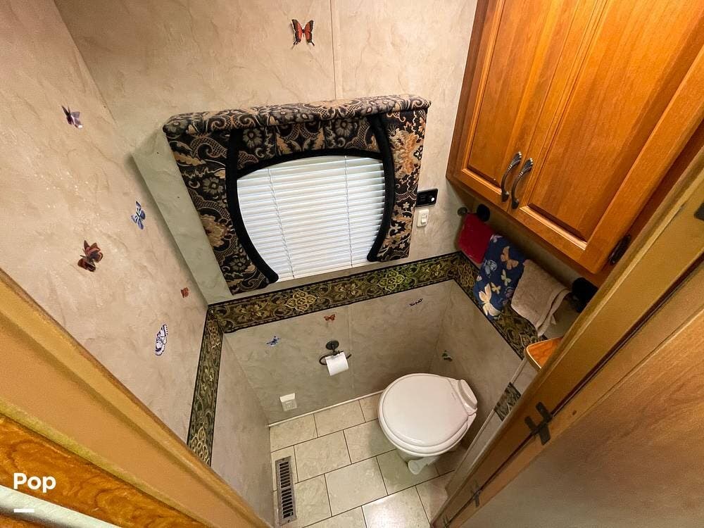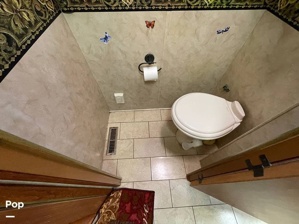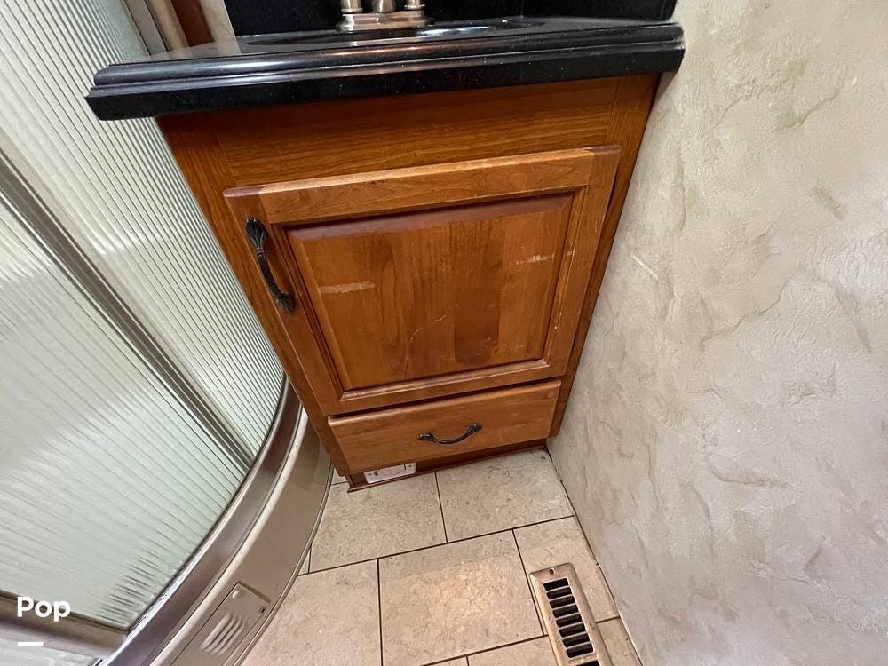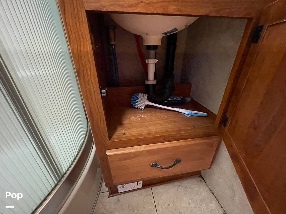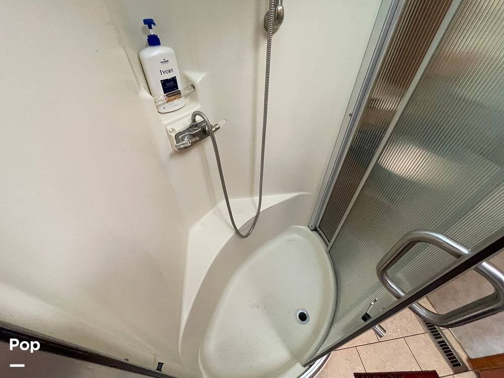 The full bathroom is split to either side of the Neptune 37PDQ. There is a private toilet area on the driver's side and a sink with vanity, medicine cabinet, and shower on the other side of the RV.