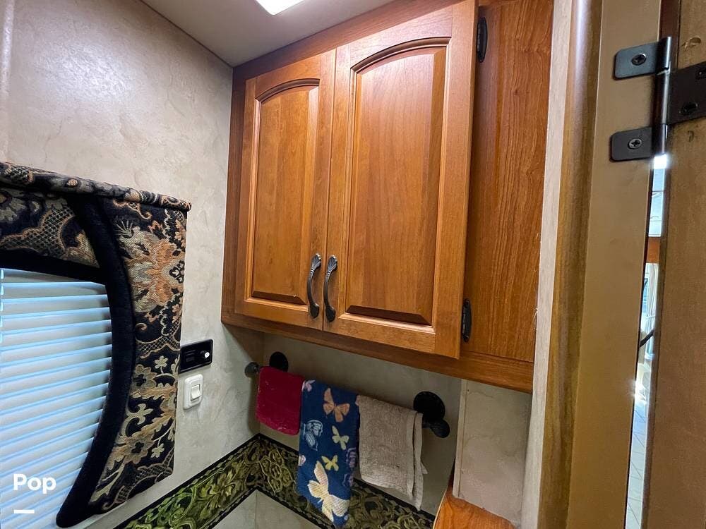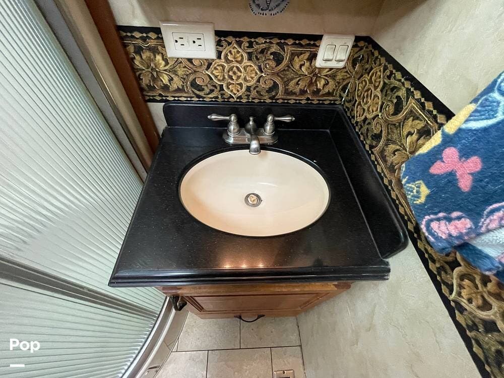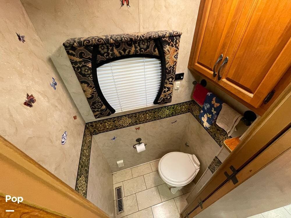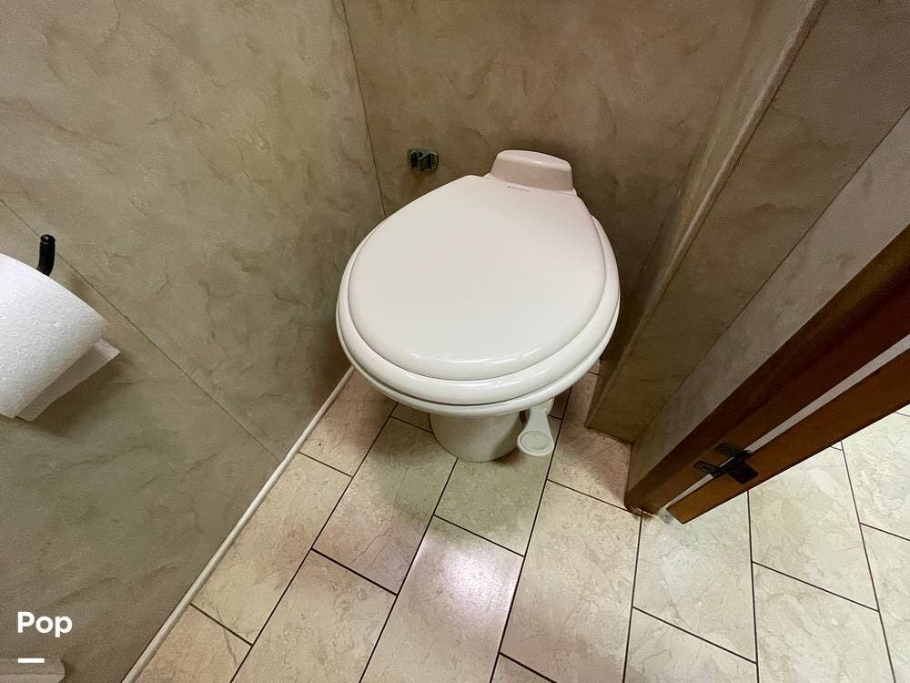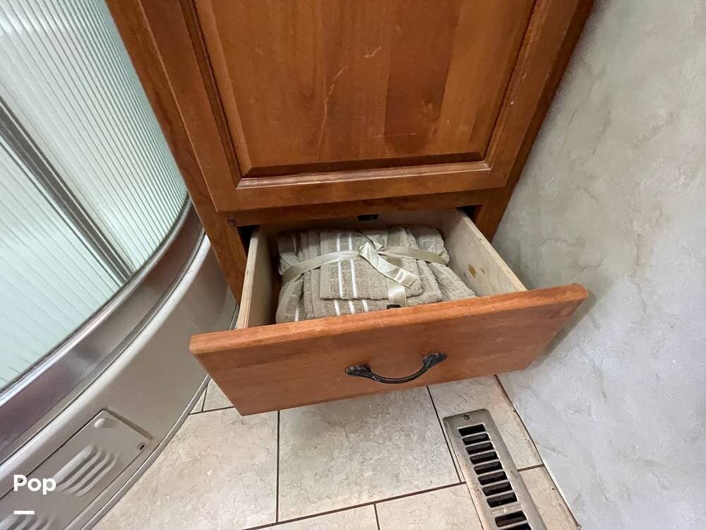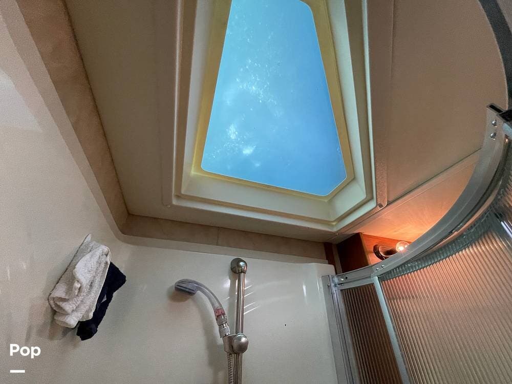 The full bathroom is split to either side of the Neptune 37PDQ. There is a private toilet area on the driver's side and a sink with vanity, medicine cabinet, and shower on the other side of the RV.