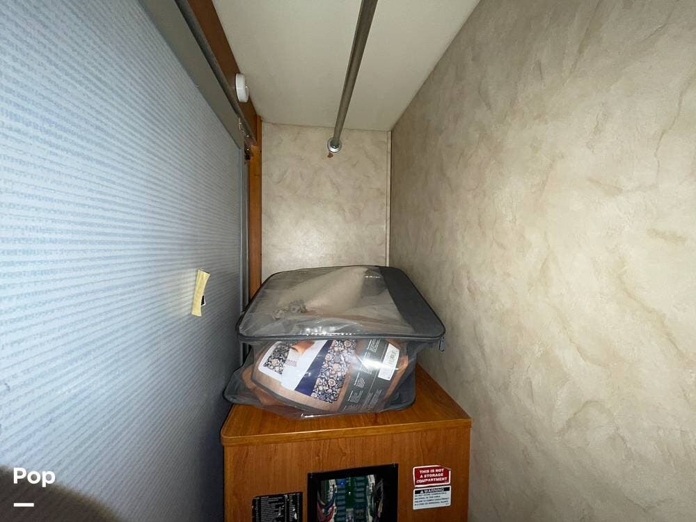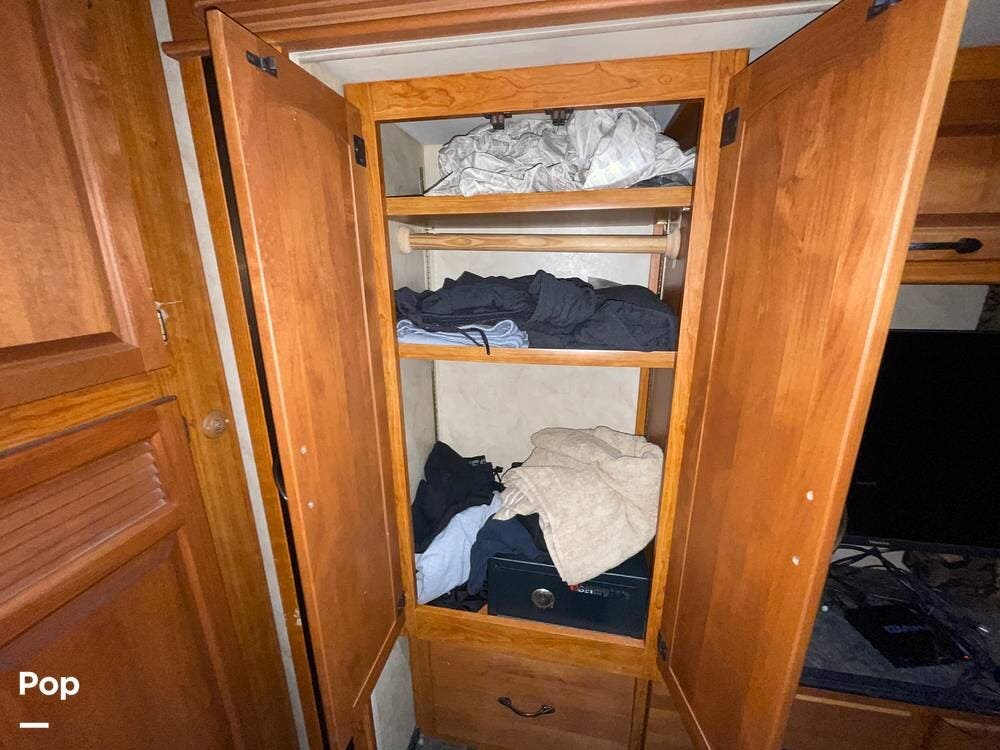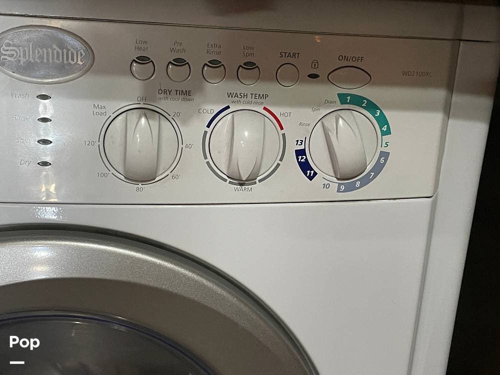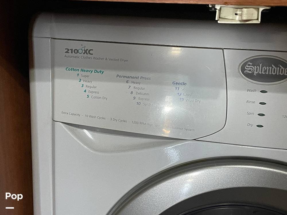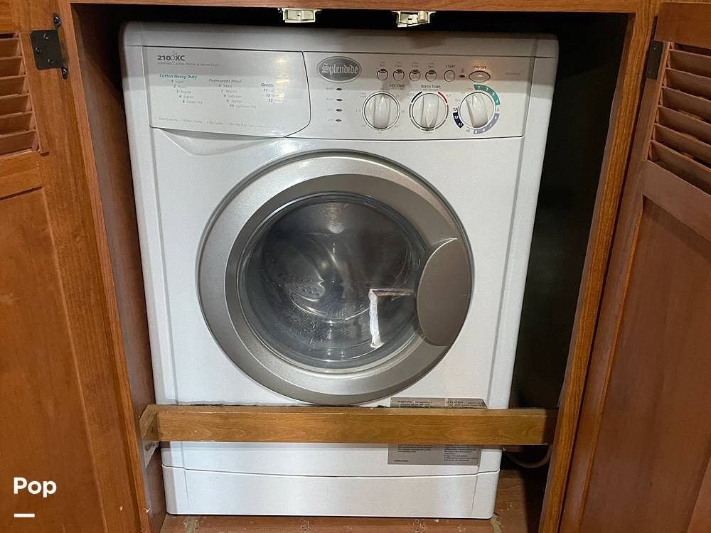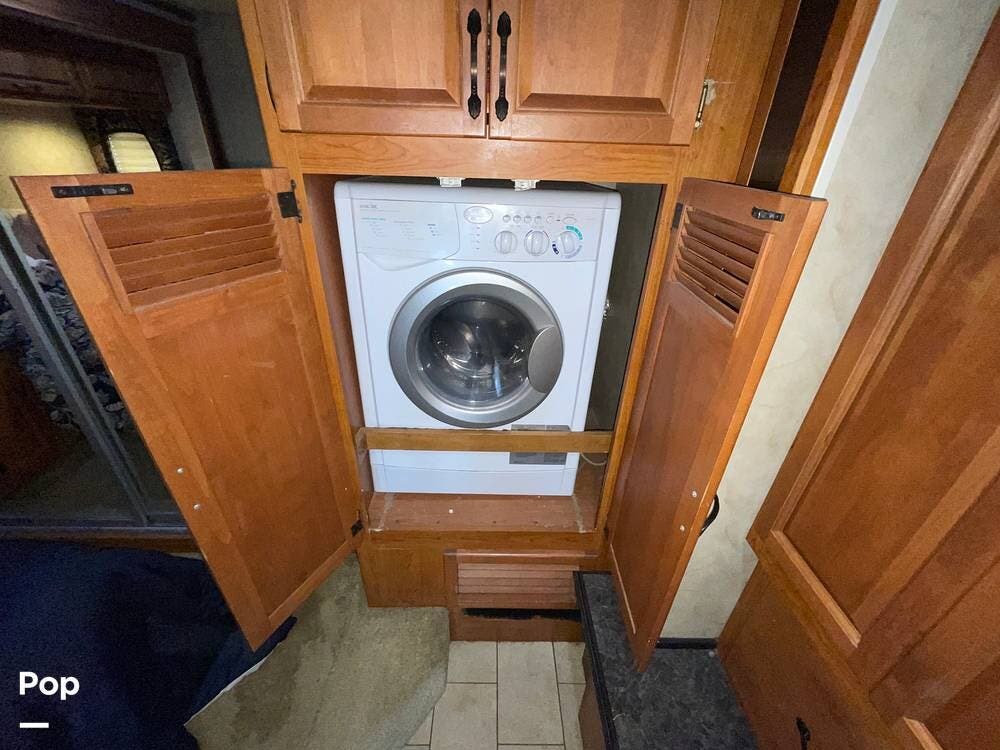 Running along the rear of the RV is a large hanging closet and a washer/dryer combination.
