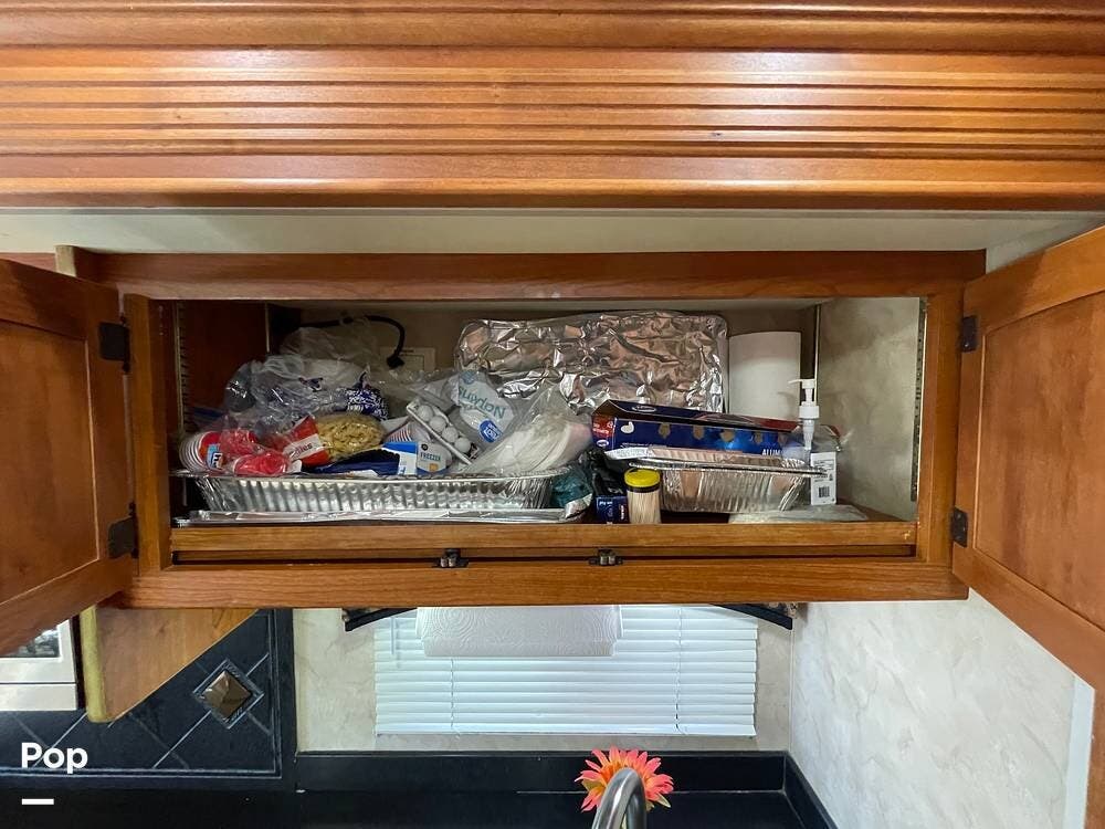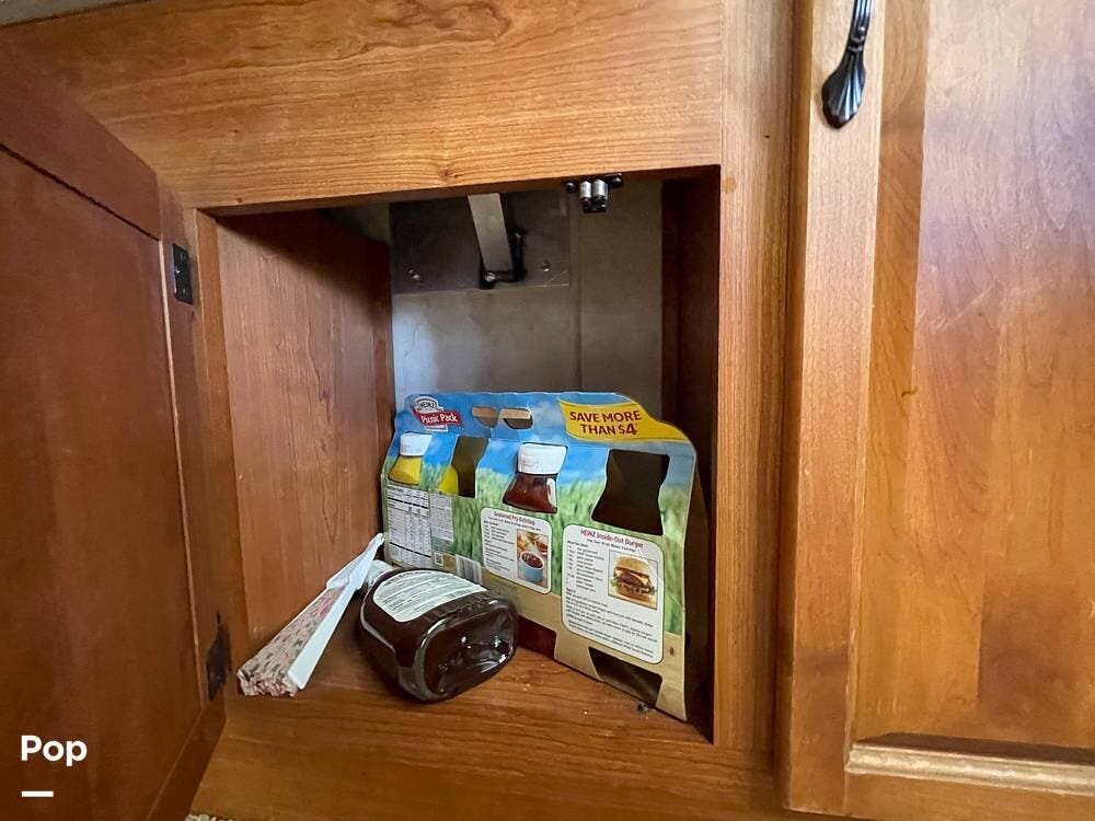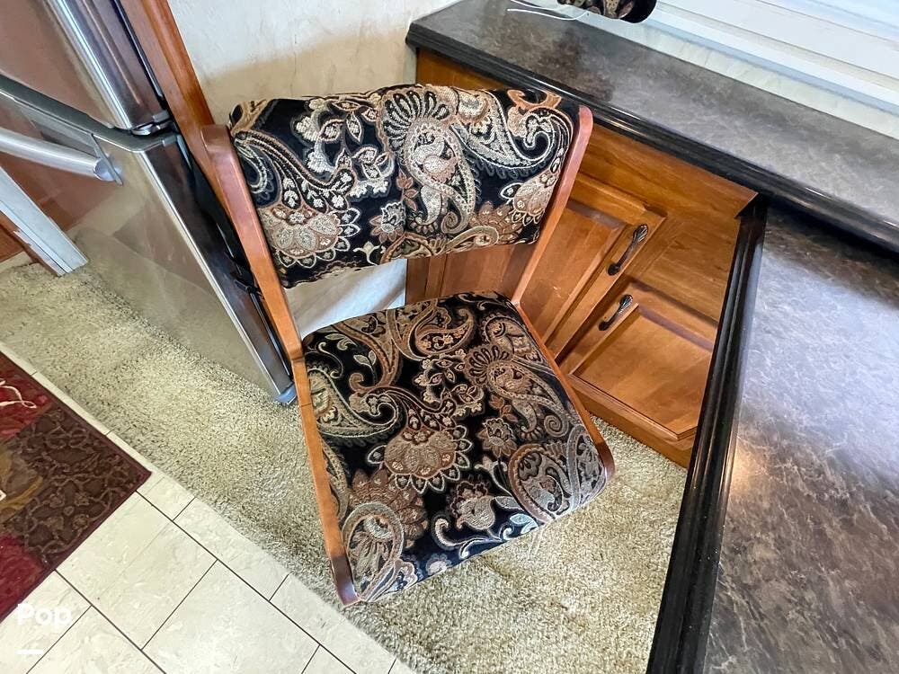 The living space's opposing slides make for a cavernous interior. The driver's side slide contains a barrel chair and dining table with chairs, both with overhead cabinet storage, a pantry, and a refrigerator/freezer.