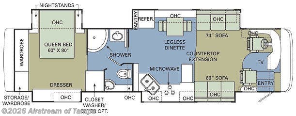 Quad Slide Scepter Class A Diesel w/Rear Queen Bed Slideout w/Nightstands, Wardrobe, Storage/Wardrobe, Dresser w/Overhead Cabinet Slideout, Closet Washer/Dryer Opt., Private Toilet Area w/Lav., Corner Shower, Lav., Pantry/Refrigerator/Free Standing Dinette w/Chairs & 74" Sofa Slideout, TV Above Cab Area, 68" Sofa/3 Burner Range w/Microwave & Double Kitchen Sink Slideout & More.