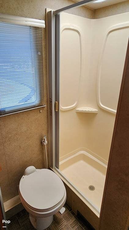The rear features a fully enclosed bathroom with a shower, toilet, and sink. Climate is managed by a ceiling-ducted air conditioner and a floor-ducted propane furnace, both controlled by a wall thermostat. An Onan generator is installed for off-grid power when hookups aren't available.
