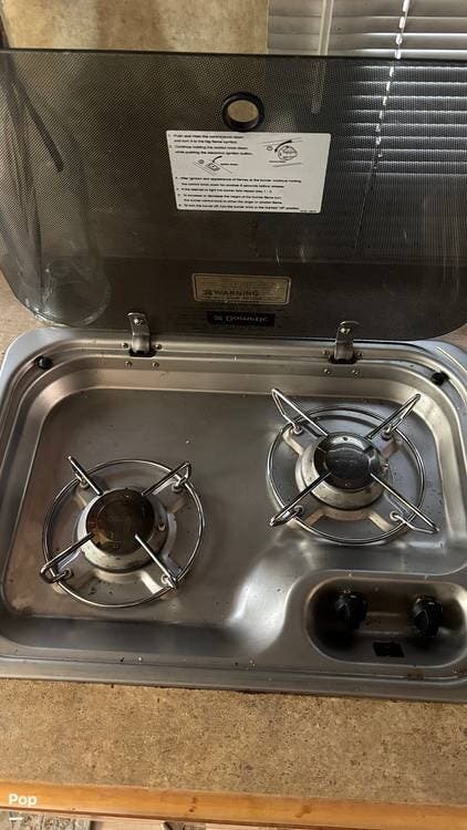 The galley features laminate countertops, a two-burner range top with glass cover, a range hood with vent and light, a microwave oven, a refrigerator/freezer, a stainless steel sink with glass cover, and a fold-down faucet to maximize workspace. Full-extension drawer slides and overhead curved cabinetry provide storage.