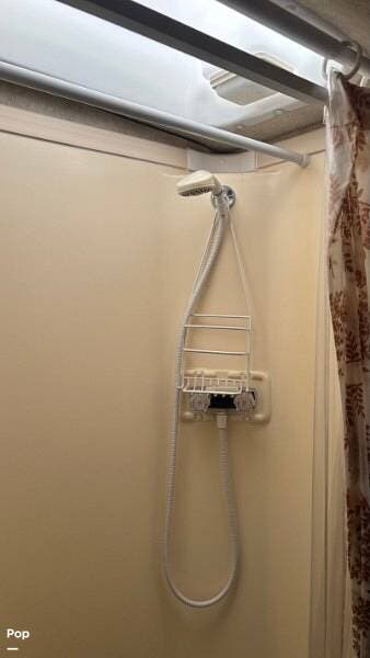 The bath area offers a dual-control lavatory faucet, a dual-control shower with a flexible showerhead, a retractable shower door, a powered roof vent, and a round stainless steel sink in the lavatory cabinet. Skylight above the shower adds natural light.