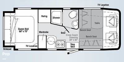 The front living area includes two separate bench seats with a fold-out table. The bench seats can convert to an additional 38" x 82" sleeping area to accommodate additional guests. Swivel cab seats allow for extra seating once the vehicle is parked, blending the driving and living areas for a more social setup.