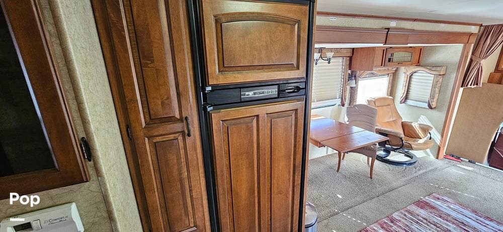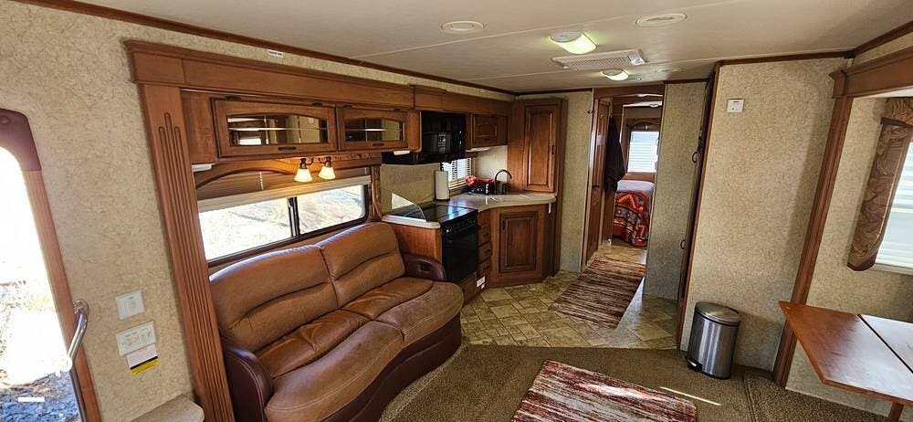The 36-foot length provides ample space for both living and storage, ensuring you have all the room you need while still being easy to maneuver on the road. Inside, the layout has been designed with comfort in mind, offering a fully equipped kitchen with a three-burner stove, microwave, oven, and a large fridge to handle all your cooking needs.