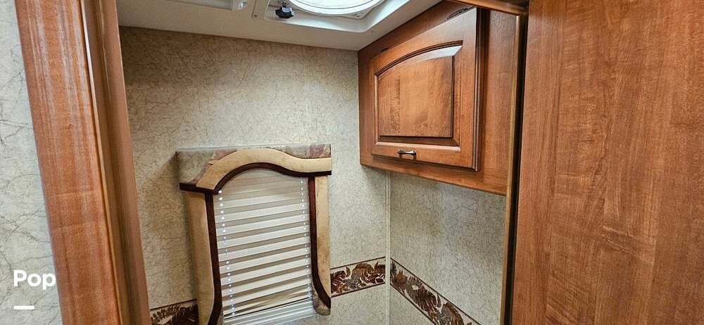 The living area is spacious and includes a comfortable sofa and a dinette, providing plenty of room for relaxation and dining. The master bedroom features a queen-size bed, abundant closet space, and a comfortable atmosphere for a good night's sleep, while the over-cab bunk and convertible dinette add extra sleeping options for family or guests.