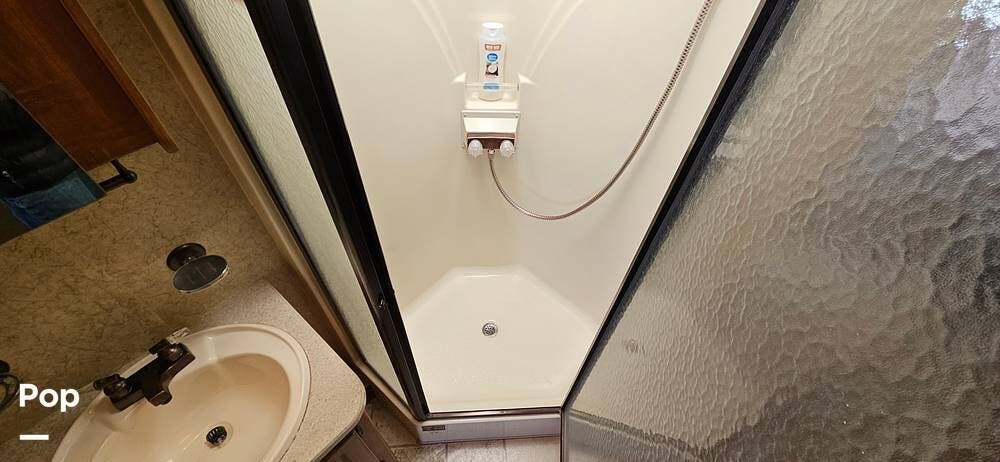 The bathroom has a separate shower, toilet, and sink for privacy and ease. The motorhome is equipped with dual roof A/C units to keep you cool and comfortable in warm weather, and the automatic leveling jacks ensure a quick and easy setup at campgrounds.