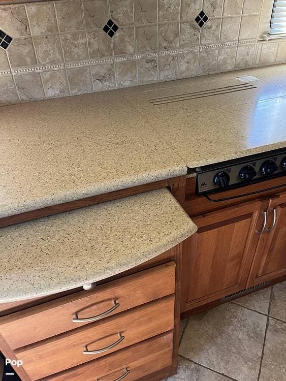 The kitchen is well laid out with solid countertops, a three-burner stove, a microwave, a double sink, and a full-size refrigerator.