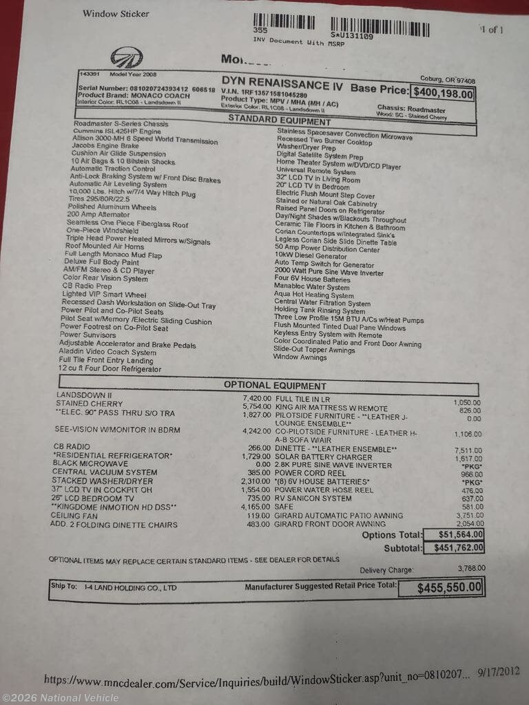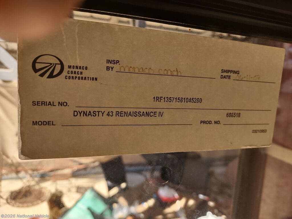 Request More Info on this 2008 Monaco RV Dynasty Renaissance Offered for sale by National Vehicle