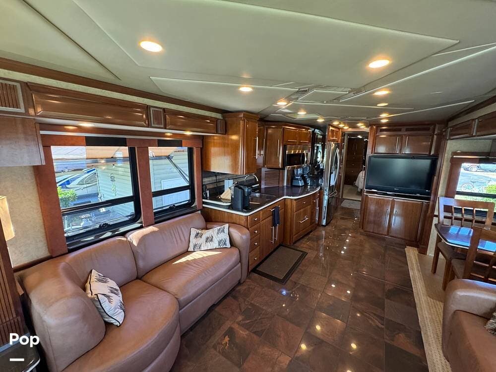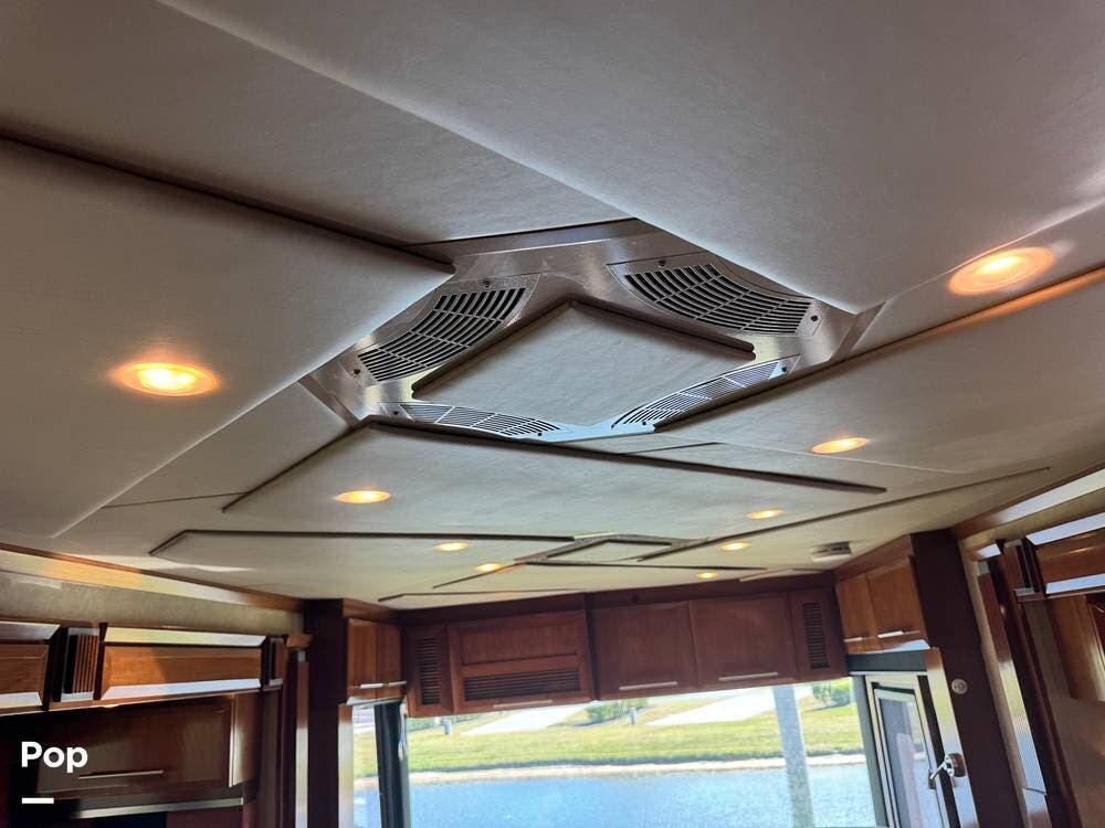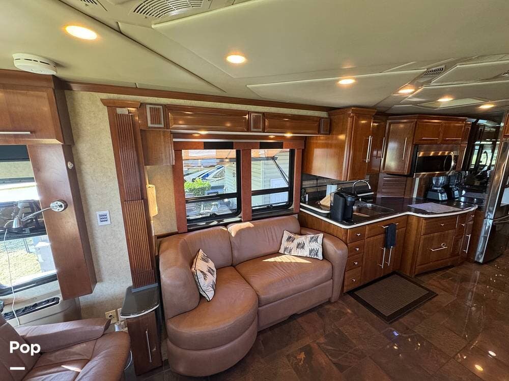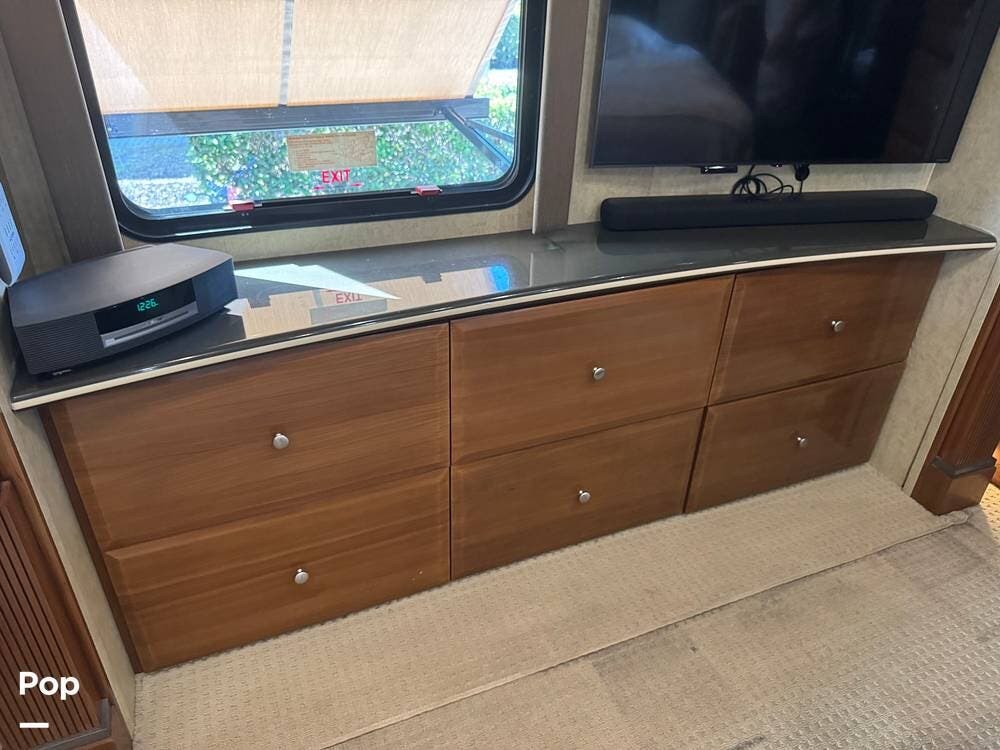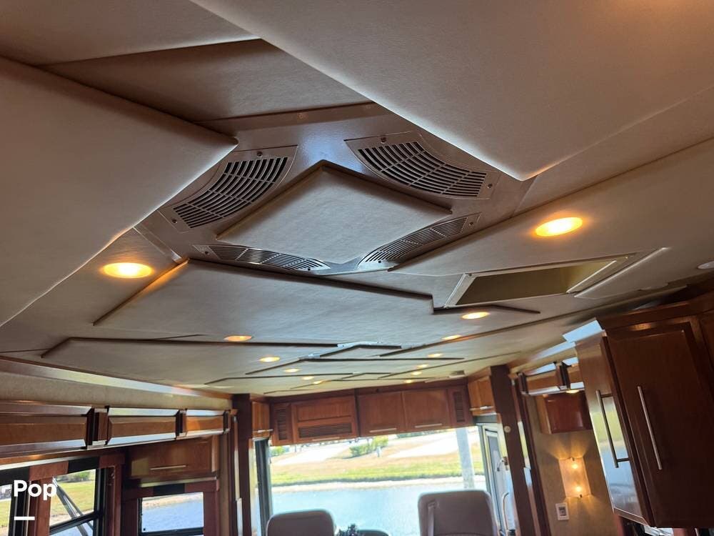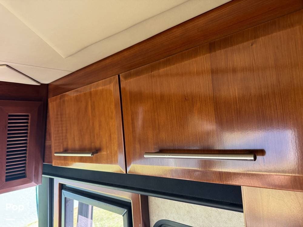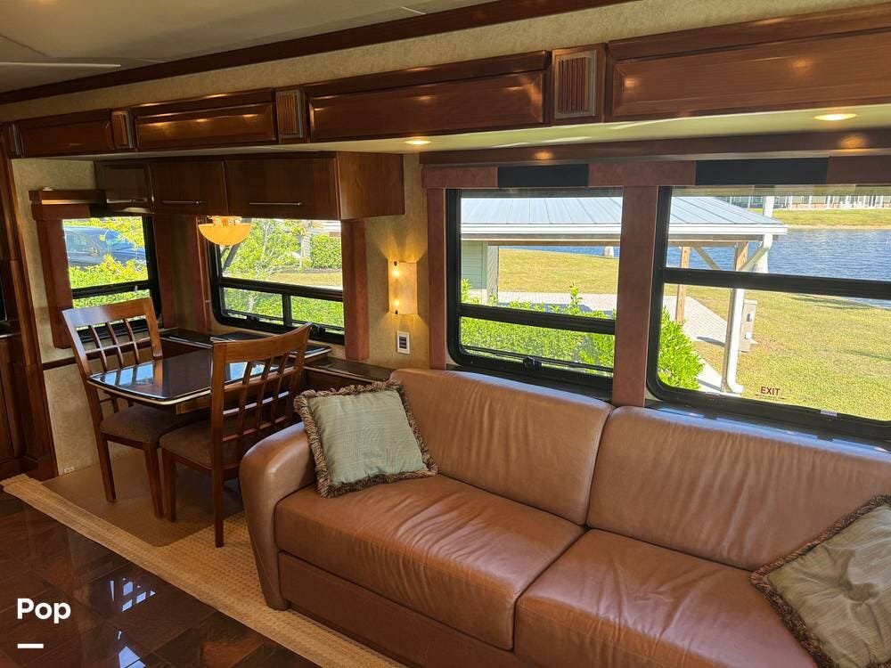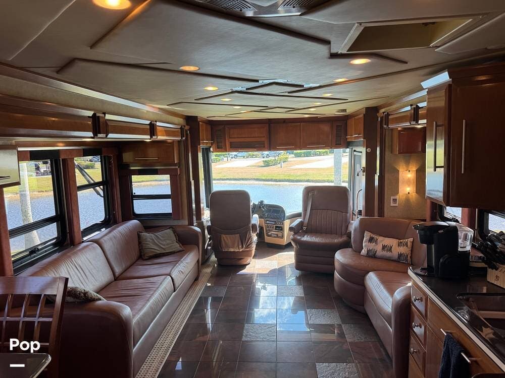 Step inside and you're welcomed by a refined residential interior finished with solid hardwood cabinetry, handcrafted details, and premium materials throughout. The spacious quad-slide floorplan creates a wide-open living area perfect for entertaining or simply stretching out and enjoying the journey. Plush seating, elegant dcor, and expansive windows provide a bright, inviting atmosphere that feels more like a luxury condo than a motorhome.