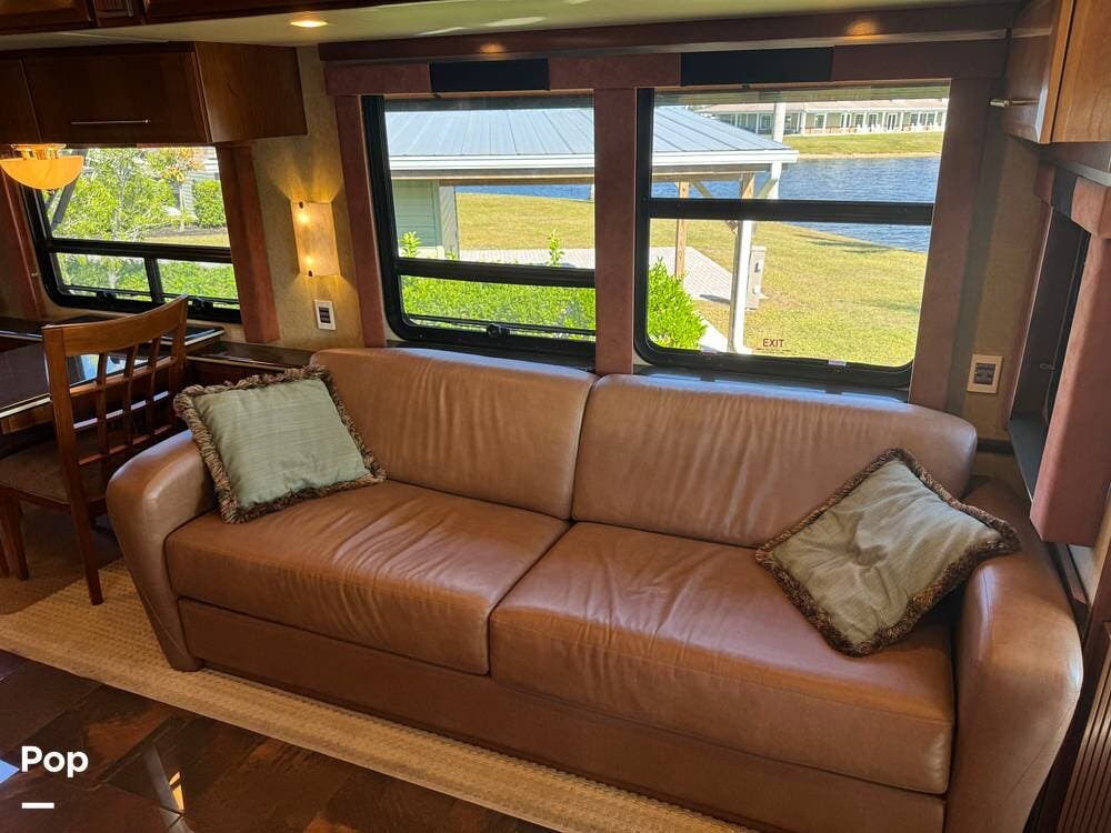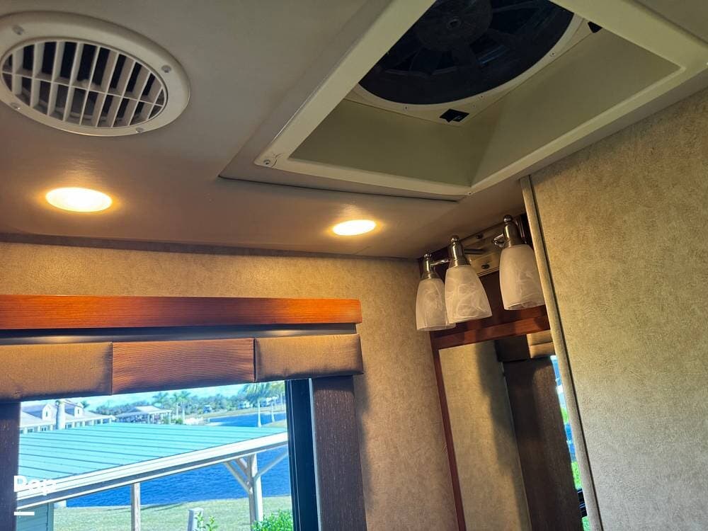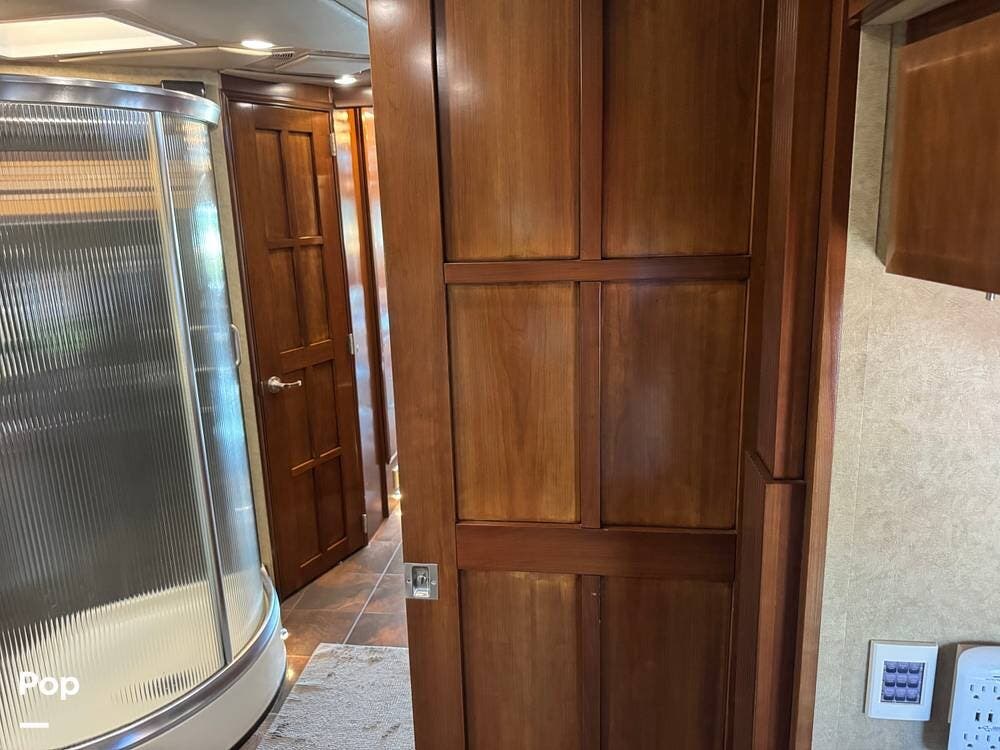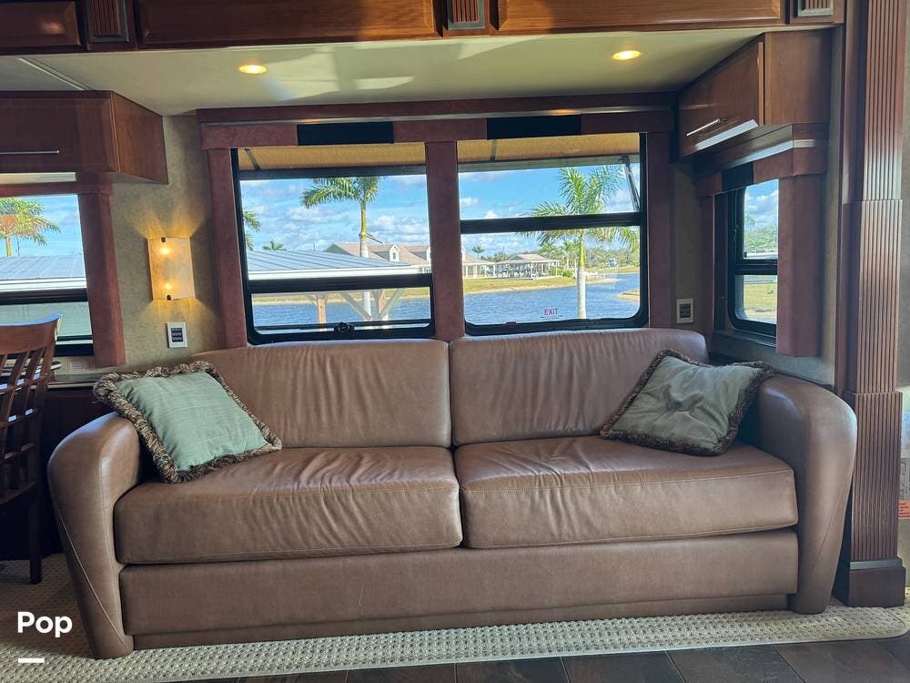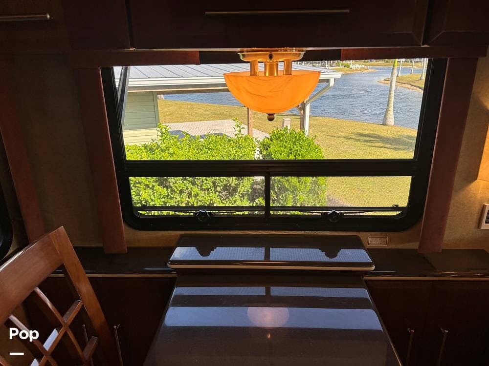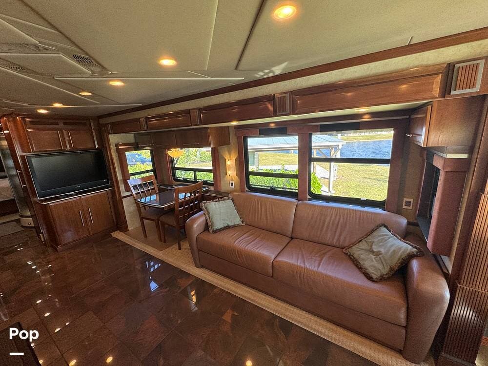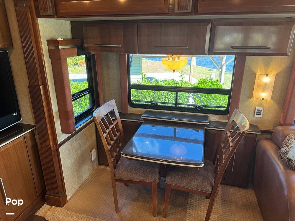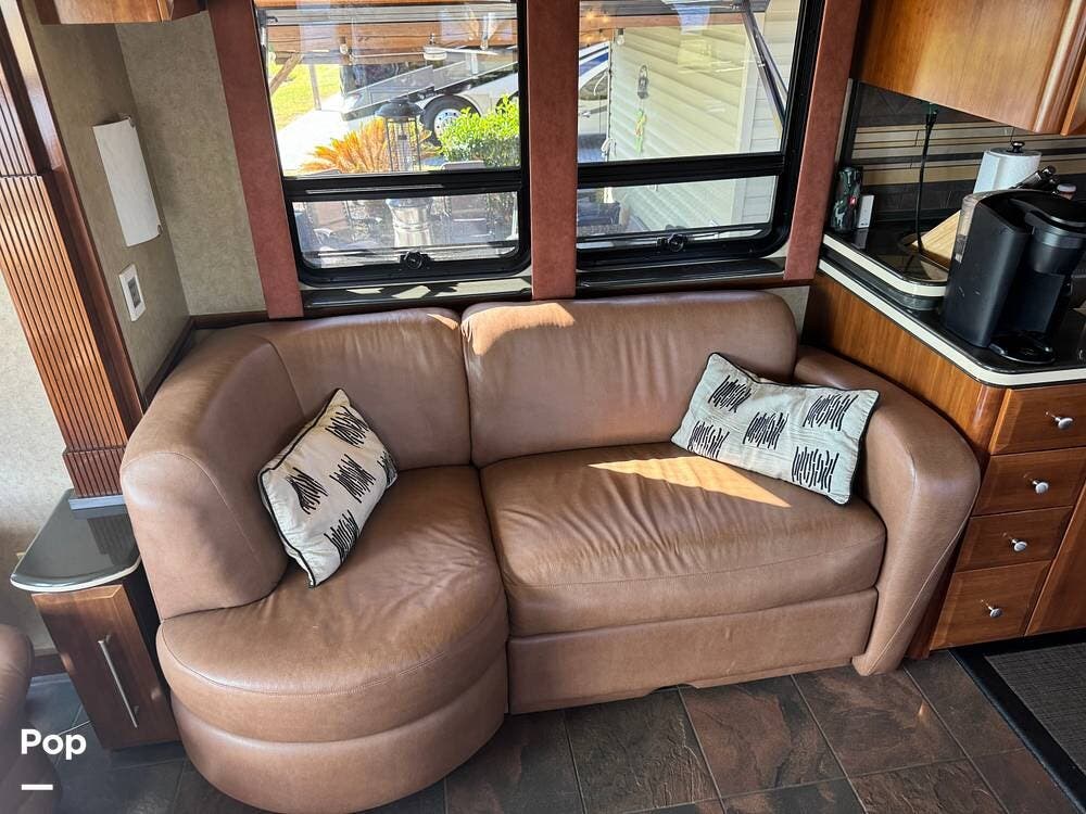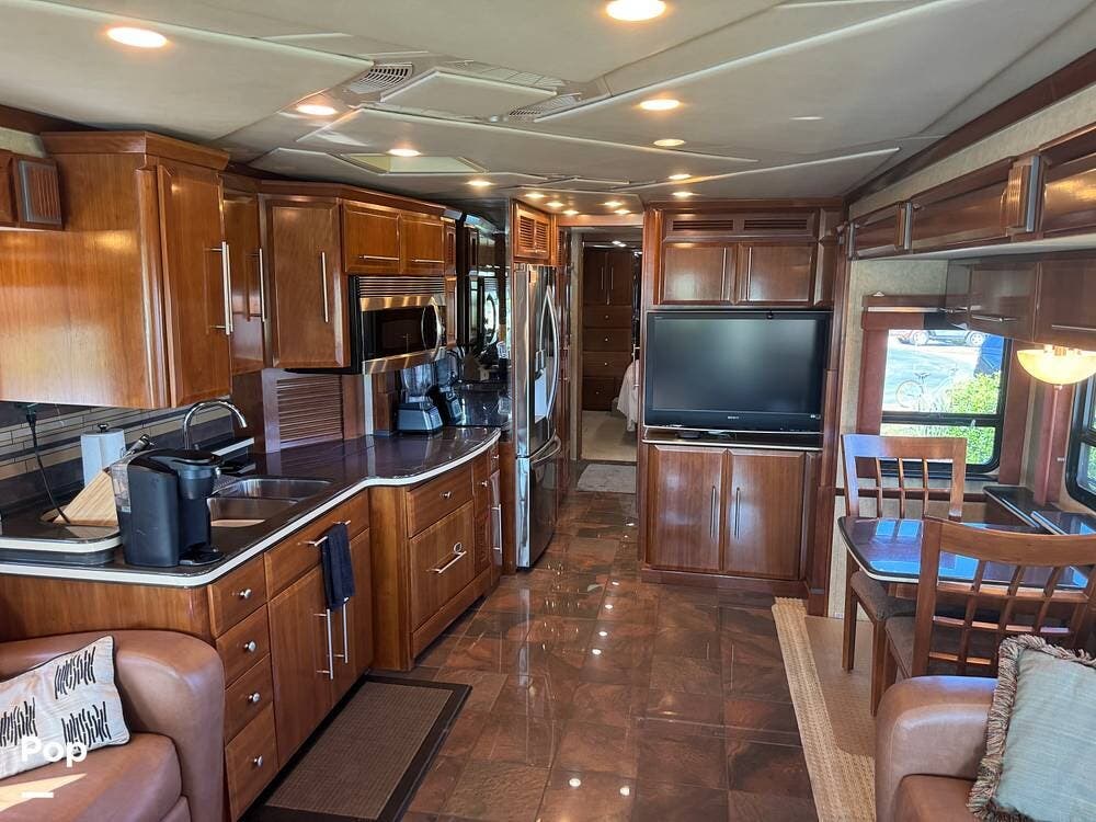 Step inside and you're welcomed by a refined residential interior finished with solid hardwood cabinetry, handcrafted details, and premium materials throughout. The spacious quad-slide floorplan creates a wide-open living area perfect for entertaining or simply stretching out and enjoying the journey. Plush seating, elegant dcor, and expansive windows provide a bright, inviting atmosphere that feels more like a luxury condo than a motorhome.
