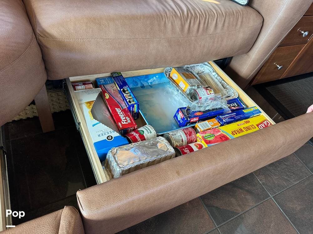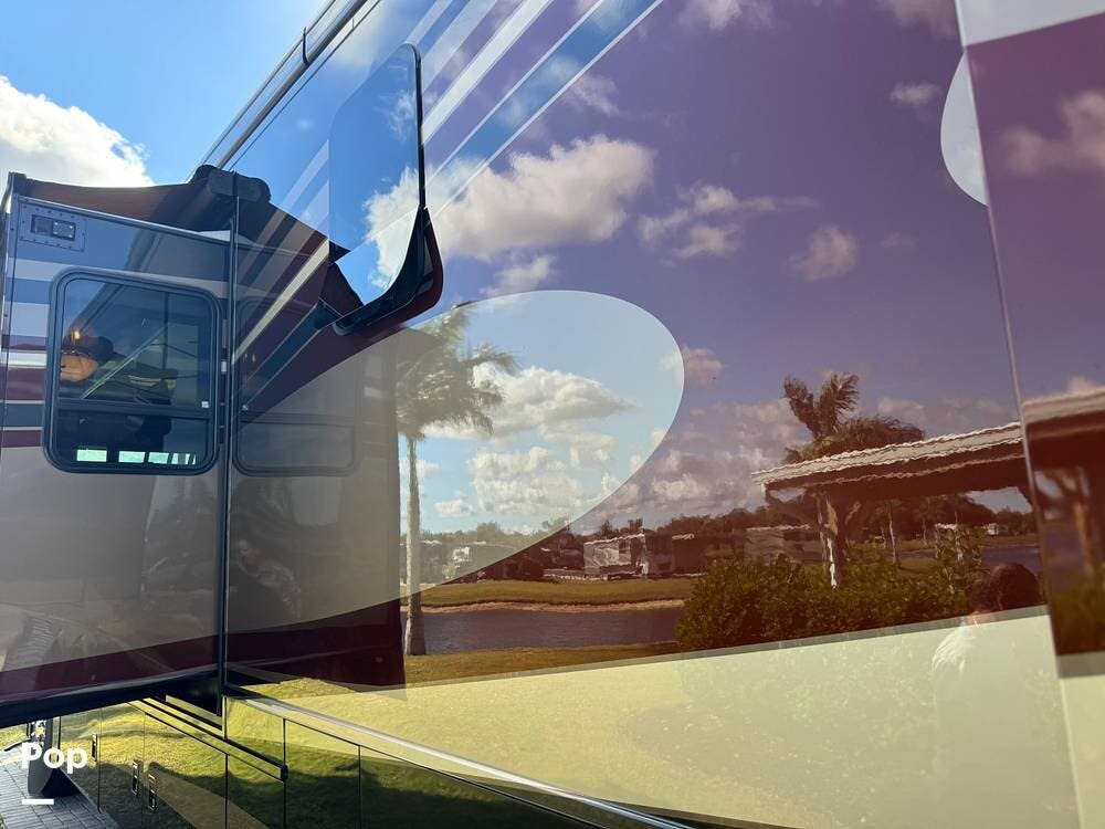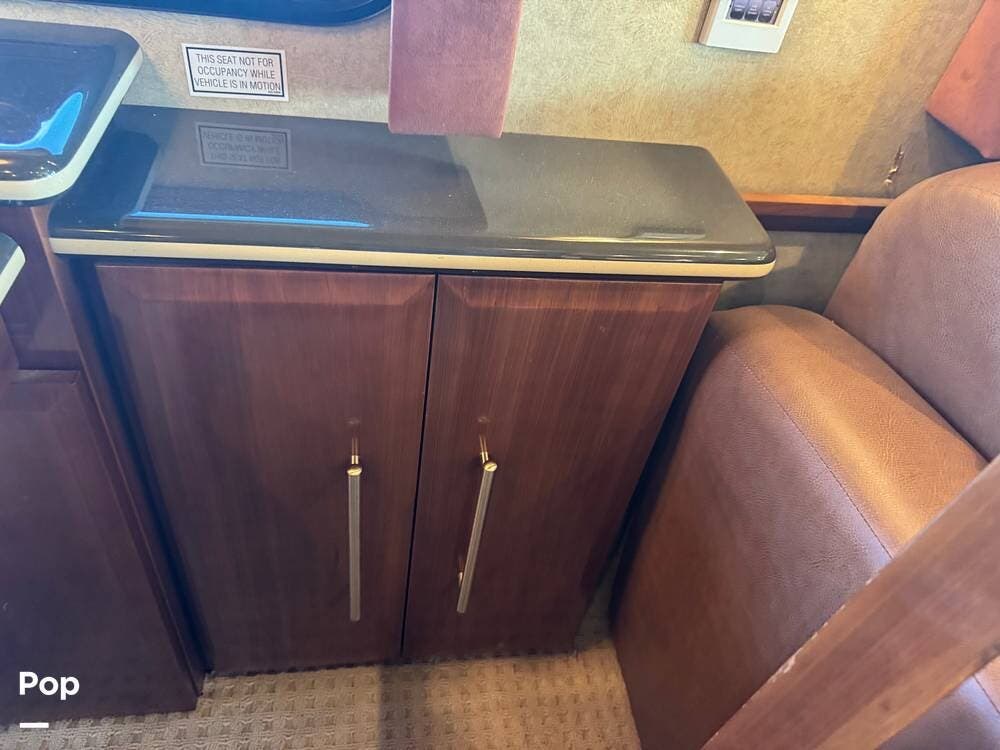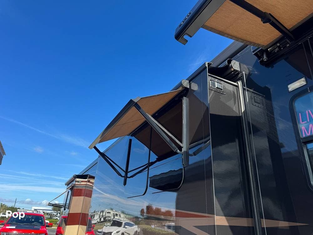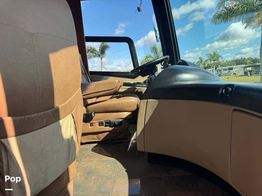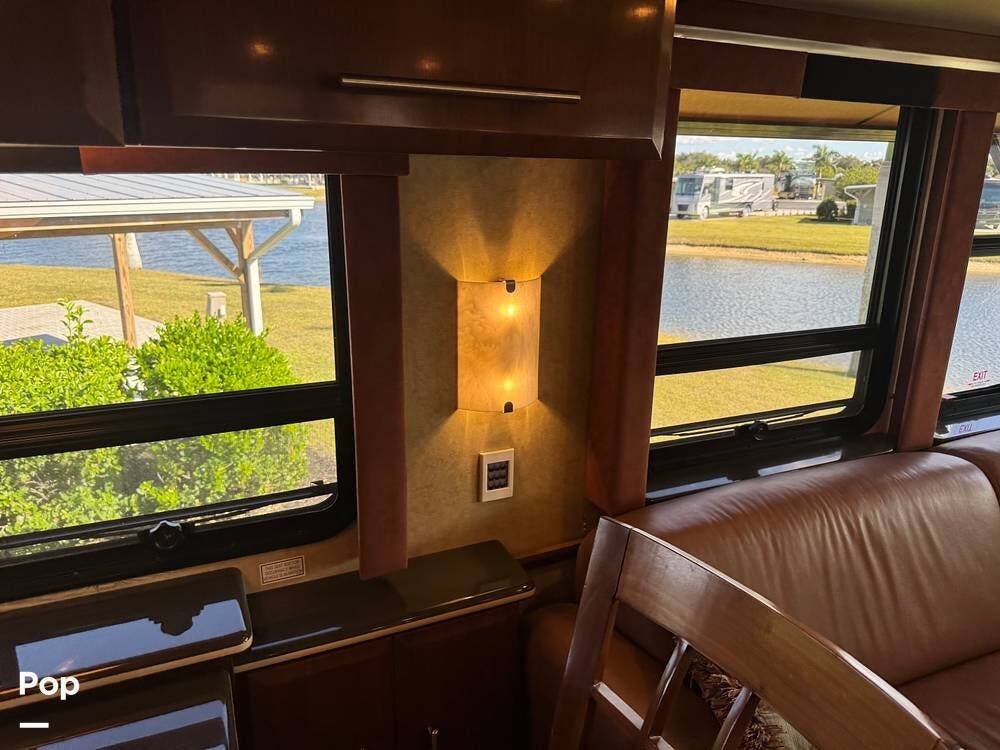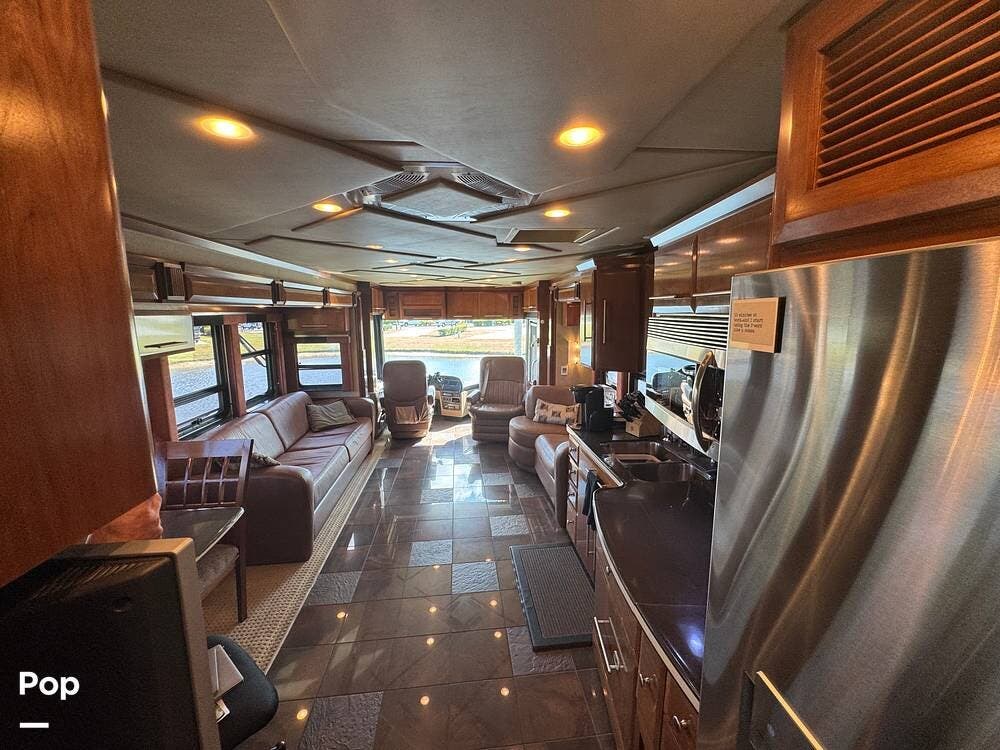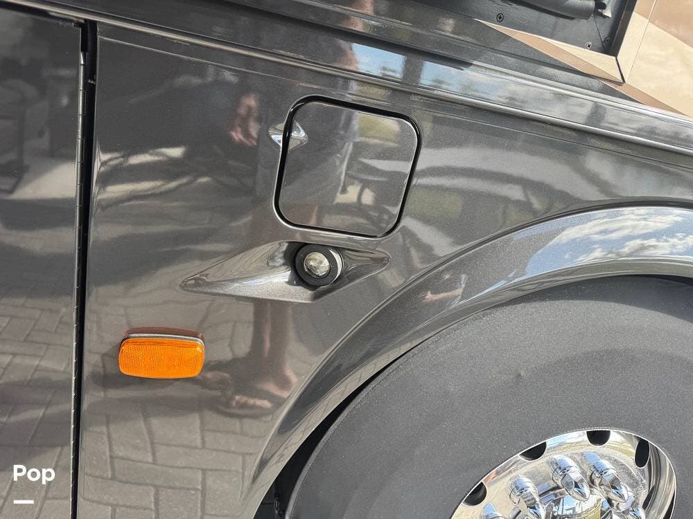 Step inside and you're welcomed by a refined residential interior finished with solid hardwood cabinetry, handcrafted details, and premium materials throughout. The spacious quad-slide floorplan creates a wide-open living area perfect for entertaining or simply stretching out and enjoying the journey. Plush seating, elegant dcor, and expansive windows provide a bright, inviting atmosphere that feels more like a luxury condo than a motorhome.