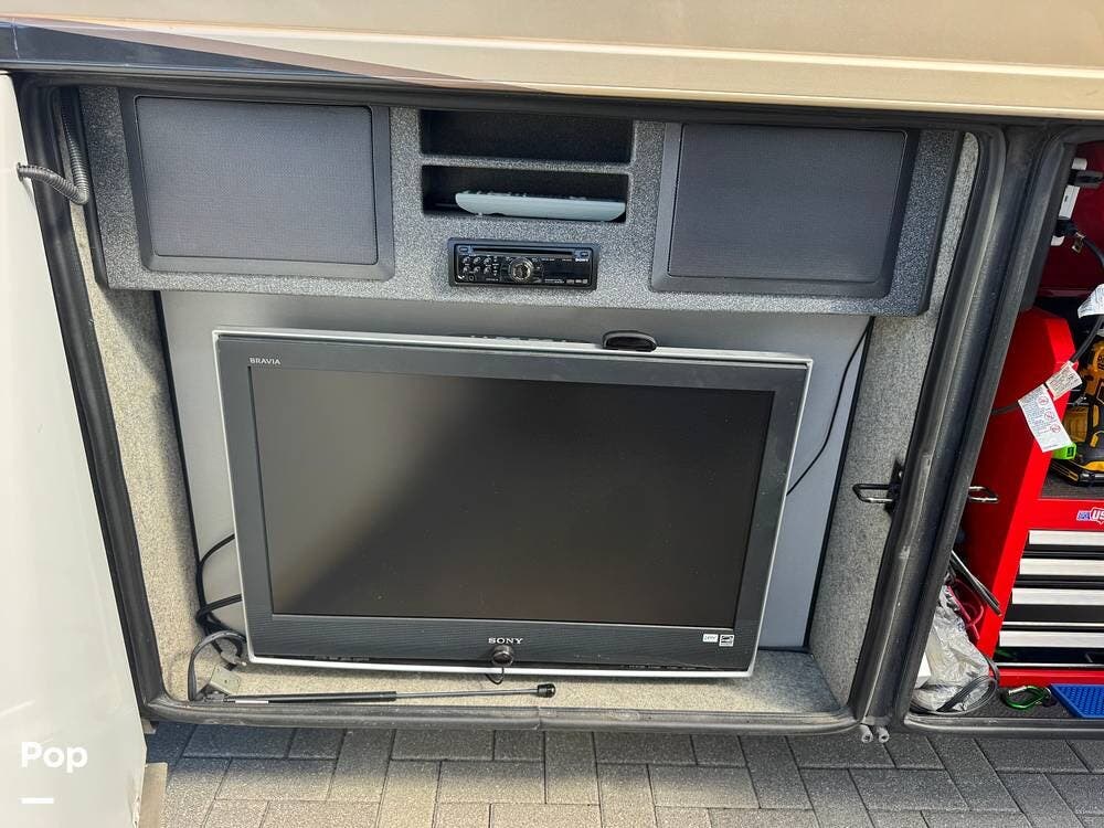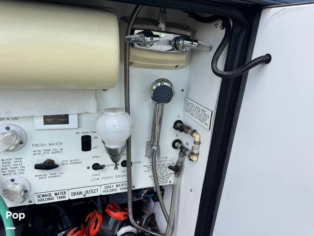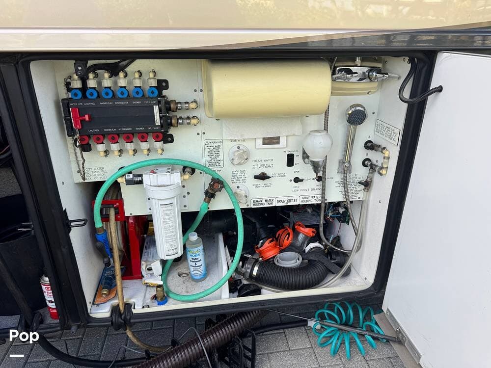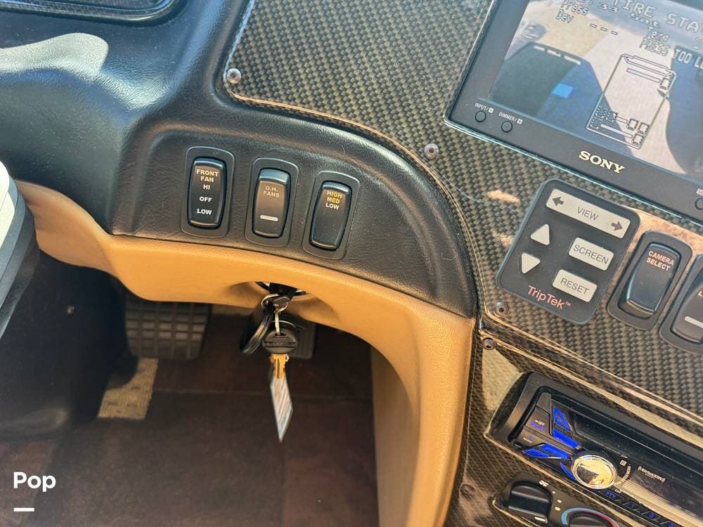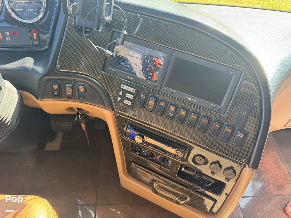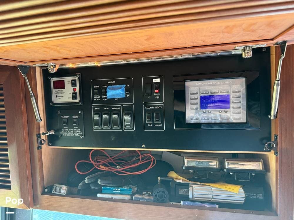 Technology and convenience were ahead of their time in the King Aire. Features include Aqua-Hot hydronic heating, multi-zone climate control, power shades, integrated entertainment systems, and robust electrical systems designed to support extended off-grid stays. Outside, the basement storage is expansive and well-organized, easily accommodating golf clubs, patio furniture, tools, and everything needed for long adventures.