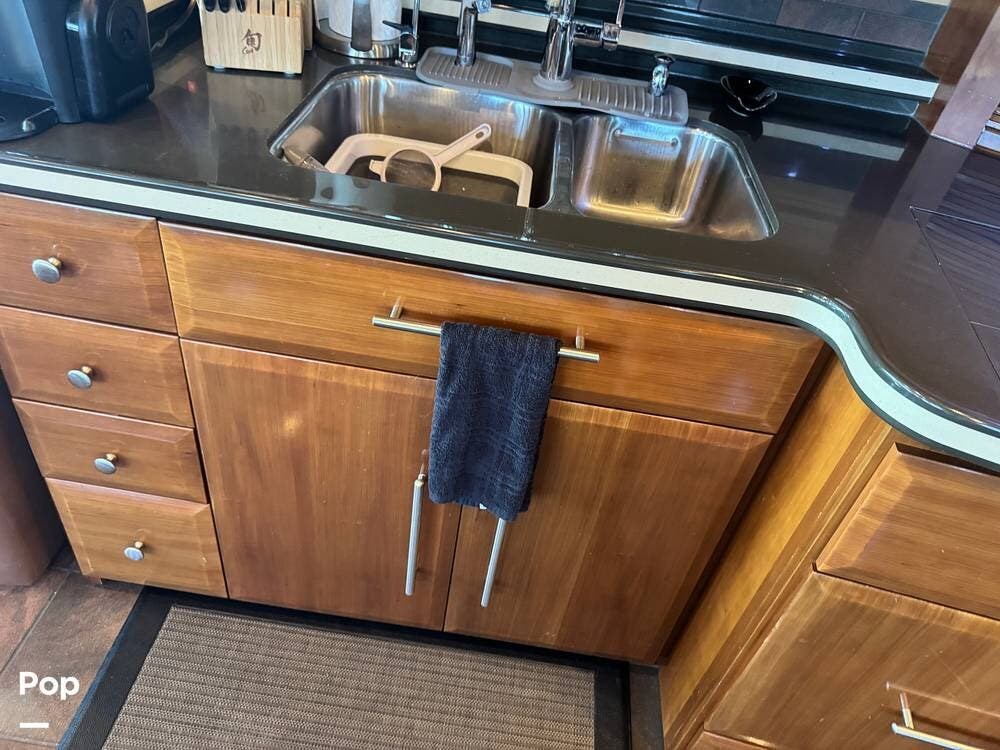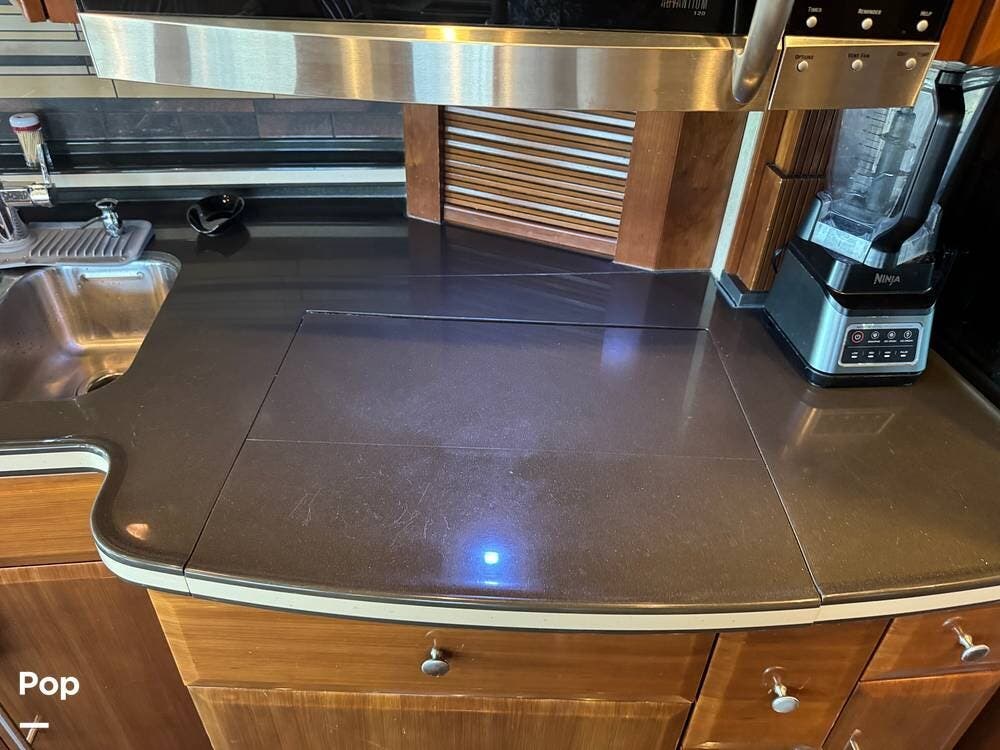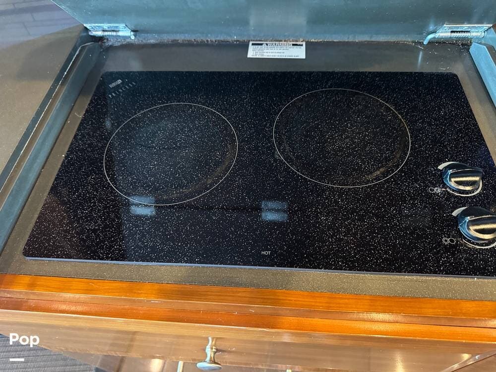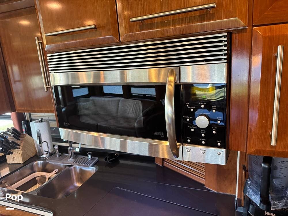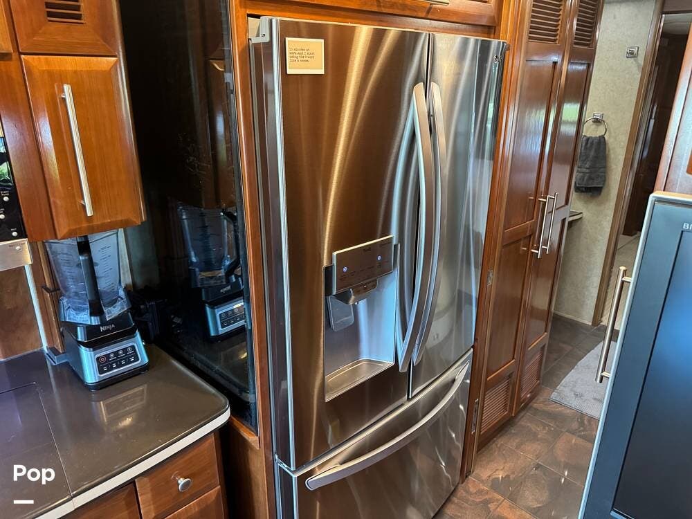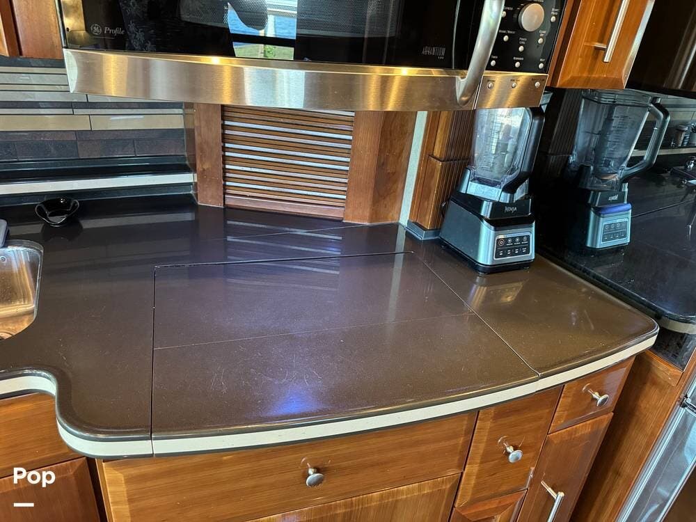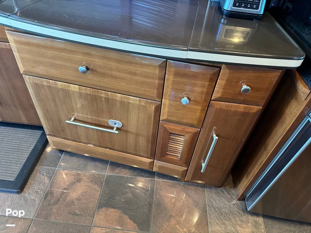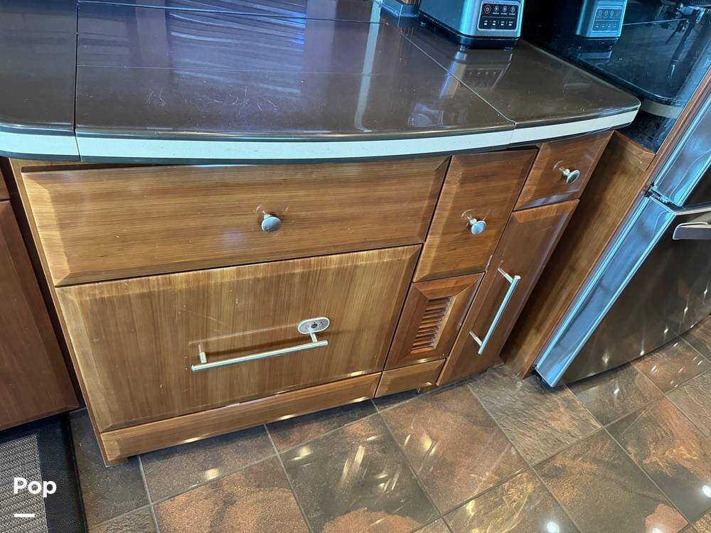 The gourmet kitchen is thoughtfully designed for extended travel, featuring solid-surface countertops, a residential-style refrigerator, convection microwave, induction cooktop, and ample cabinet and large pantry storage. Whether you're preparing a quick breakfast or hosting friends at the campground, this kitchen makes every meal enjoyable.