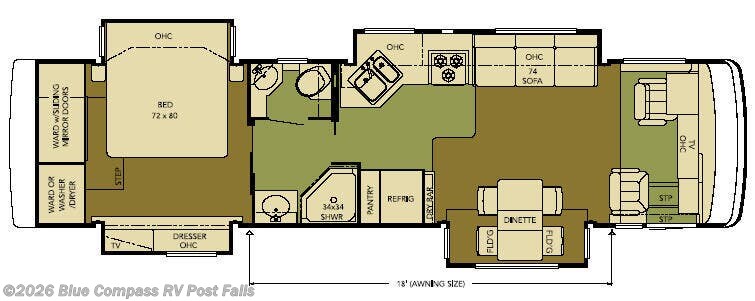 Quad Slide, Rear King Bed Slide, Step Up To Ward. w/Sliding Mirrored Doors, Wash/Dryer or 2nd Ward., TV w/Storage Below/Dresser Slideout, Lav., Angle Shower, Stool Room w/Lav., Pantry, Refrigerator, Dry Bar, Dinette w/4 Chairs Slideout, Sofa/3 Burner Range/Double Kitchen Sink Slideout, TV Above Cab Area and More.