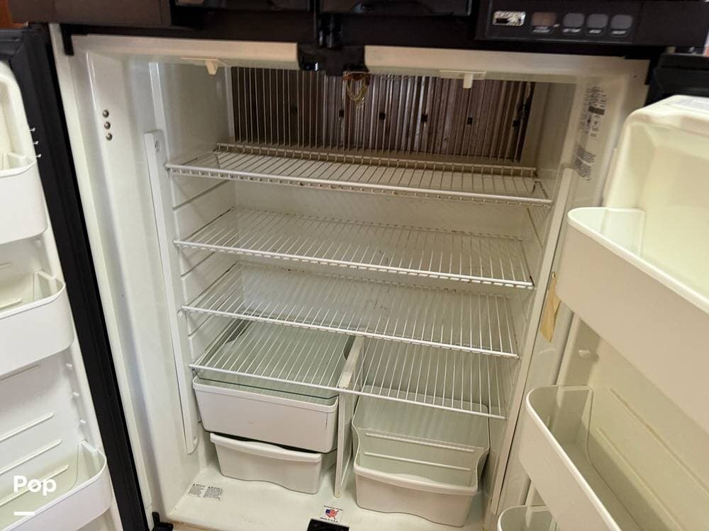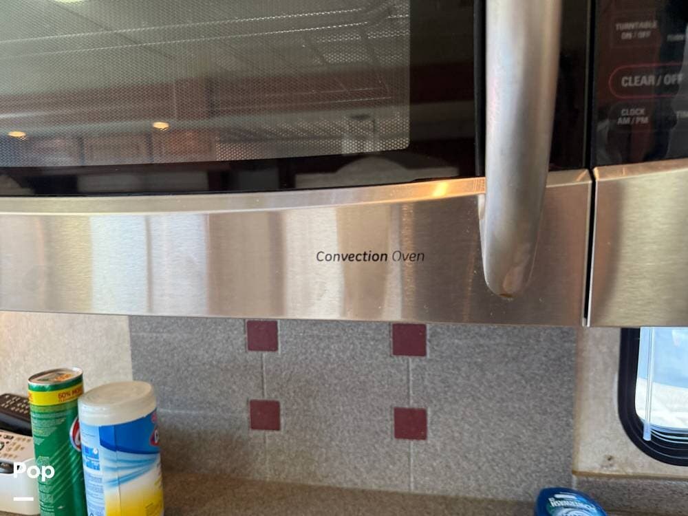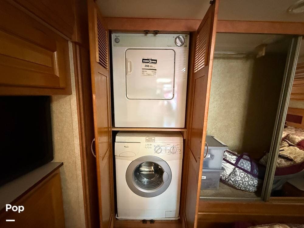Full-time living is an option with the included stacked washer and dryer, and the fully equipped kitchen includes solid surface countertops, a cooktop, and microwave/convection oven.
