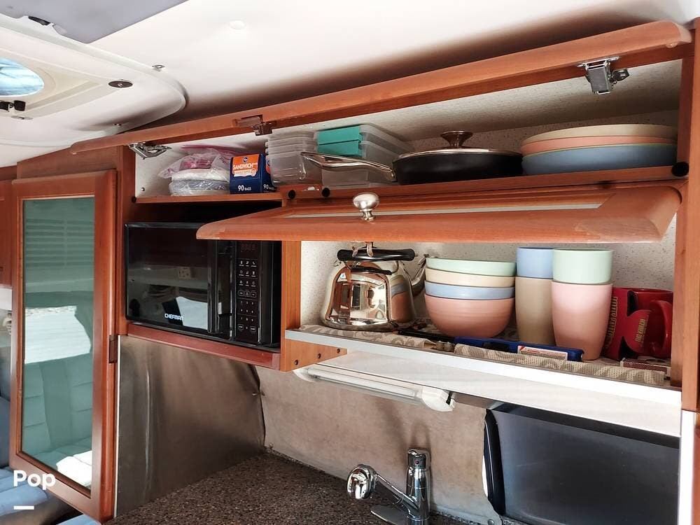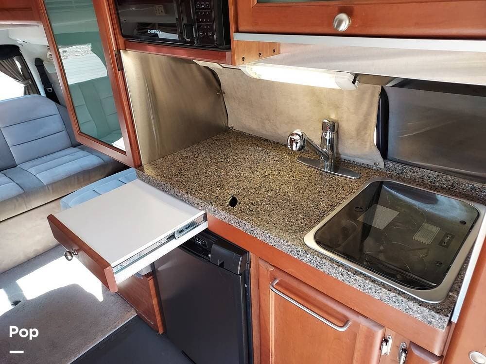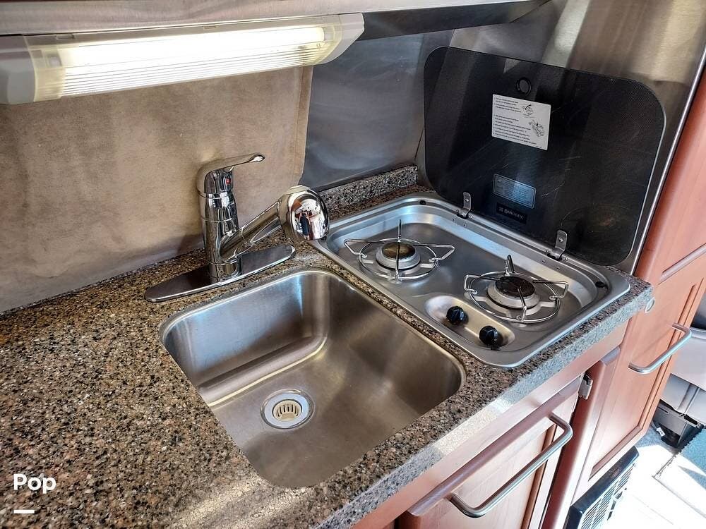 The galley kitchen is equipped with a two-burner cooktop, refrigerator, microwave, stainless steel sink, and plenty of storage, allowing you to prepare meals on the road with ease.