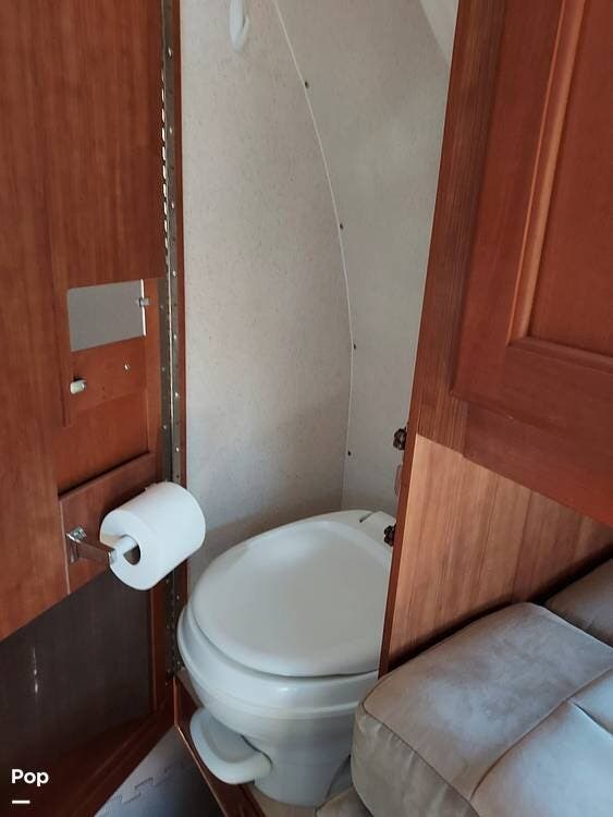 The compact bathroom features a marine-style toilet, sink, and shower, providing the essentials without compromising your living space.