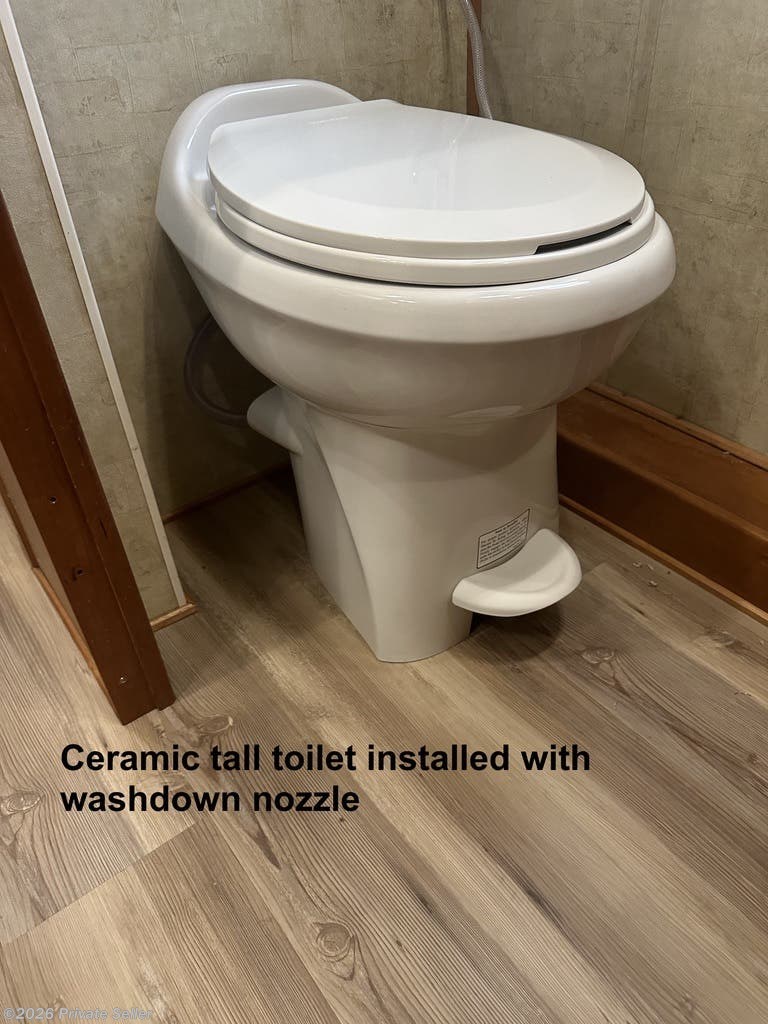 - Plastic toilet replaced with a new ceramic toilet with wash down nozzle installed.