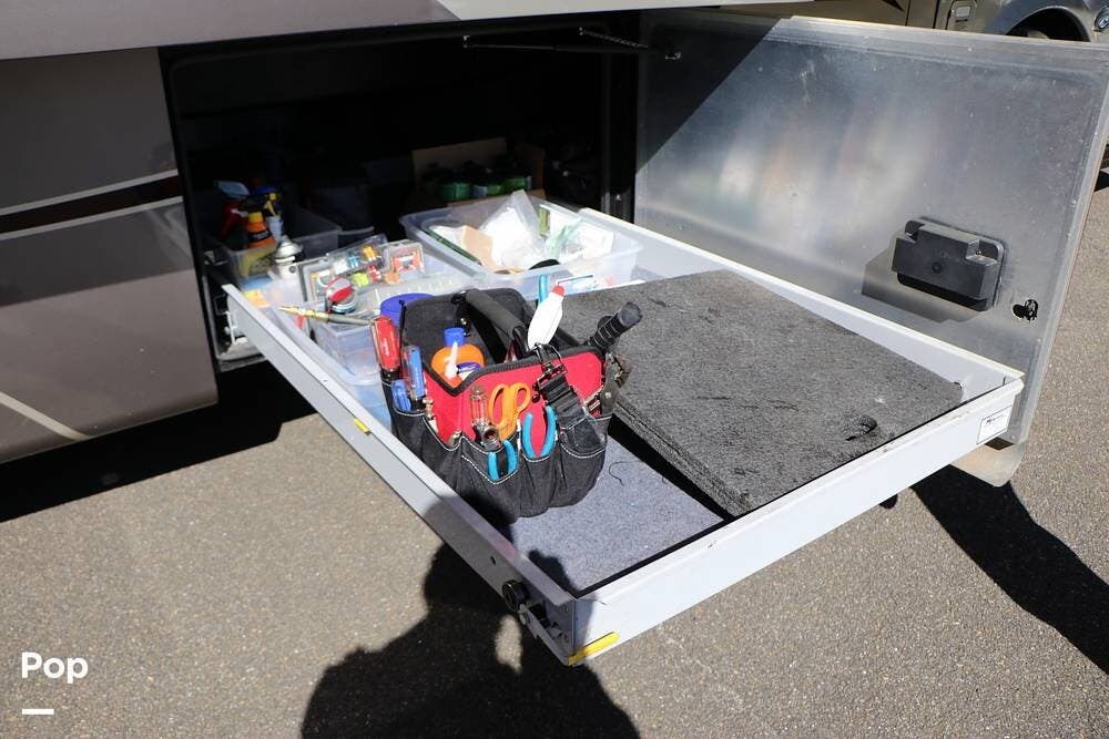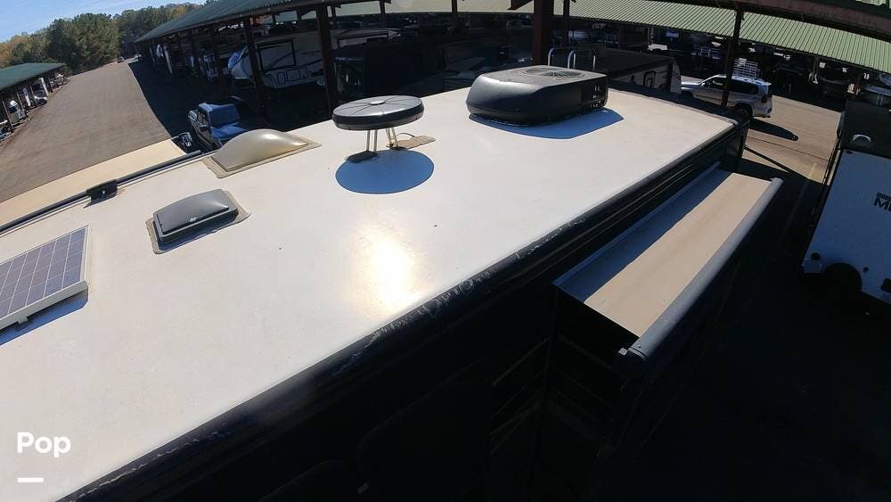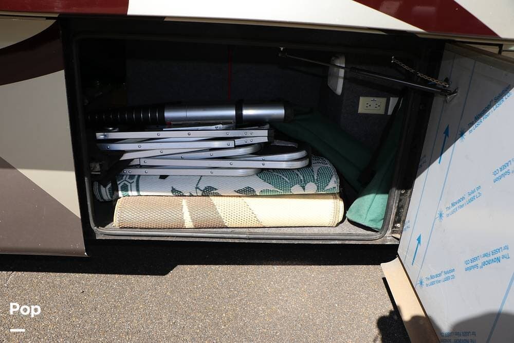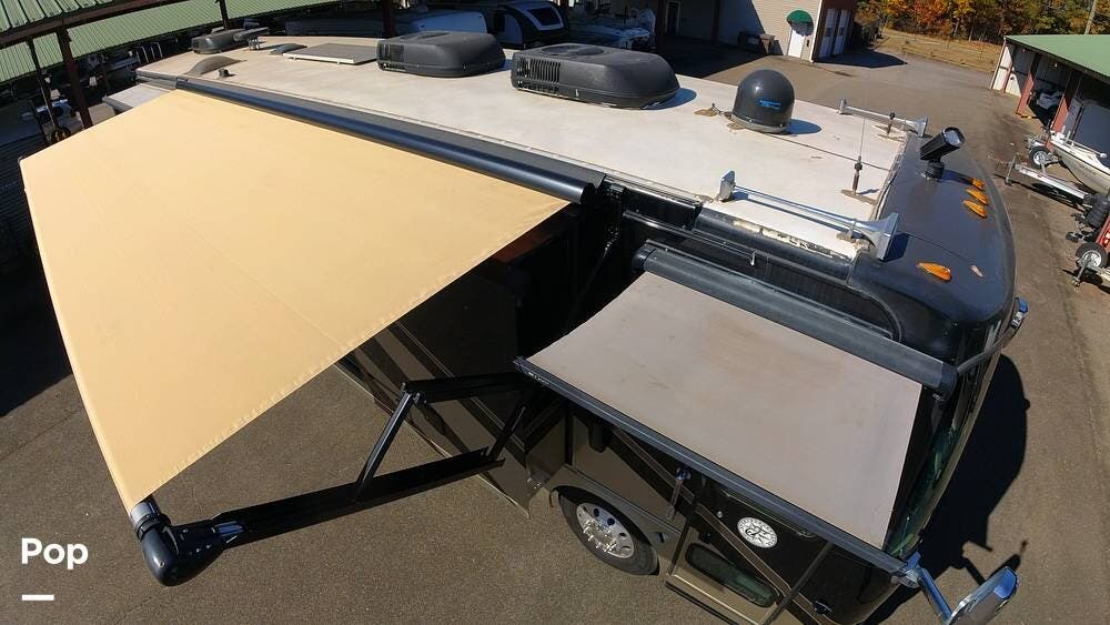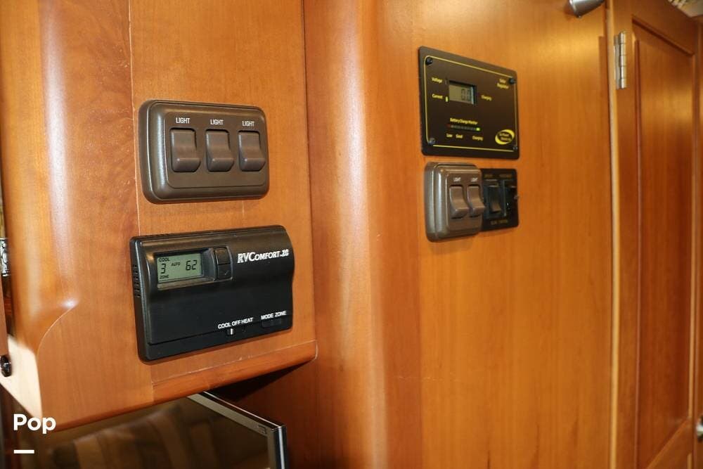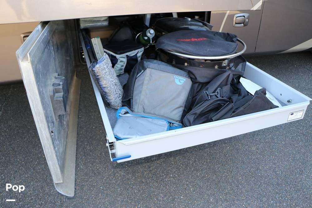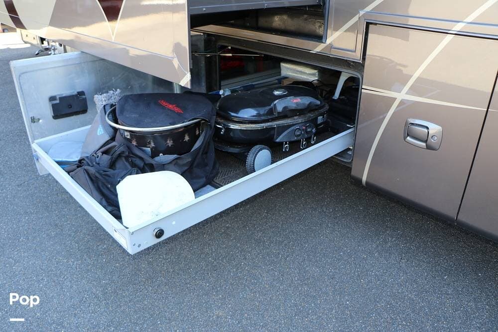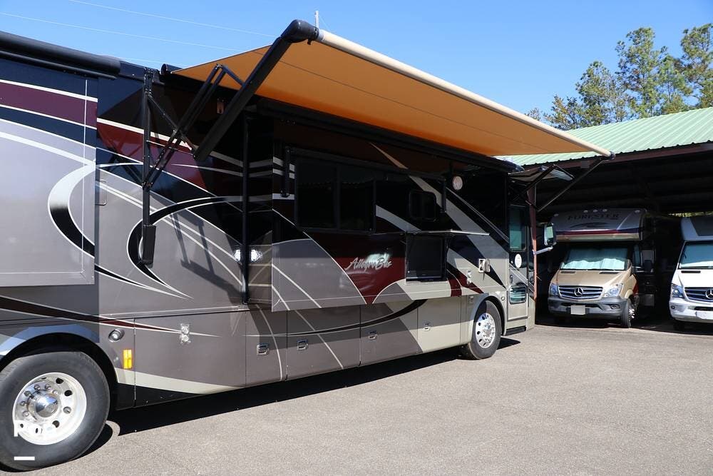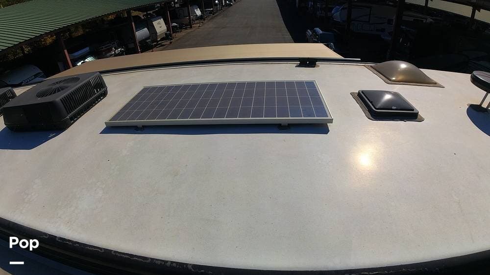 The two easy-access slide storage trays provide quick and easy access to stored items in the full-width storage compartments. There is a roof-mounted Solar Panel and a corresponding solar converter to keep the house batteries fully charged when on the go. The three 13,500 BTU roof AC systems each have heat pumps, and the unit is equipped with two 30,000 BTU furnaces as well, so keeping warm is not an issue.