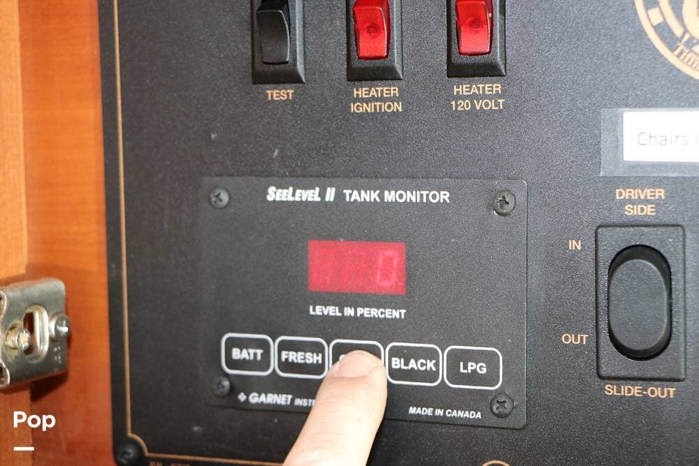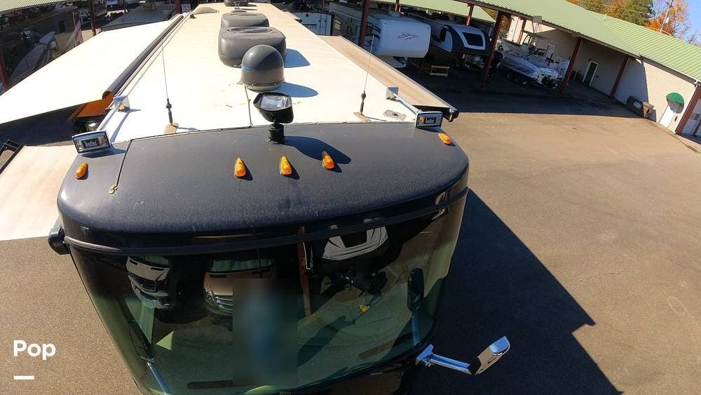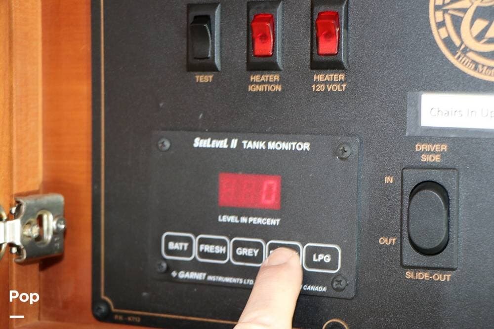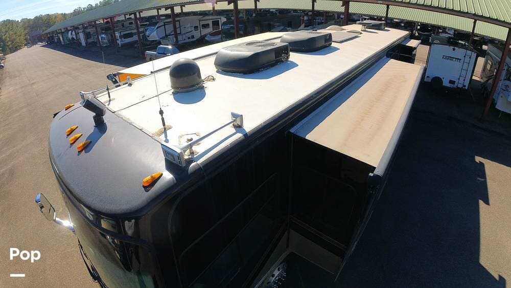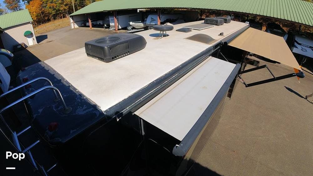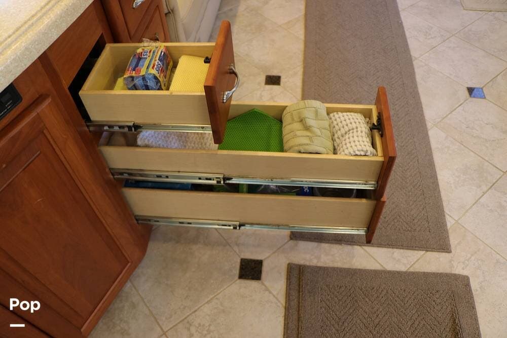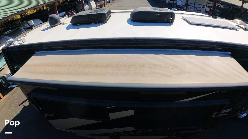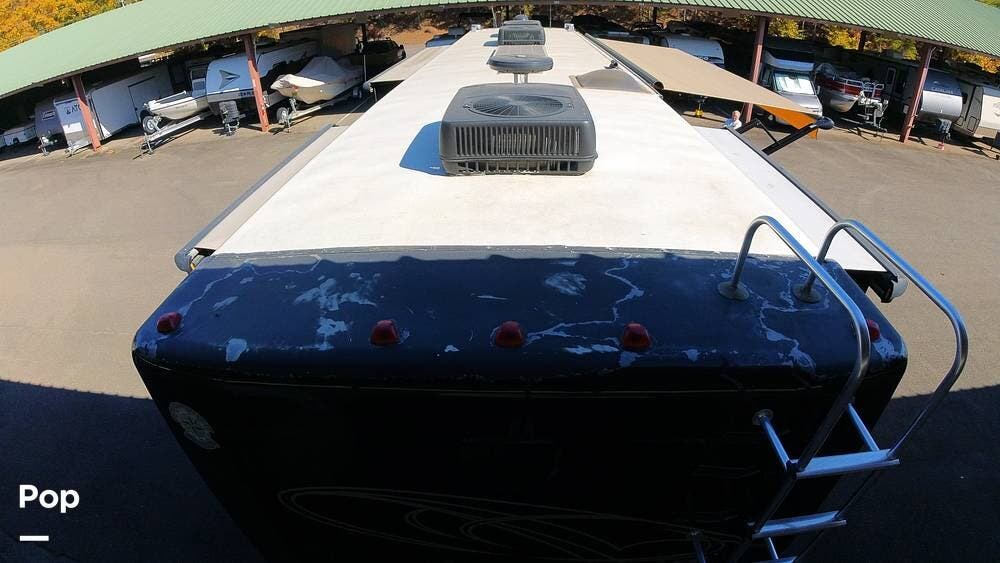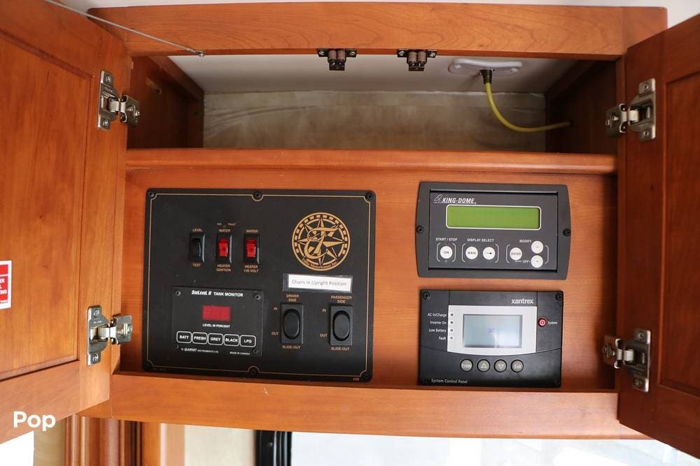 The two easy-access slide storage trays provide quick and easy access to stored items in the full-width storage compartments. There is a roof-mounted Solar Panel and a corresponding solar converter to keep the house batteries fully charged when on the go. The three 13,500 BTU roof AC systems each have heat pumps, and the unit is equipped with two 30,000 BTU furnaces as well, so keeping warm is not an issue.