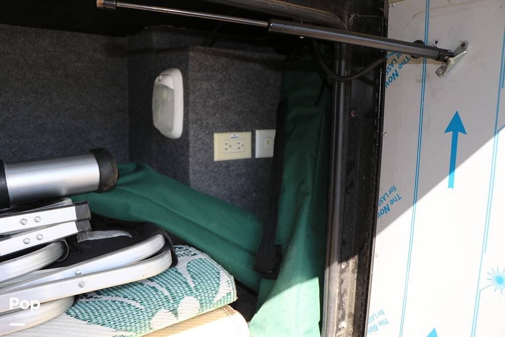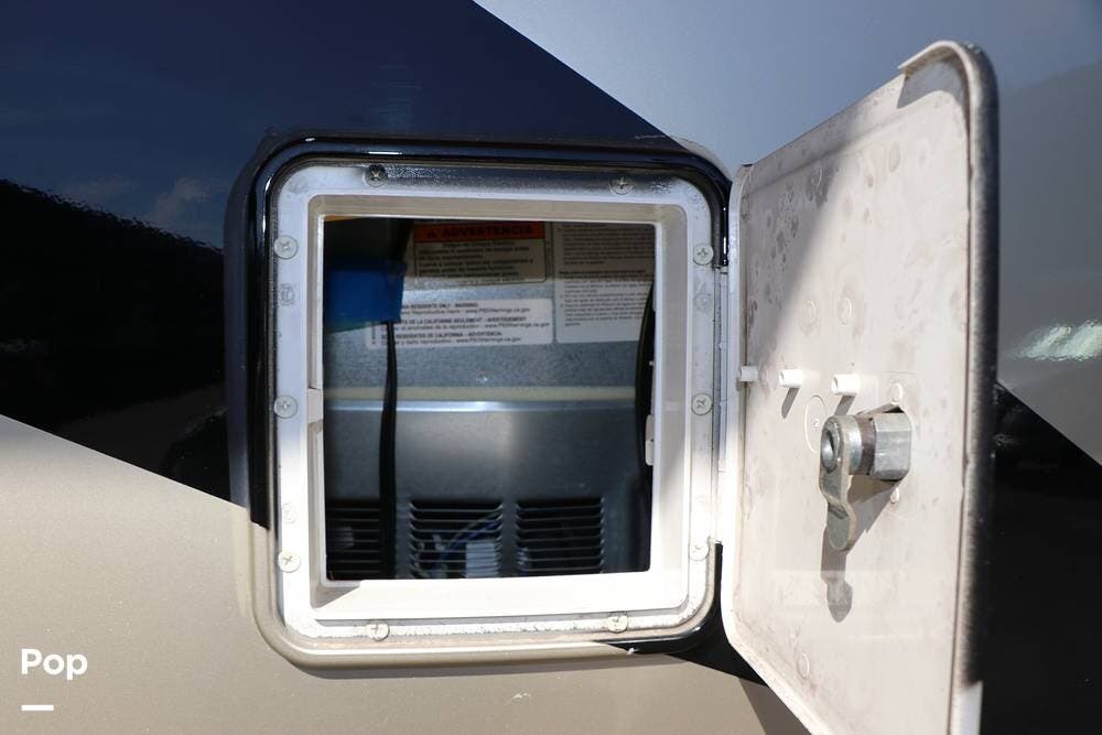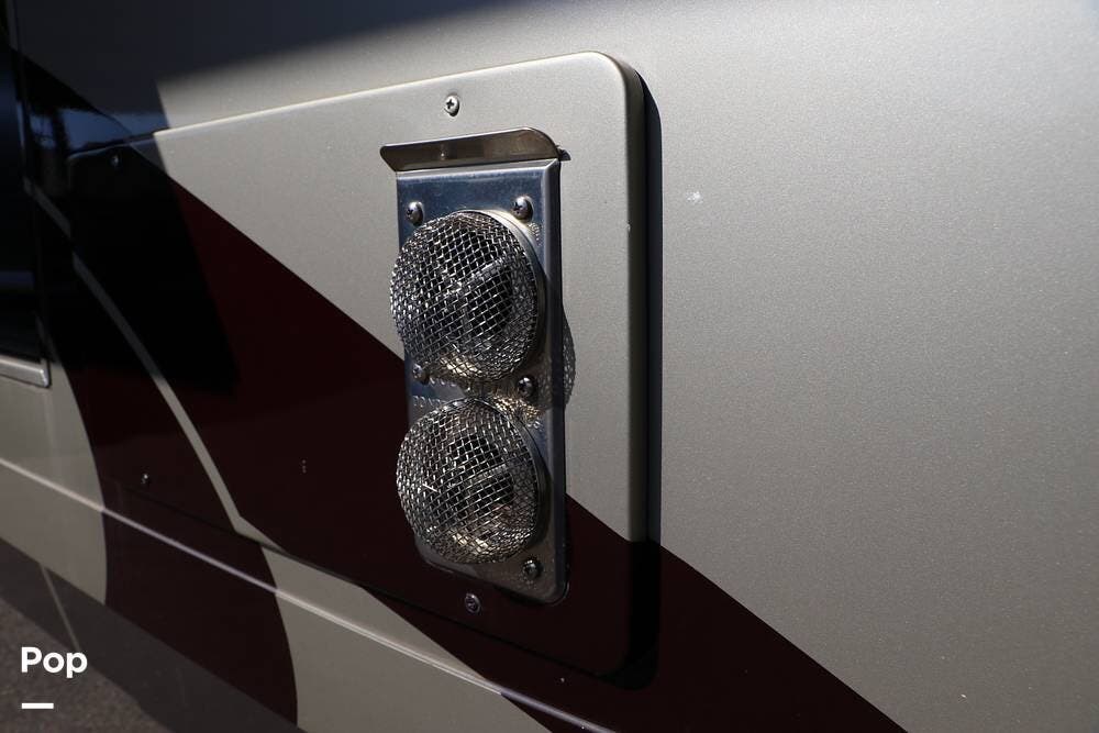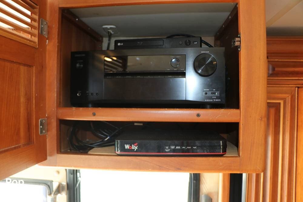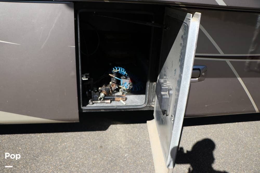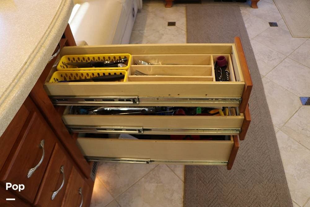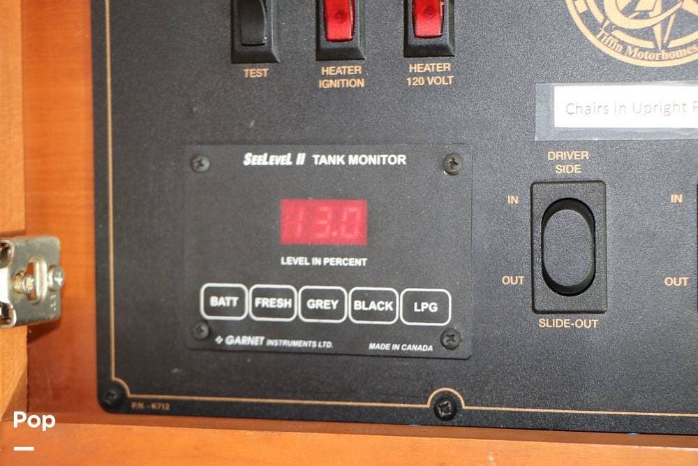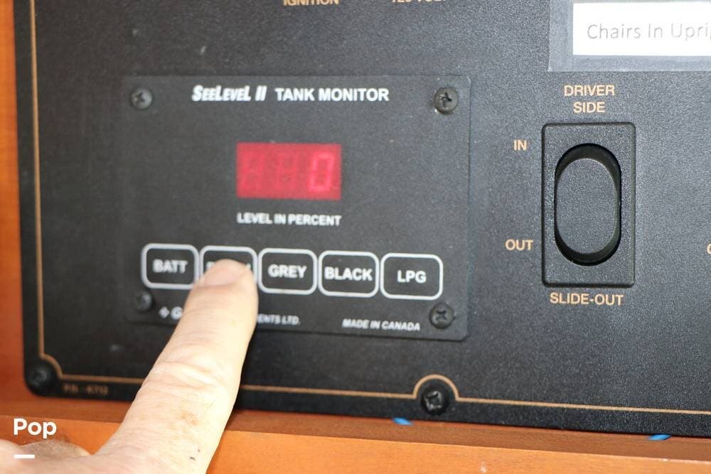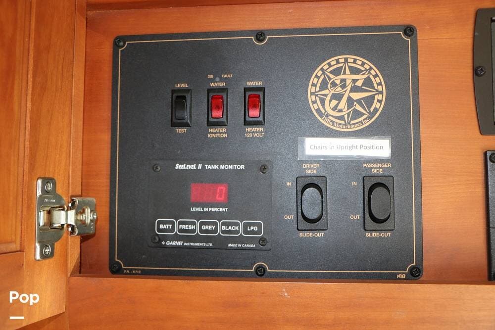 The two easy-access slide storage trays provide quick and easy access to stored items in the full-width storage compartments. There is a roof-mounted Solar Panel and a corresponding solar converter to keep the house batteries fully charged when on the go. The three 13,500 BTU roof AC systems each have heat pumps, and the unit is equipped with two 30,000 BTU furnaces as well, so keeping warm is not an issue.