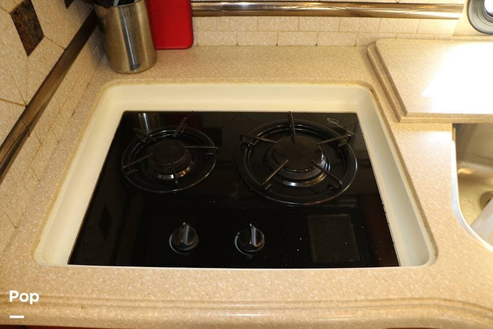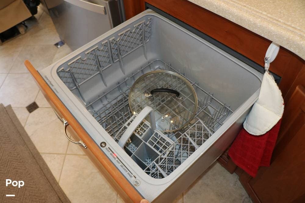 The galley includes a Convection/Microwave oven, a two-burner gas cooktop with matching solid-surface covers, and a Double Kitchen Sink with matching covers to the solid-surface countertops that run throughout the RV. The Dishwasher is another nice feature of the Galley. The lovely cabinets provide plenty of storage space throughout the entire RV.