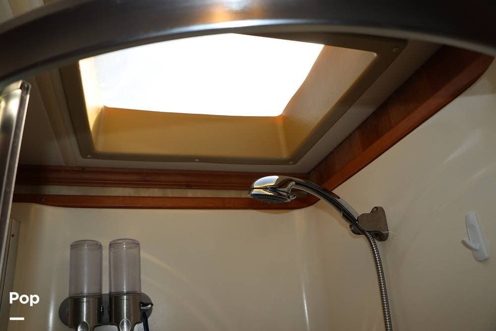 The full bath is on your left as you head toward the master bedroom. It features a large corner shower with a frosted glass sliding door and a skylight overhead for lots of natural light. There is a single sink with a medicine cabinet and a linen cabinet over the toilet.
