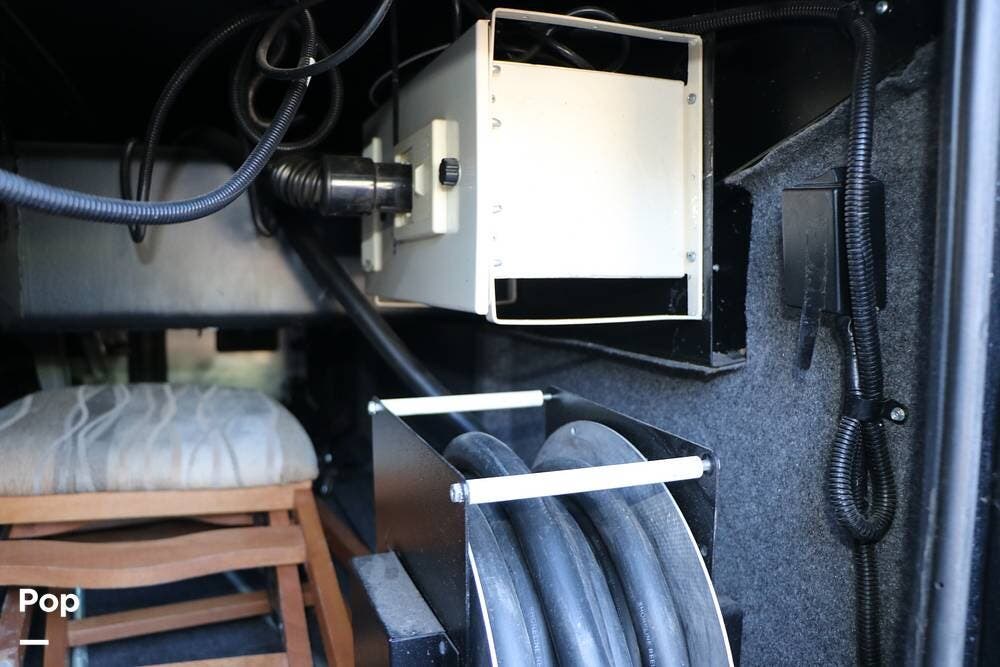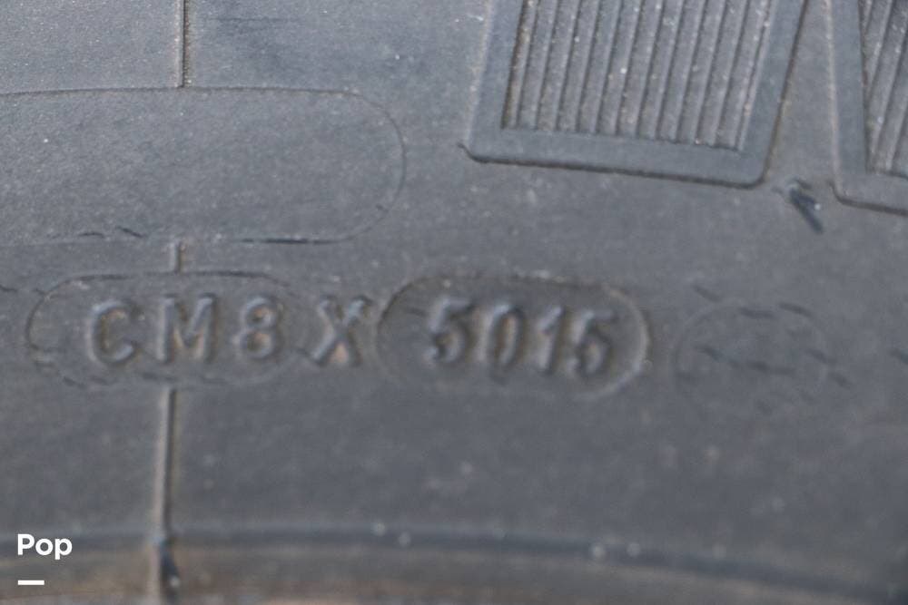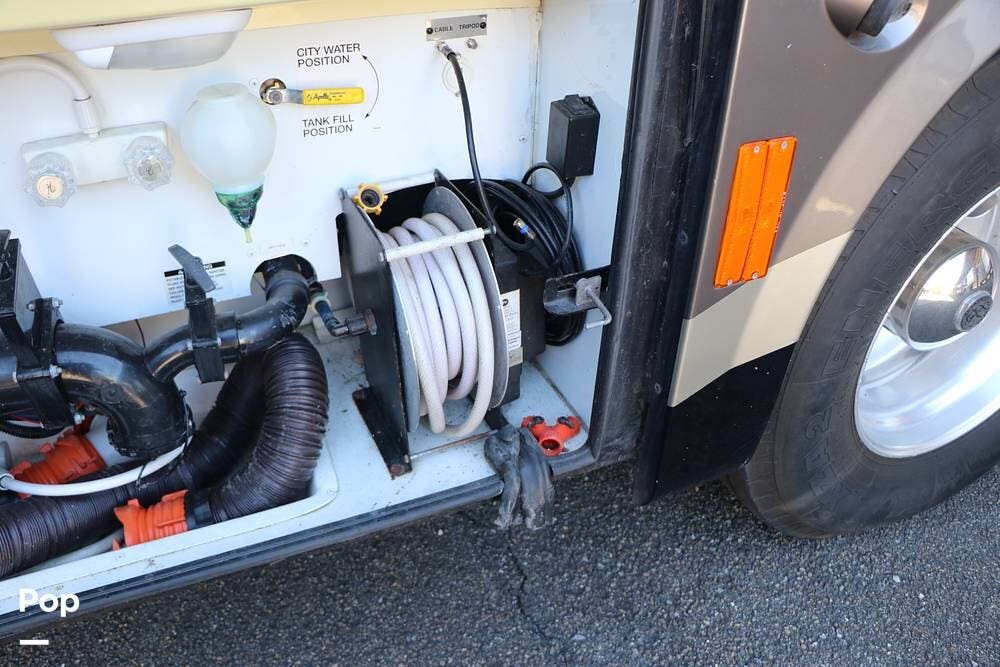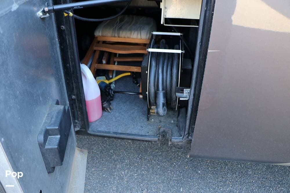 Outside, the large power patio awning was replaced in 2025. There is an entry door awning (electric) and slide-out toppers, plus several manual window awnings. The unit is equipped with power take-up reels for both the 50 Amp Power Cord and the freshwater hose.