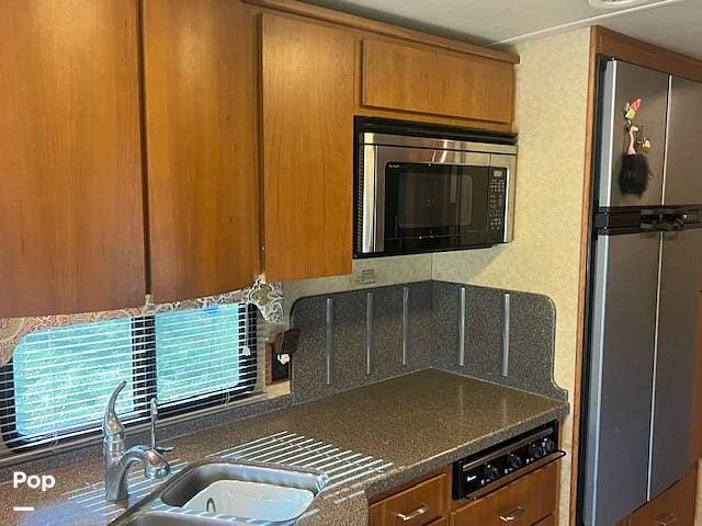 The gally is well equipped, with a large side-by-side refrigerator and freezer.