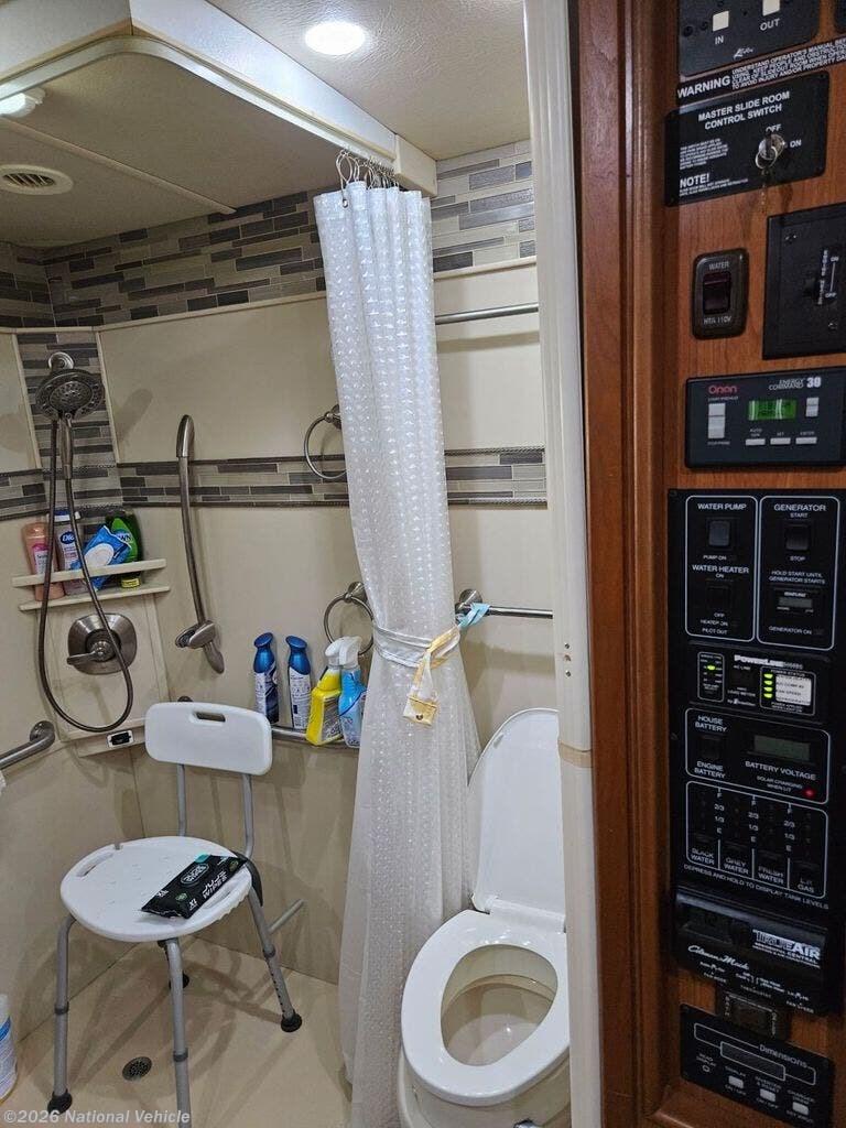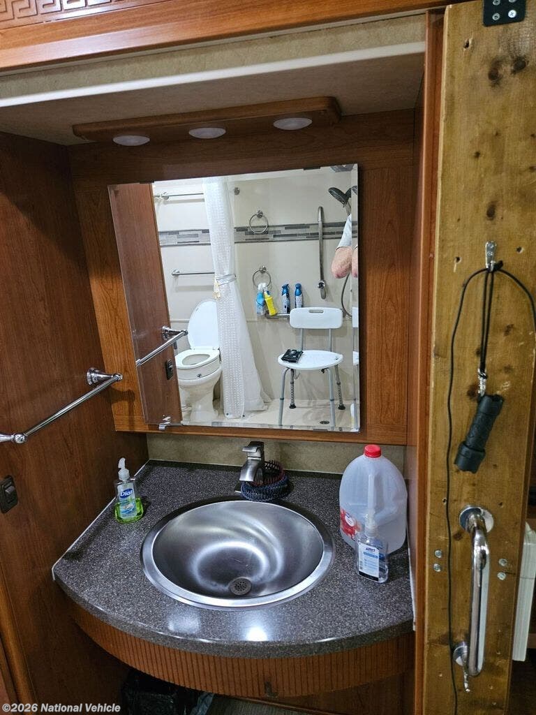 This coach features a bathroom complete with shower, toilet, and a sink with a medicine cabinet above for your convenience.