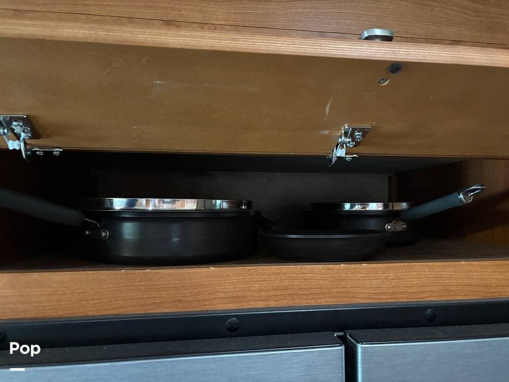 Behind the cockpit, euro chairs with ottomans, a pull-out table, and end table cabinet create a versatile and comfortable living area.