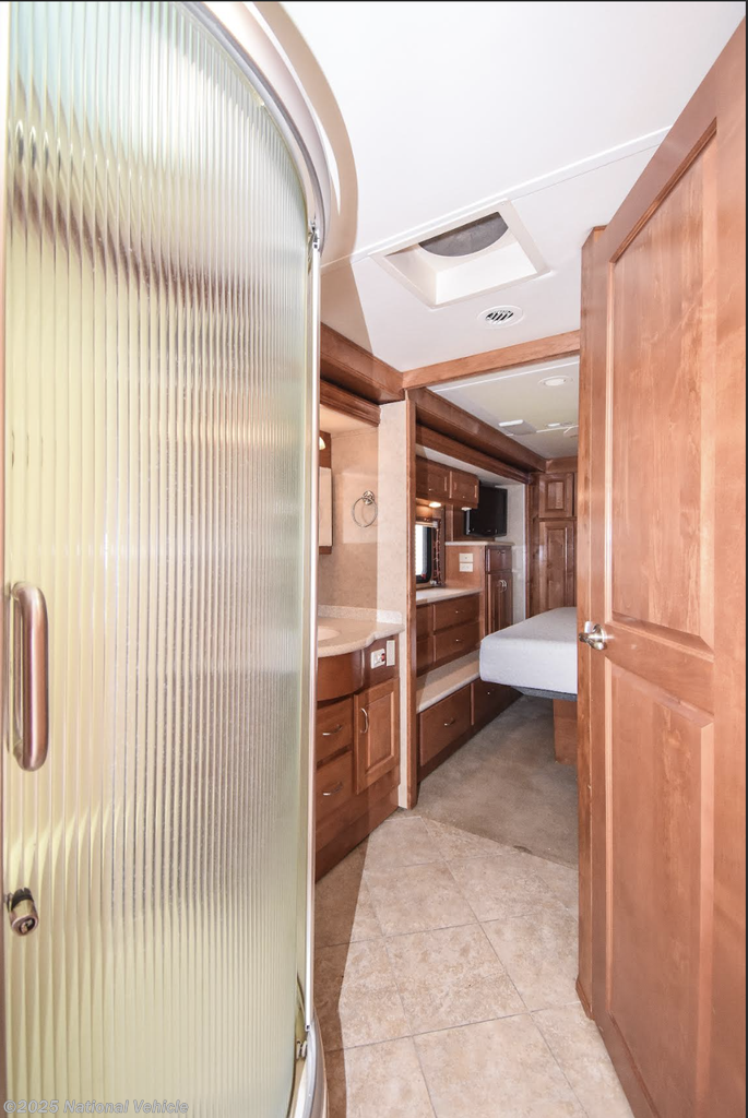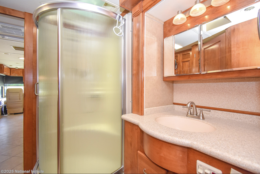 This coach features a bathroom complete with shower, toilet, and a sink with a medicine cabinet above for your convenience.