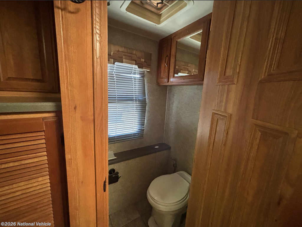 This coach features a bathroom complete with shower, toilet, and a sink with a medicine cabinet above for your convenience.