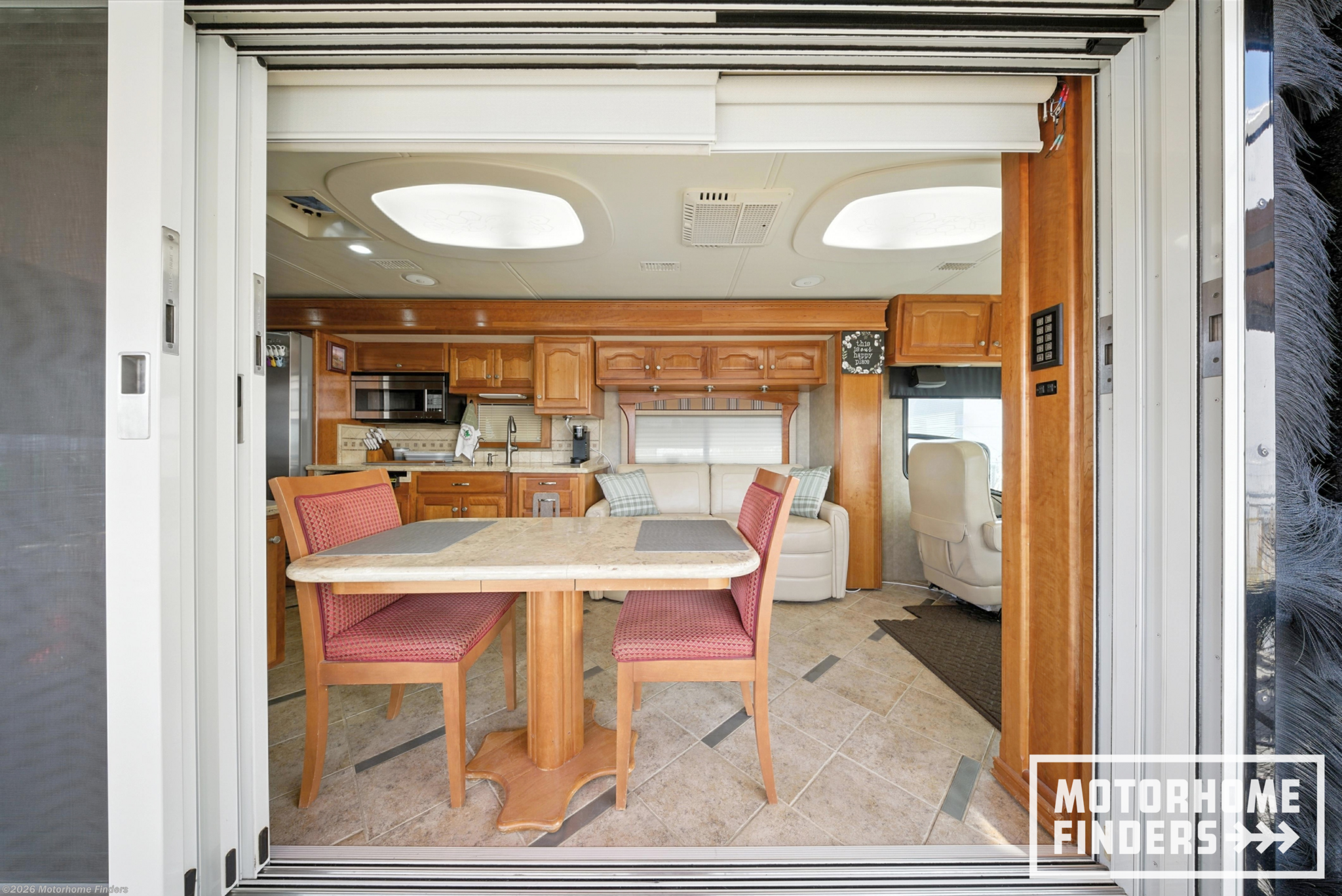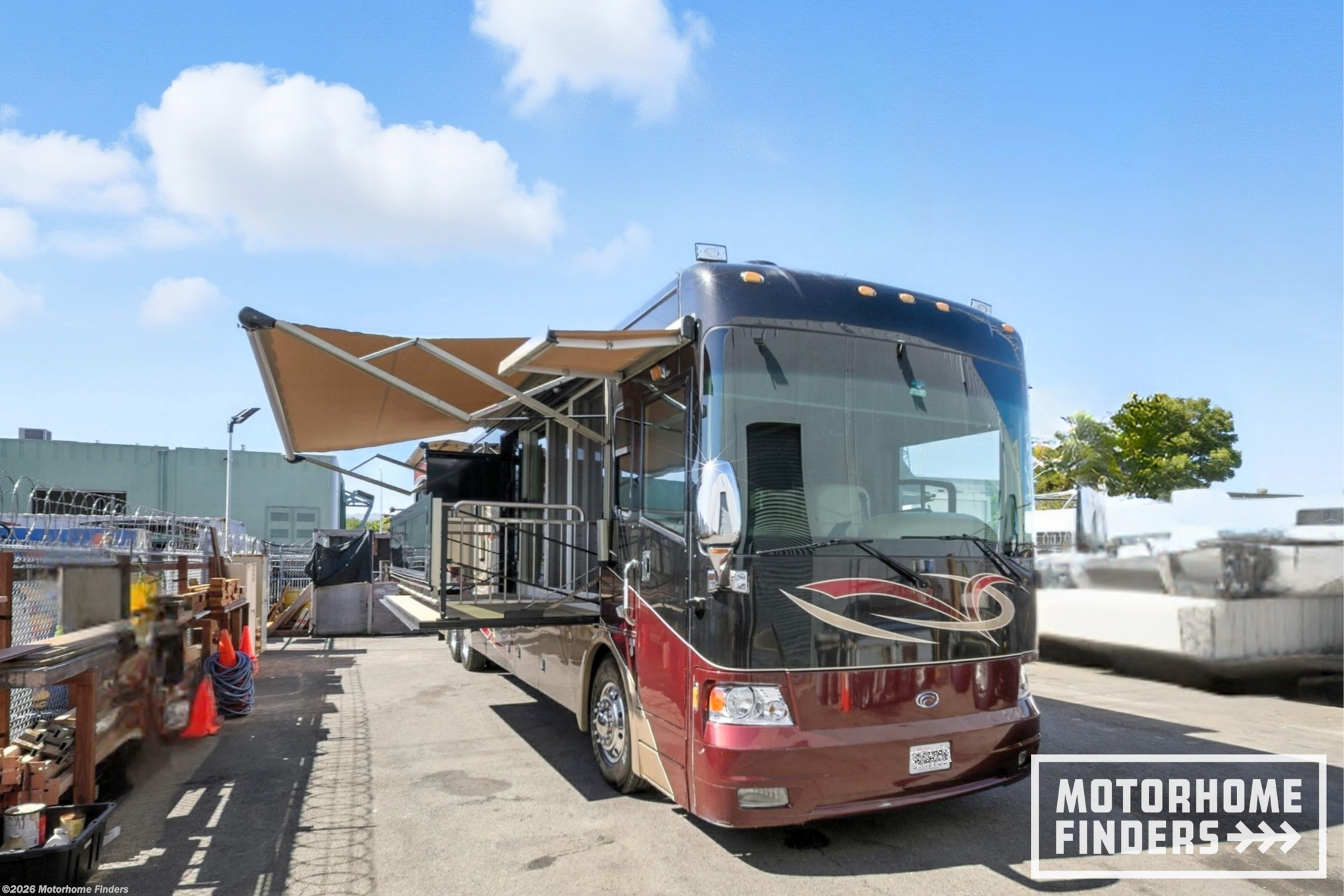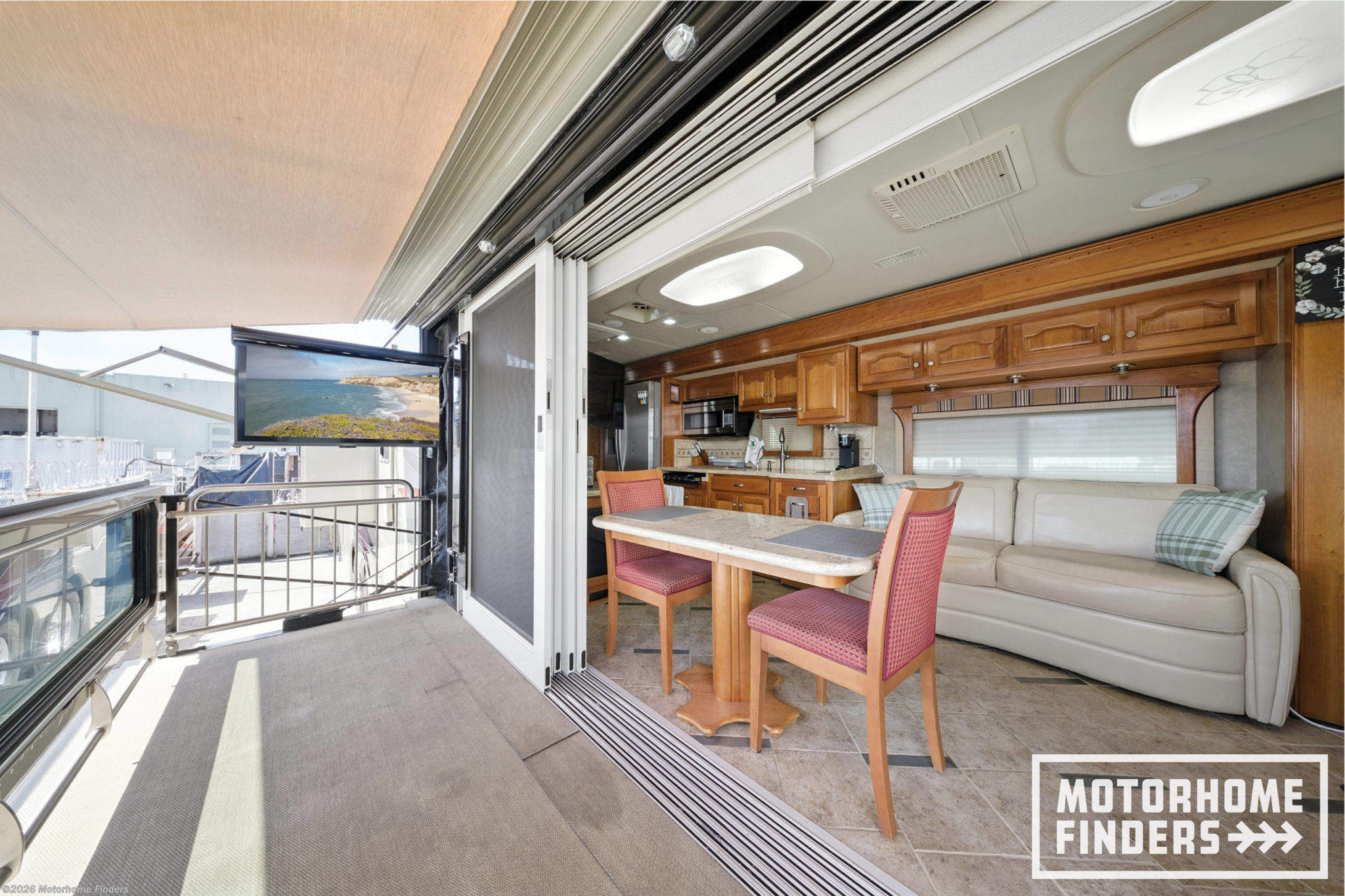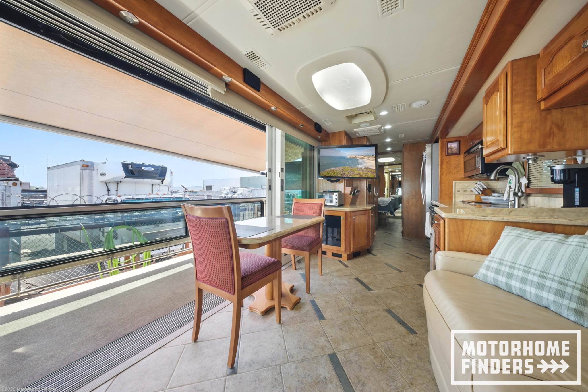 This one-of-a-kind luxury motorhome is one of only 30 built in 2009–2010, making it a true conversation piece wherever you travel. The hallmark feature is the hydraulic drop-down porch—bringing the outdoors in through three hurricane-rated sliding glass doors with screens for unmatched ventilation and panoramic views. Designed for comfort, style, and extended travel, this 43' diesel pusher blends high-end craftsmanship with rare functionality.