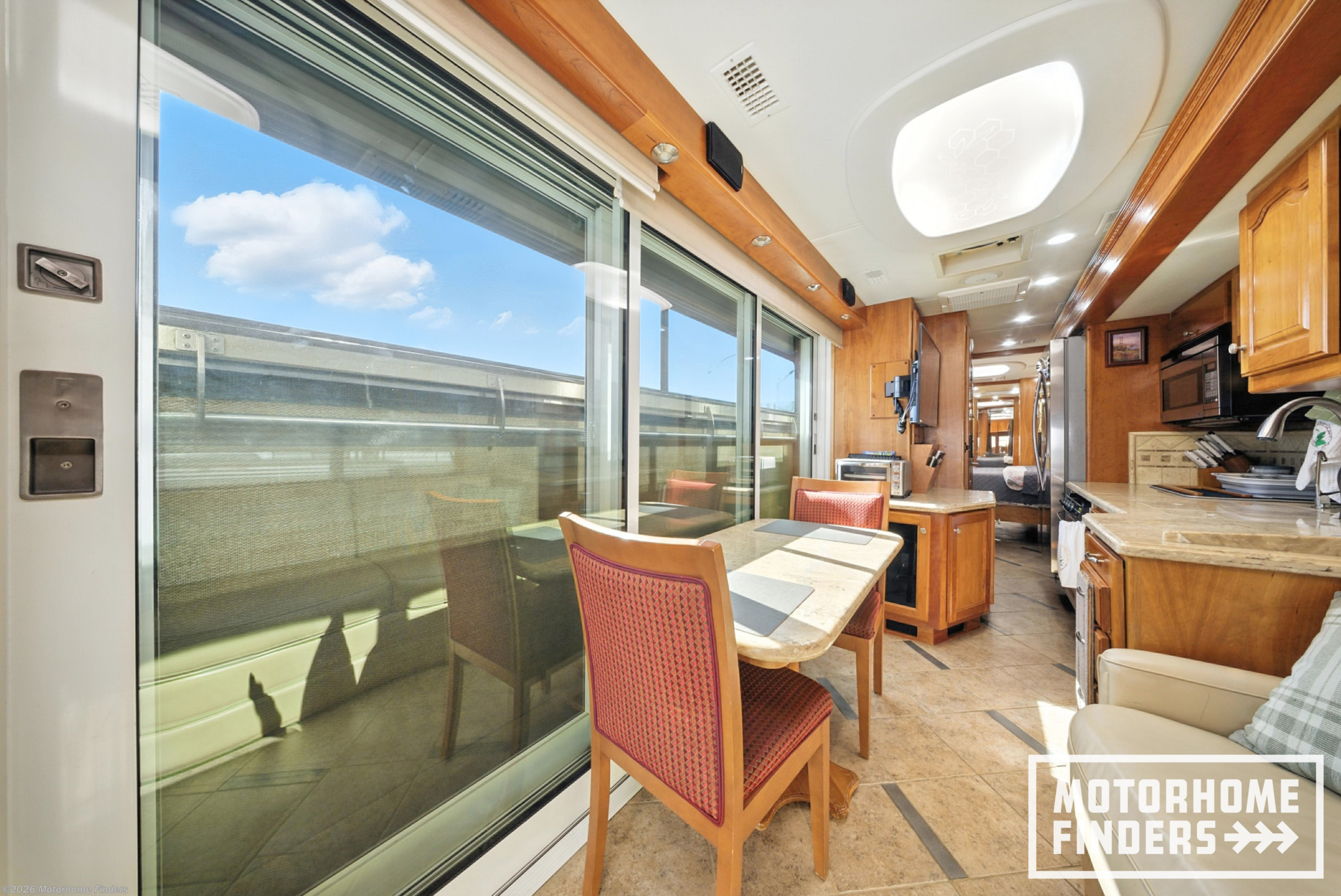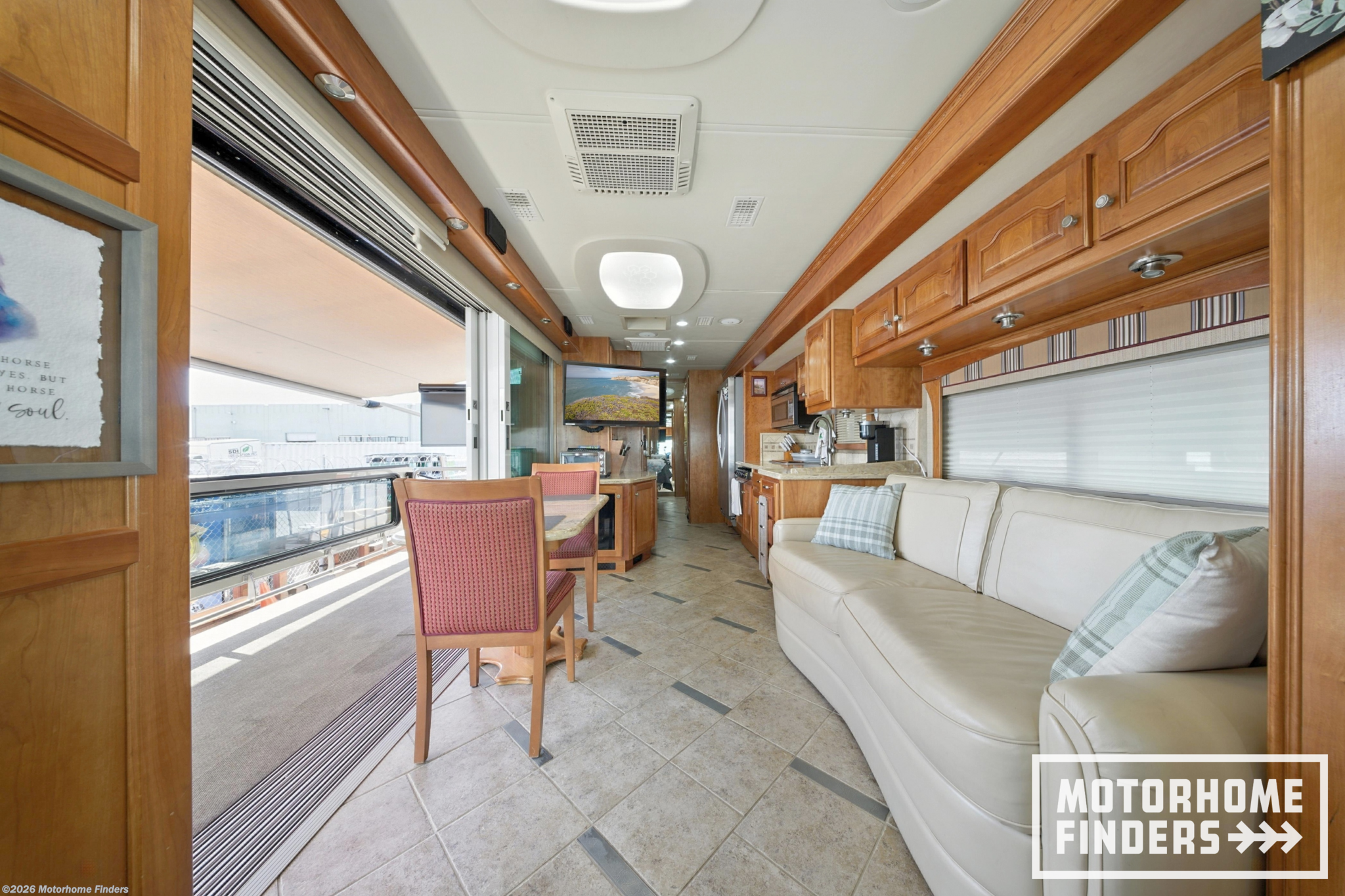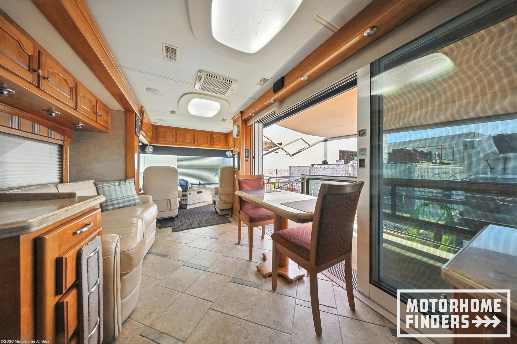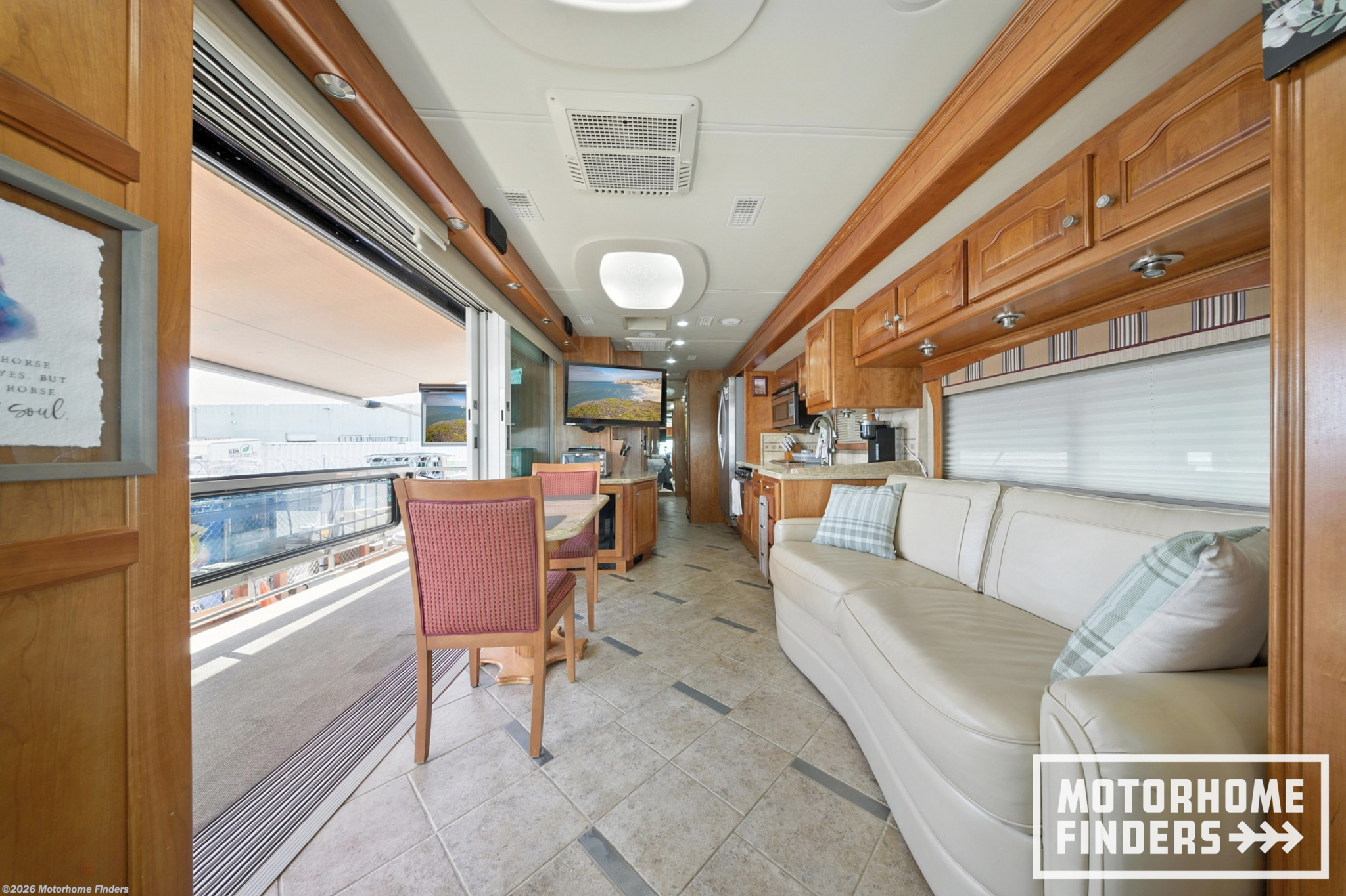 This one-of-a-kind luxury motorhome is one of only 30 built in 2009–2010, making it a true conversation piece wherever you travel. The hallmark feature is the hydraulic drop-down porch—bringing the outdoors in through three hurricane-rated sliding glass doors with screens for unmatched ventilation and panoramic views. Designed for comfort, style, and extended travel, this 43' diesel pusher blends high-end craftsmanship with rare functionality.